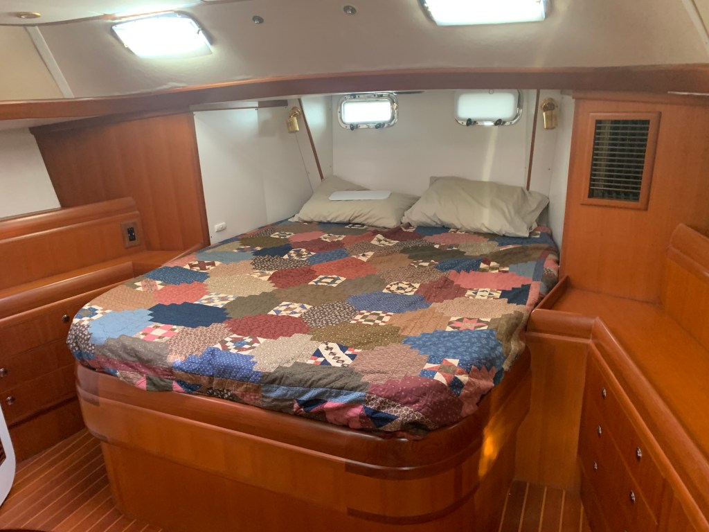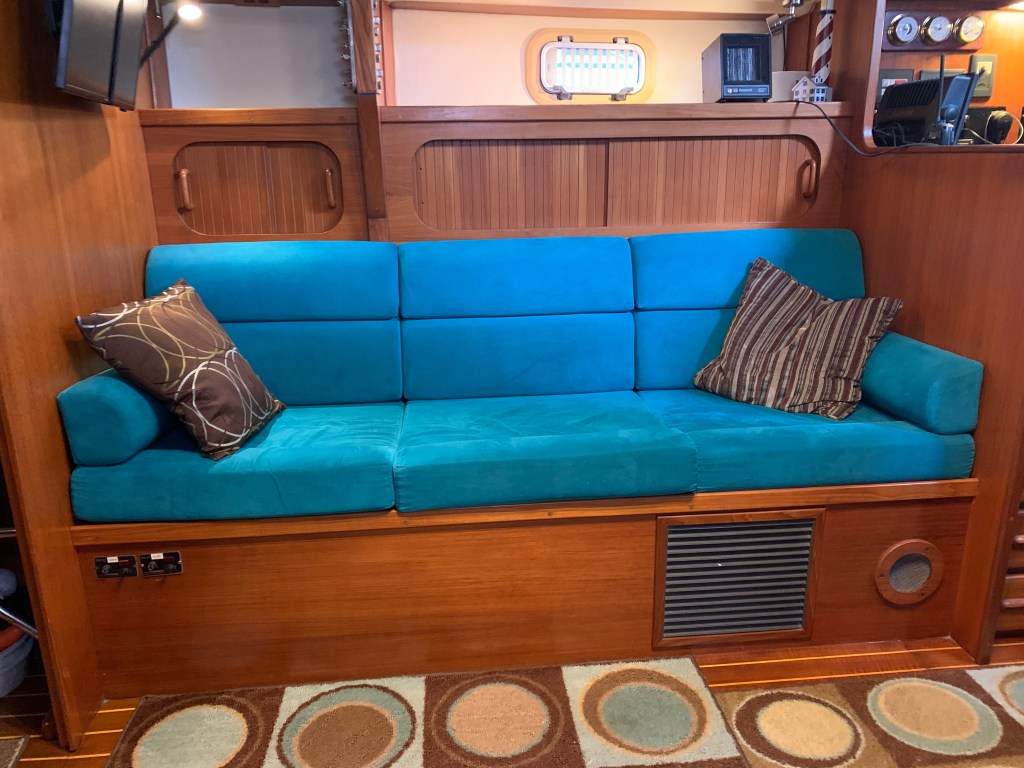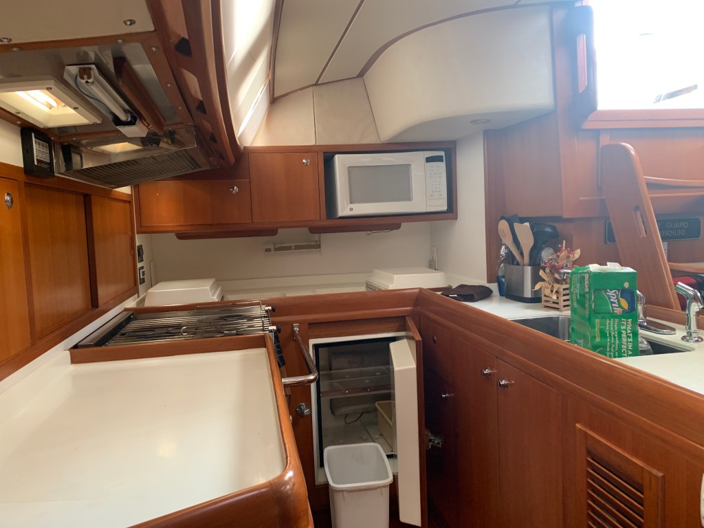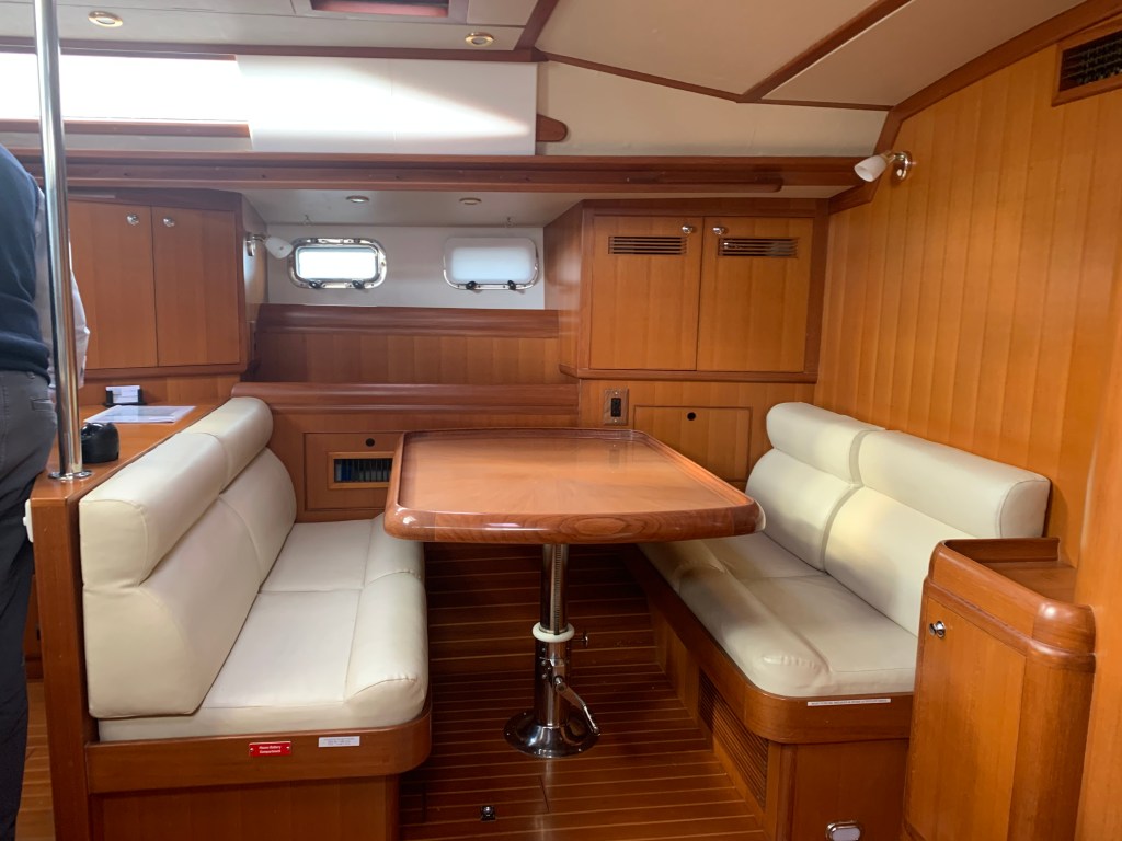 You could not beat the kitchen, I mean it was outrageously beautiful and massive for countertop space. The aft cabin with island queen was spectacular. I really like how the original owner customized the navigation desk and had it built along the port side with map shelves; that was ingenious. For all the space, I thought the table felt more like the diner table from Seinfeld that limits to four people. I’d prefer a U-shape or L-shape seating area, because we like to sit all around the table and play cards and games.