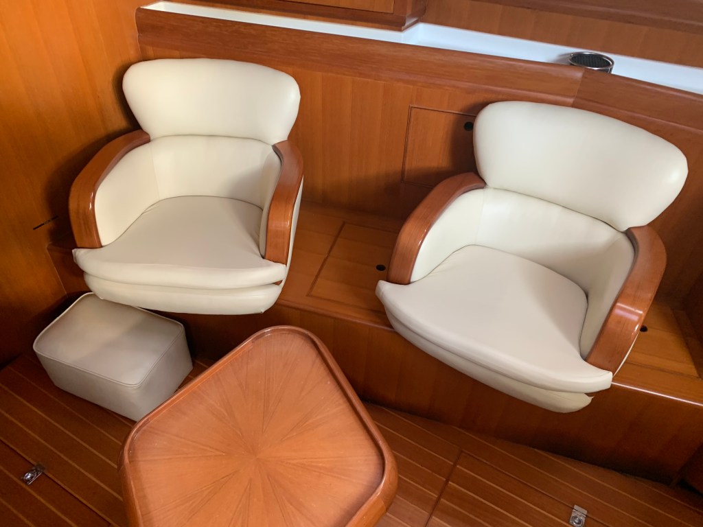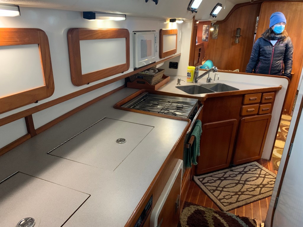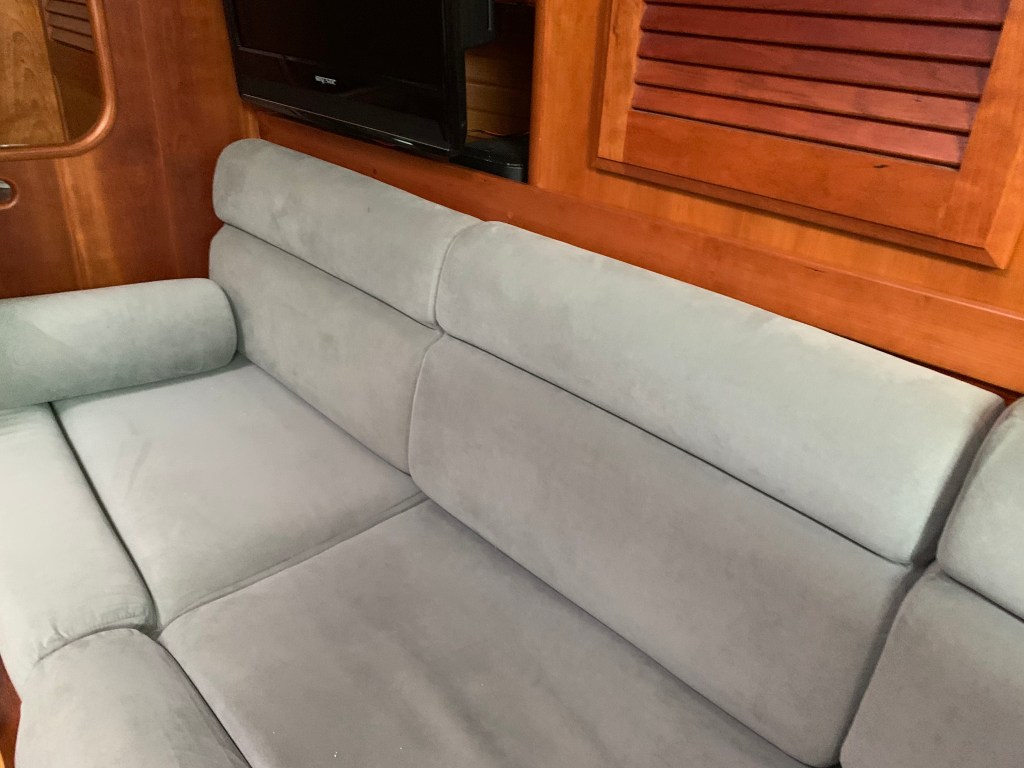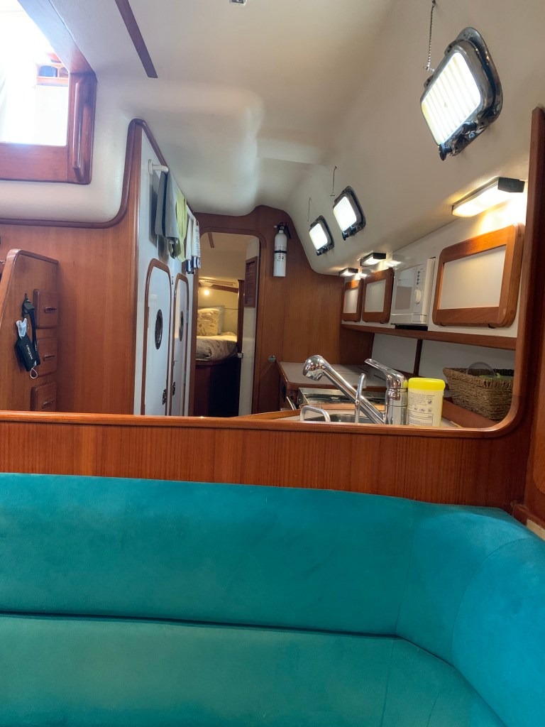You could not beat the kitchen, I mean it was outrageously beautiful and massive for countertop space. The aft cabin with island queen was spectacular. I really like how the original owner customized the navigation desk and had it built along the port side with map shelves; that was ingenious. For all the space, I thought the table felt more like the diner table from Seinfeld that limits to four people. I’d prefer a U-shape or L-shape seating area, because we like to sit all around the table and play cards and games.