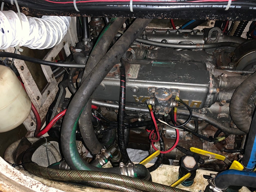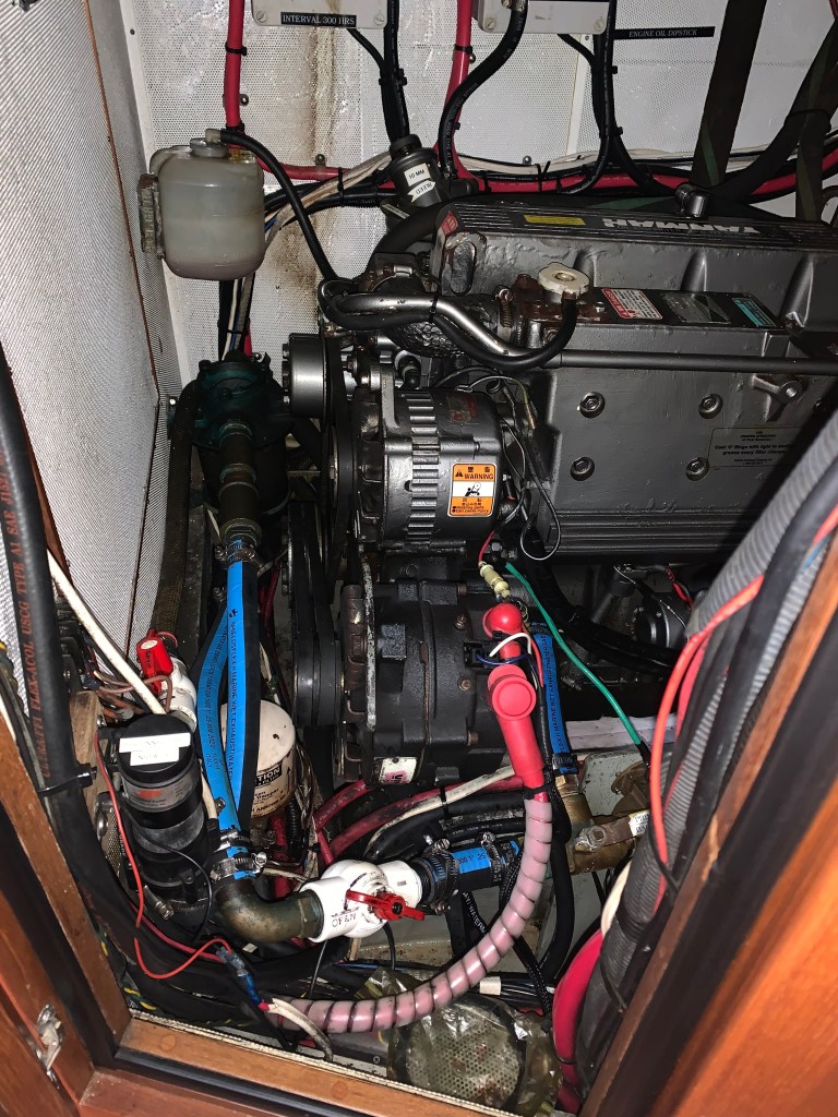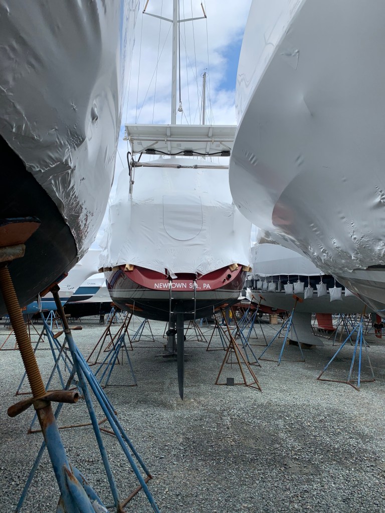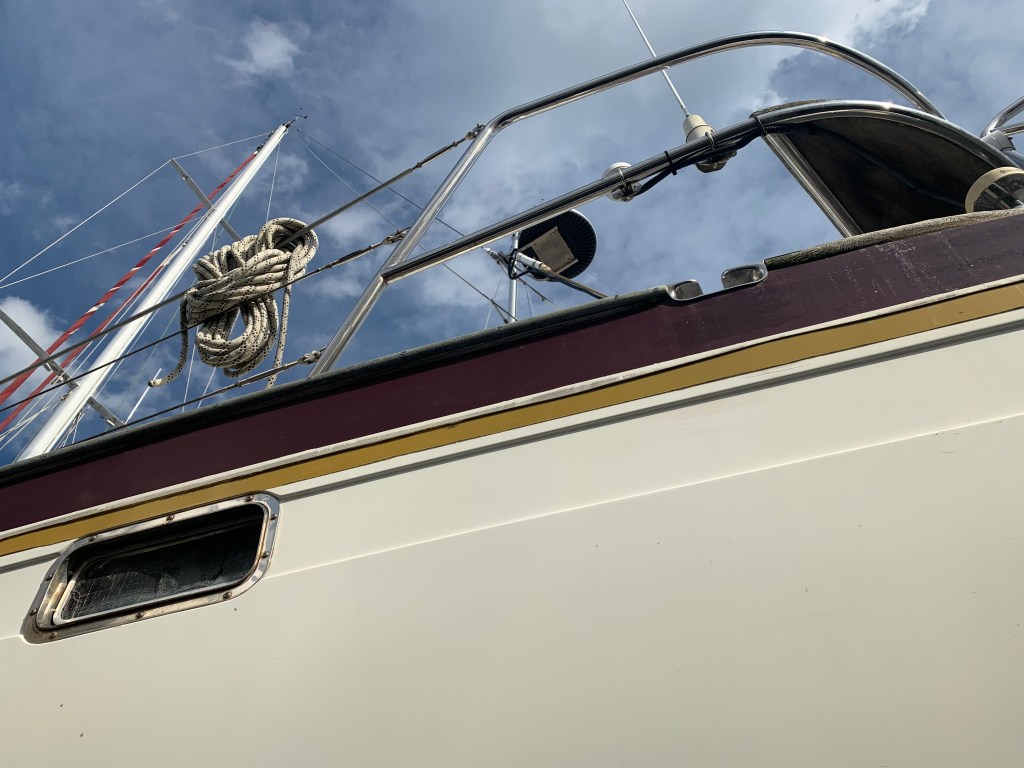This was our first center cockpit sailboat. And it did not disappoint at the helm. Sure, it was on the hard for Winter, but looking out over the foredeck seemed like we were looking at a runway. I hated the plasticky dodger setup, I mean, I really hated it. I wanted to rip it out and install a hard dodger immediately; it felt cheap and didn’t match the high quality of the workmanship in the cabin. This was an impressive boat on top and inside. The engine access was fantastic. The boat does not appear to be highly maintained in its current state; the hull needs a lot of work on the starboard side.