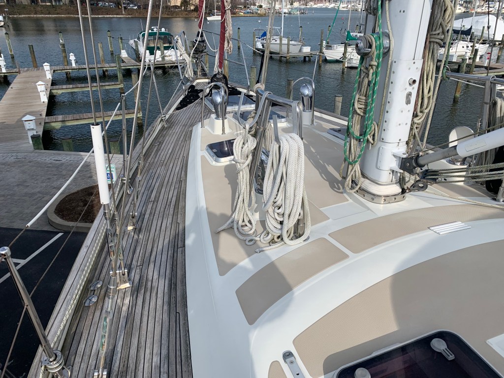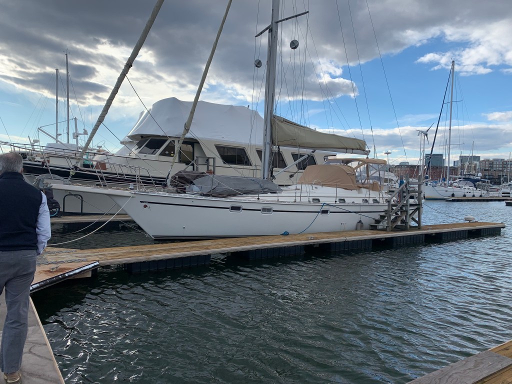 The owners spent a lot of money on a new cockpit dodger and wrap around canvas; it was well done. The inside of the boat didn’t sparkle for us. The wind coming off the Baltimore harbor at Anchorage Marina was whipping up, so we didn’t want to spend too much time on the deck, but I liked having less teak. The engine didn’t shine very well, but the supporting systems look to be relatively new and in good working condition. The starboard settee was nice and long, and I think I could have laid down for a comfortable rest at sea. The cabin woodwork was not up to the same standards as the Taswell or Sabre.