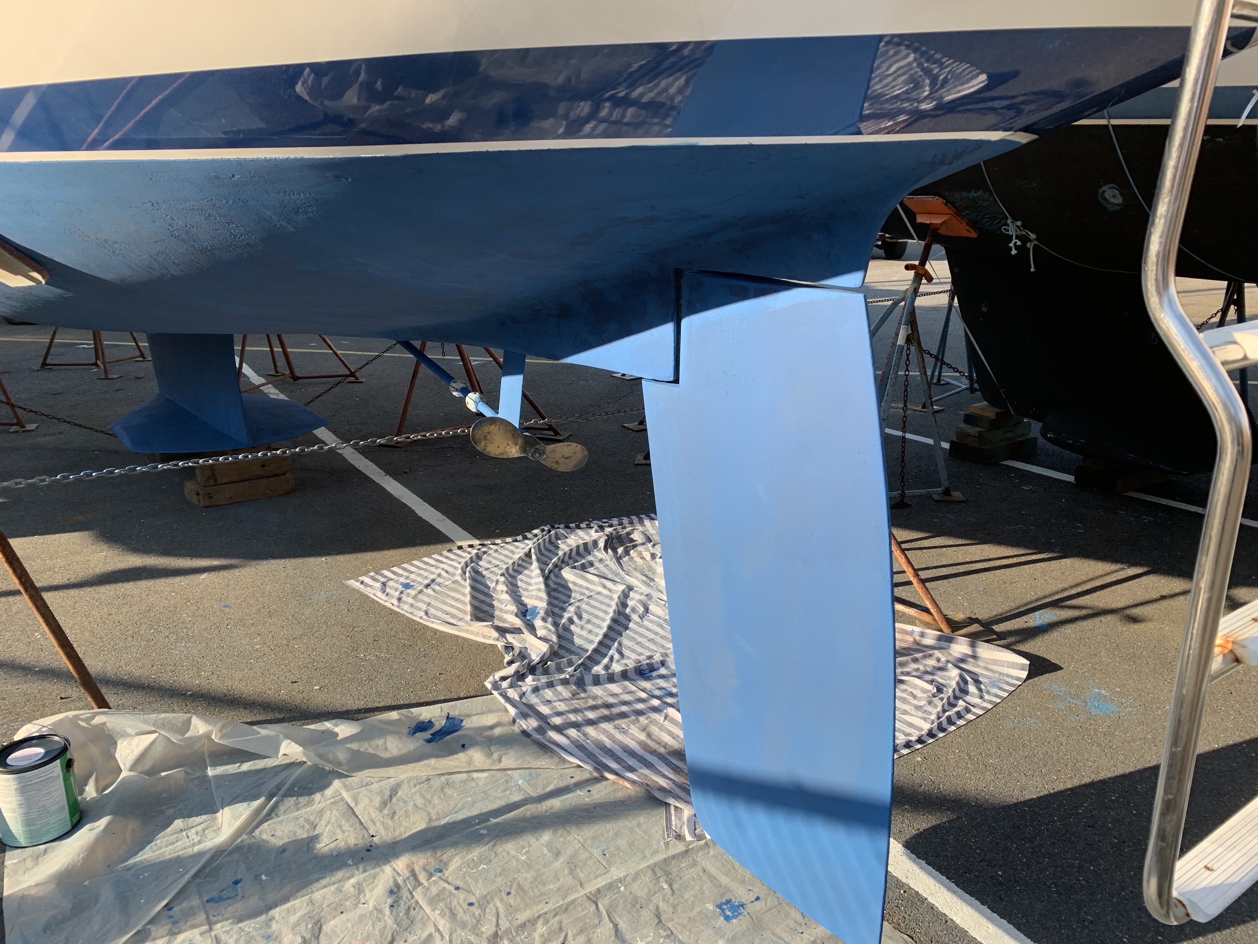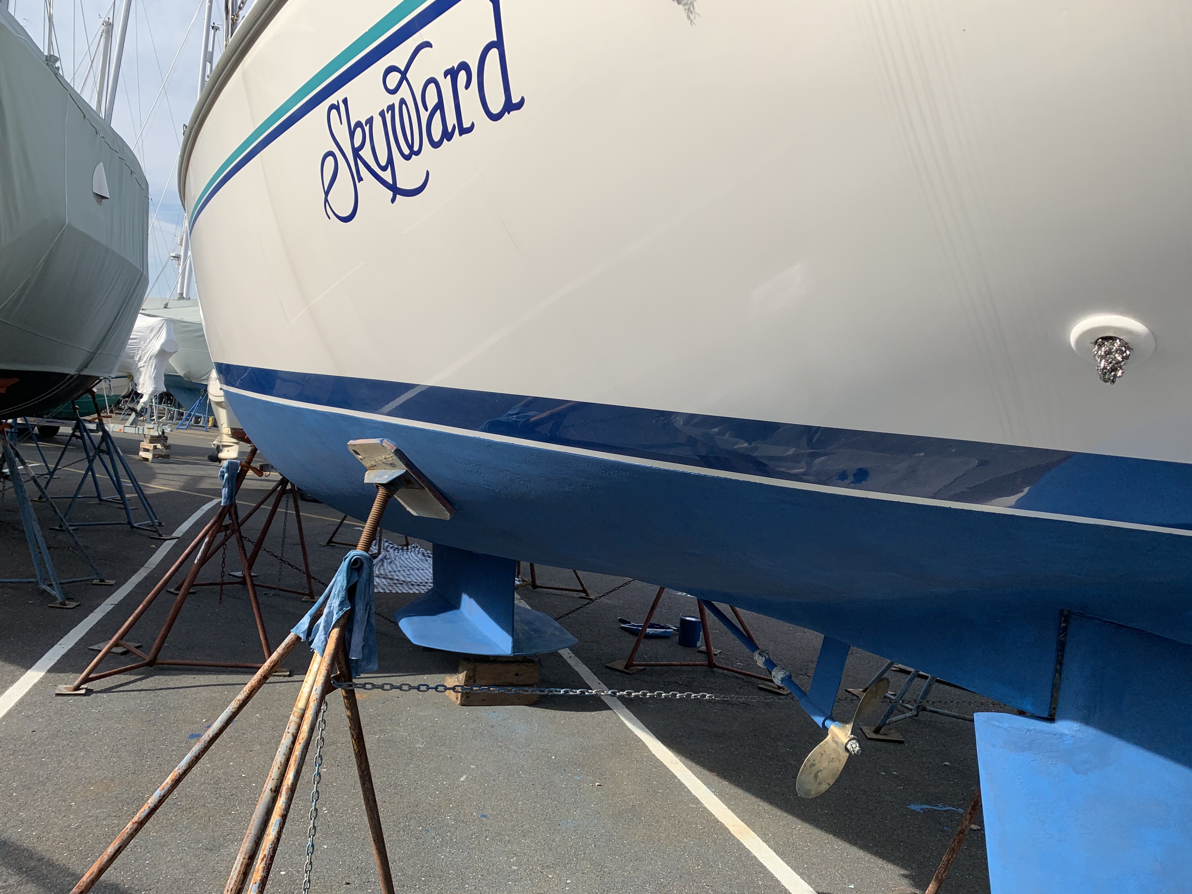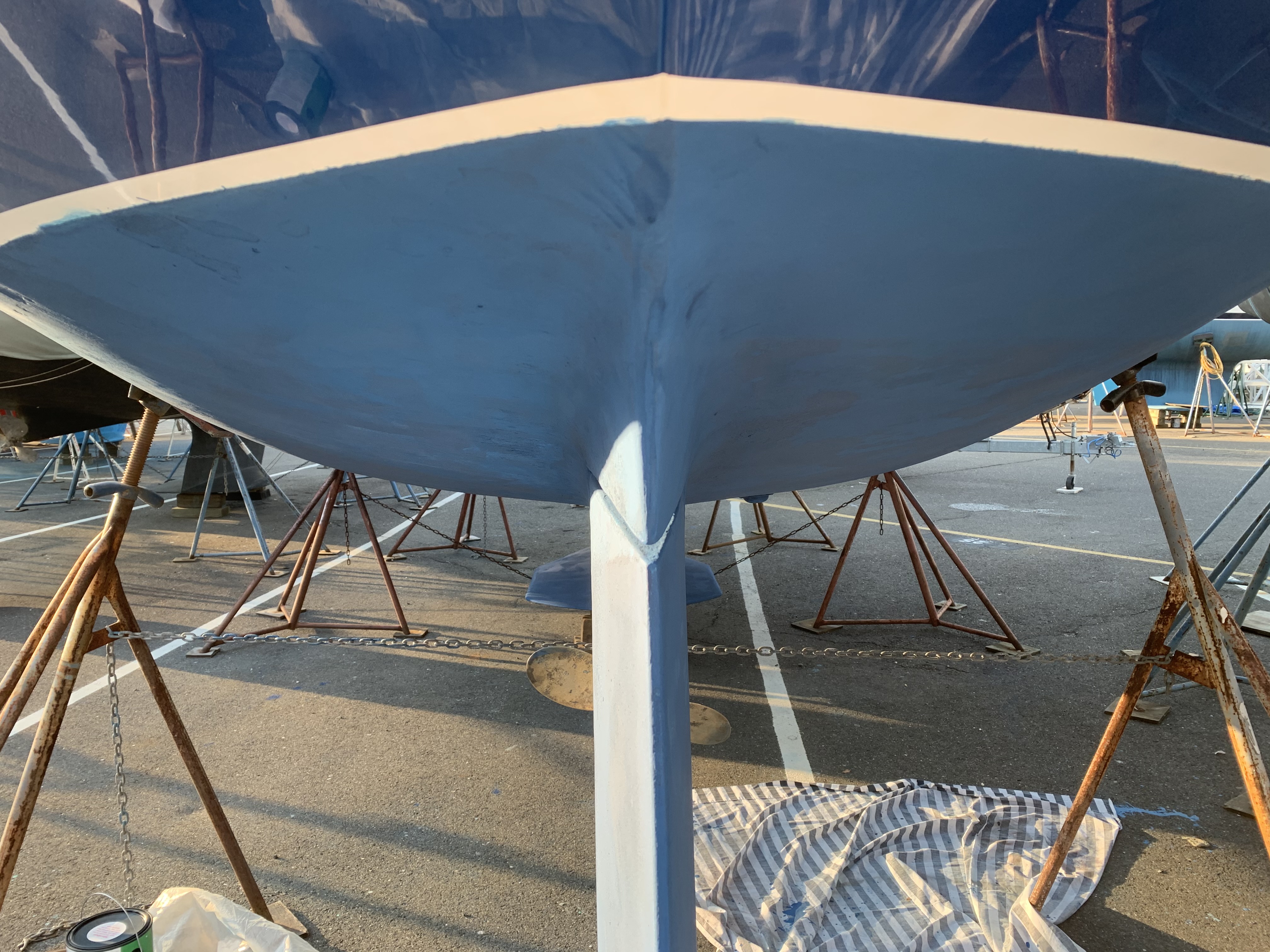 Meanwhile, I have been working hard to get Skyward ready for the season. It is for sale, but we just sold it! Here you see the new bottom paint after a light sanding.