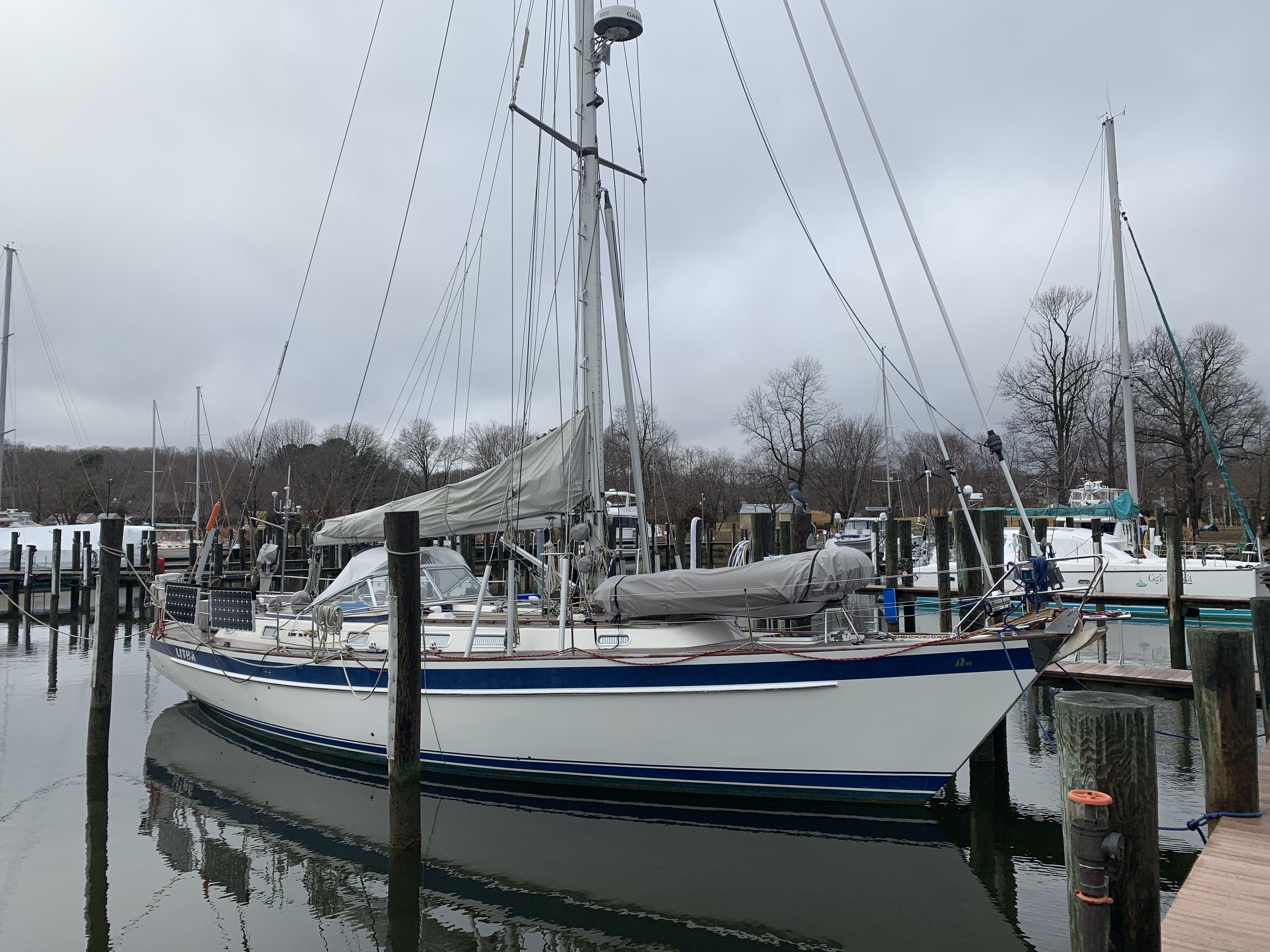 First up is a 1997 Hallberg-Rassy 46 – let’s call it King Kong. This is a well-maintained boat originally named Nike and sailed in Northern Europe. The boat was renamed in about 2006 and sailed in the Northwest region for a few years before transiting the Panama Canal and then sailed into Annapolis where the boat was put on the hard from 2011 to 2017. In October 2017, Litha was purchased by the current owner and docked in Herrington Harbour South.