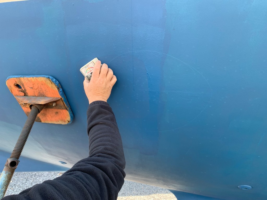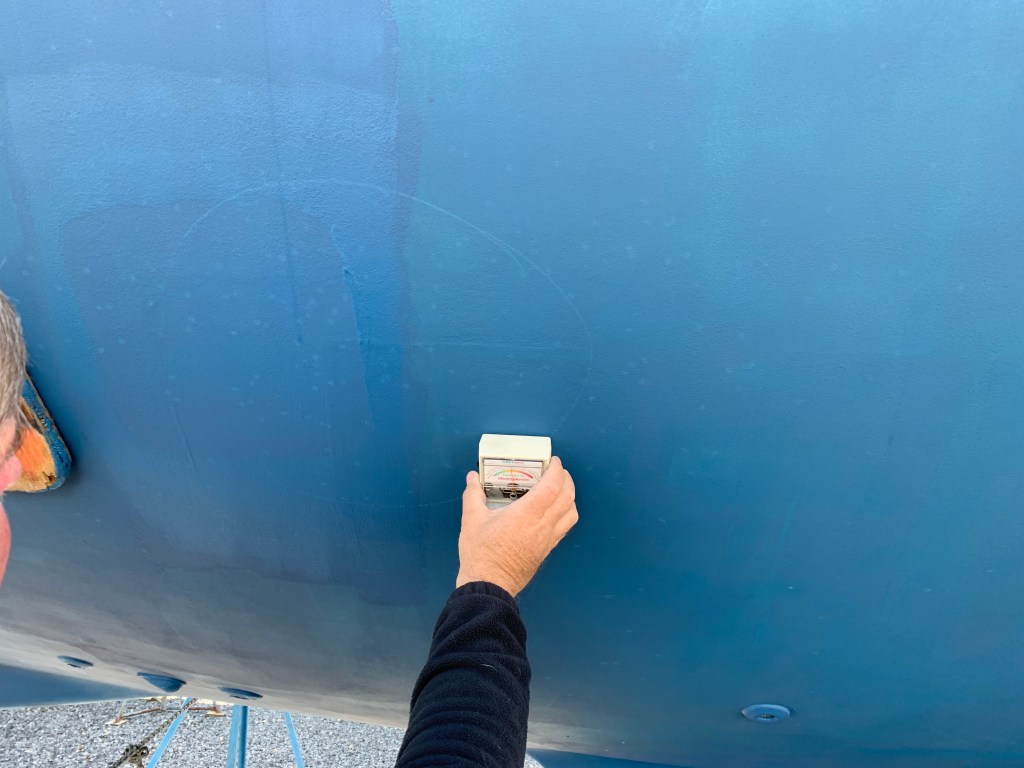 It’s bright and sunny. But none of that matters, because we’re getting down to business starting with hull and topside survey. The boat is at Herrington Harbour North where there is a West Marine and almost any kind of sailboat contractor onsite.