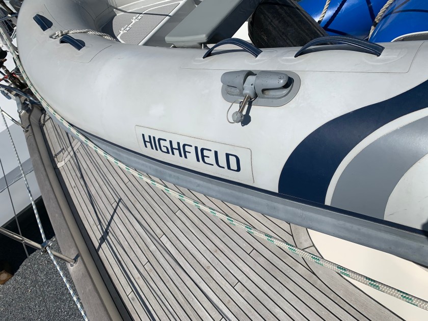Transom showing the dinghy engine on the mount, the Wind Pilot Pacific Plus wind vane and the life buoy