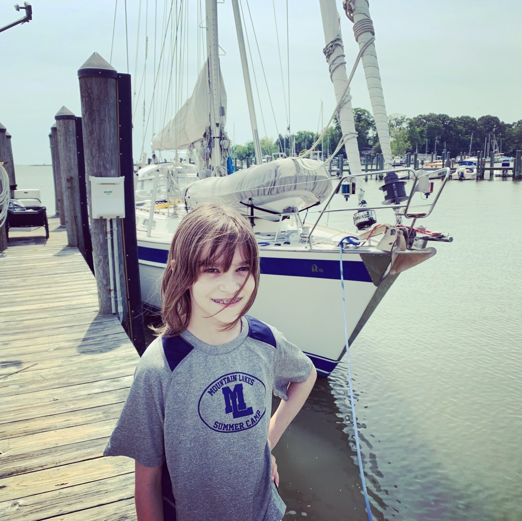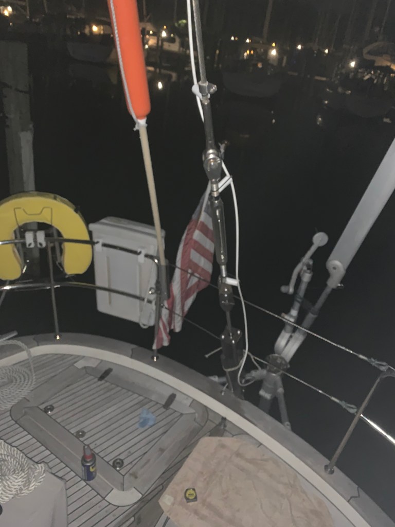 I had to figure out how to pull down with enough force on the backstay so that she could help me pin it at the base. We did it in the dark at the dock with headlights on. The neighbors probably thought we were crazy on a Friday night working on the boat. It works like a charm! Then we took a fun dad & daughter walk through the Herrington Harbour South resort and beach.