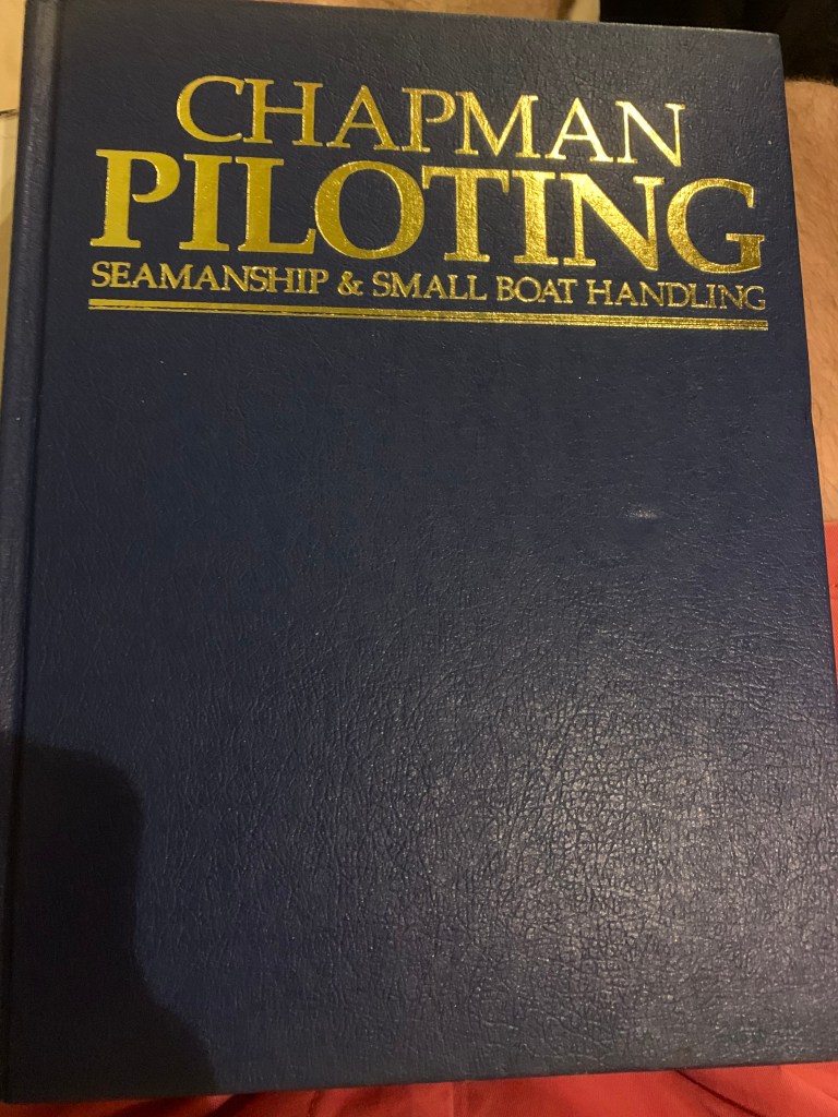 I can’t pass up this story. Way back when, my dad “gave” me a book about sailing and boating. It was an encyclopedia and a nice thick hard cover. I kept that book forever in all of our moves from across the country. Since we recently started to sail, I have looked high and low for this book. Every other month, I’d get the gumption to go looking again in all of our boxes and book shelves. No luck. I came to the conclusion that we thinned out our book collection during one of the moves and that I’d never see it again. What was the name, you ask? I couldn’t for the life of me remember, but I knew it was navy blue and had gold foil lettering on it. In my late night exploration of the boat, look at what I found: