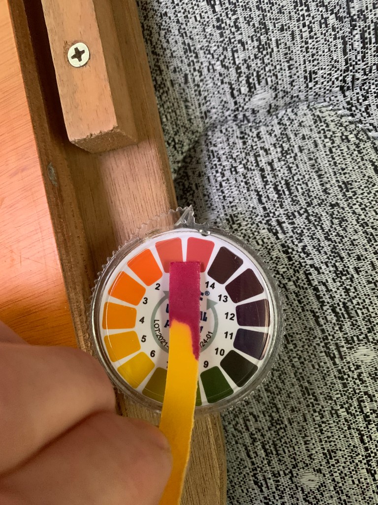 I spend the rest of the night digging through our aft cabin lockers and seeing more of what has been left behind. Then I realize that I never checked the batteries. We were told in the survey that the batteries seemed to be off-gassing. It had me curious, so I bought some old-school pH paper to test the standing water on the top of our lead acid batteries.
