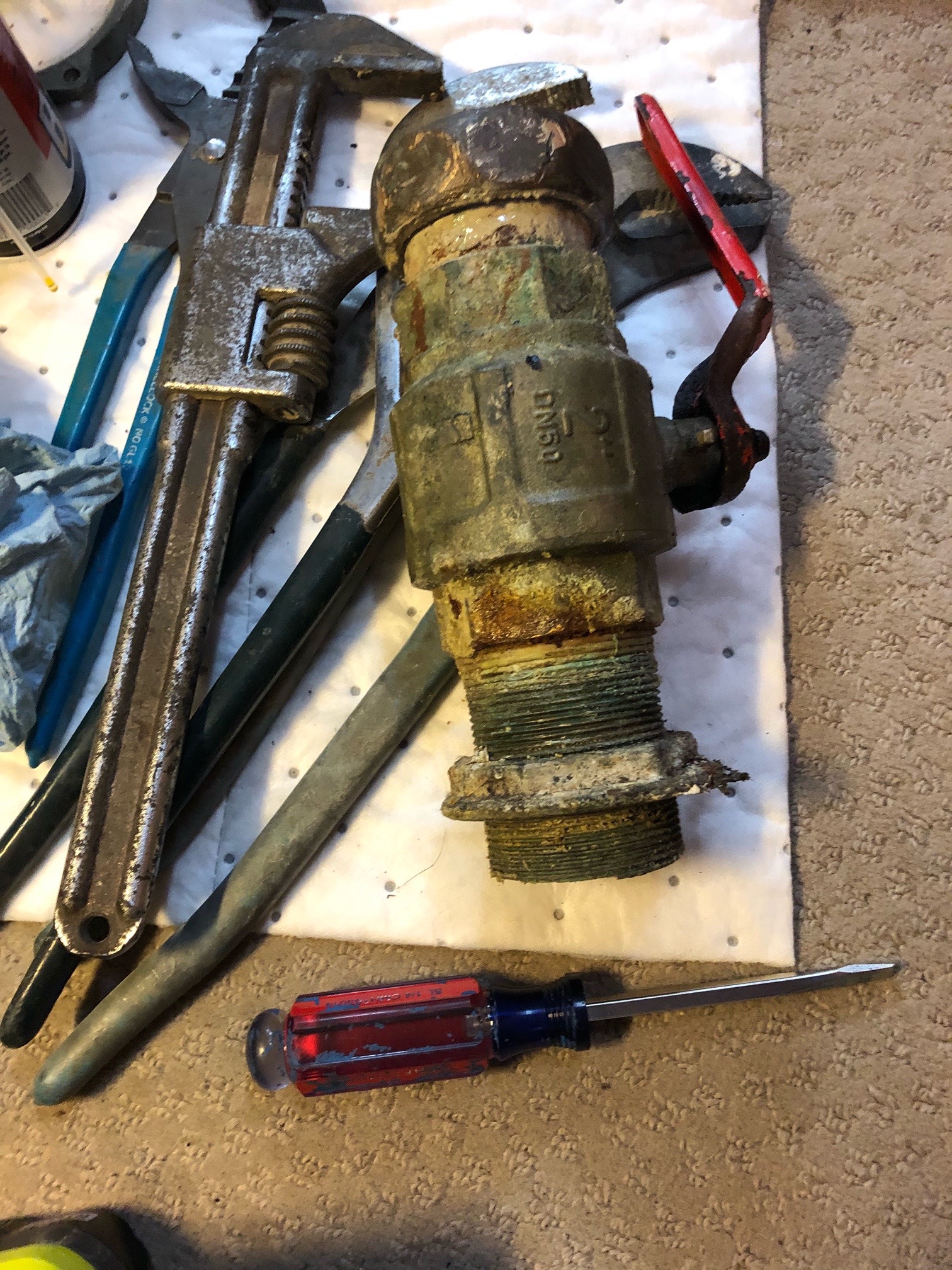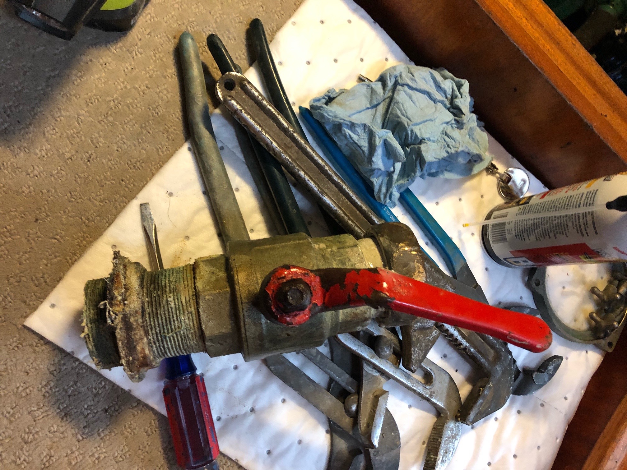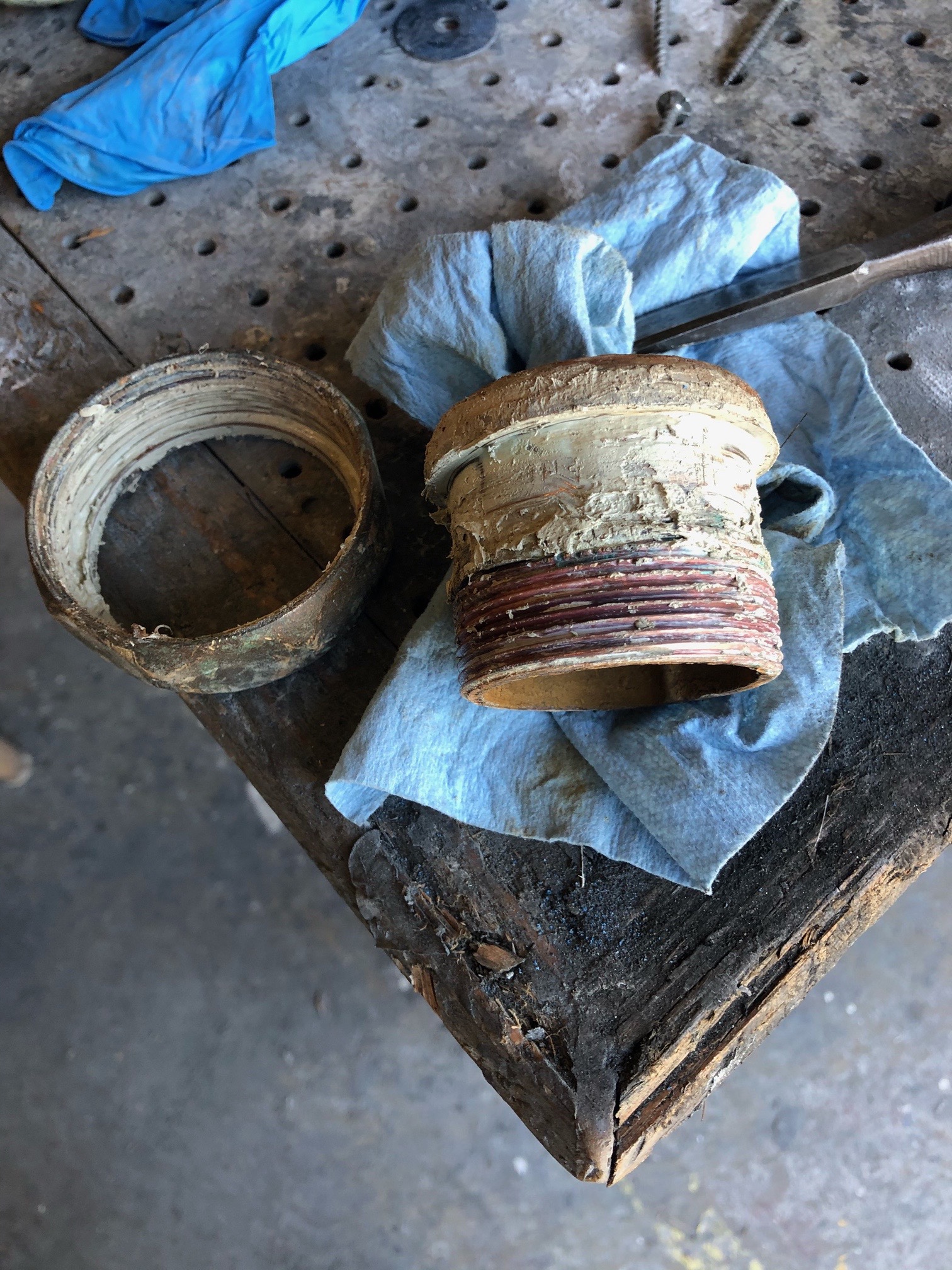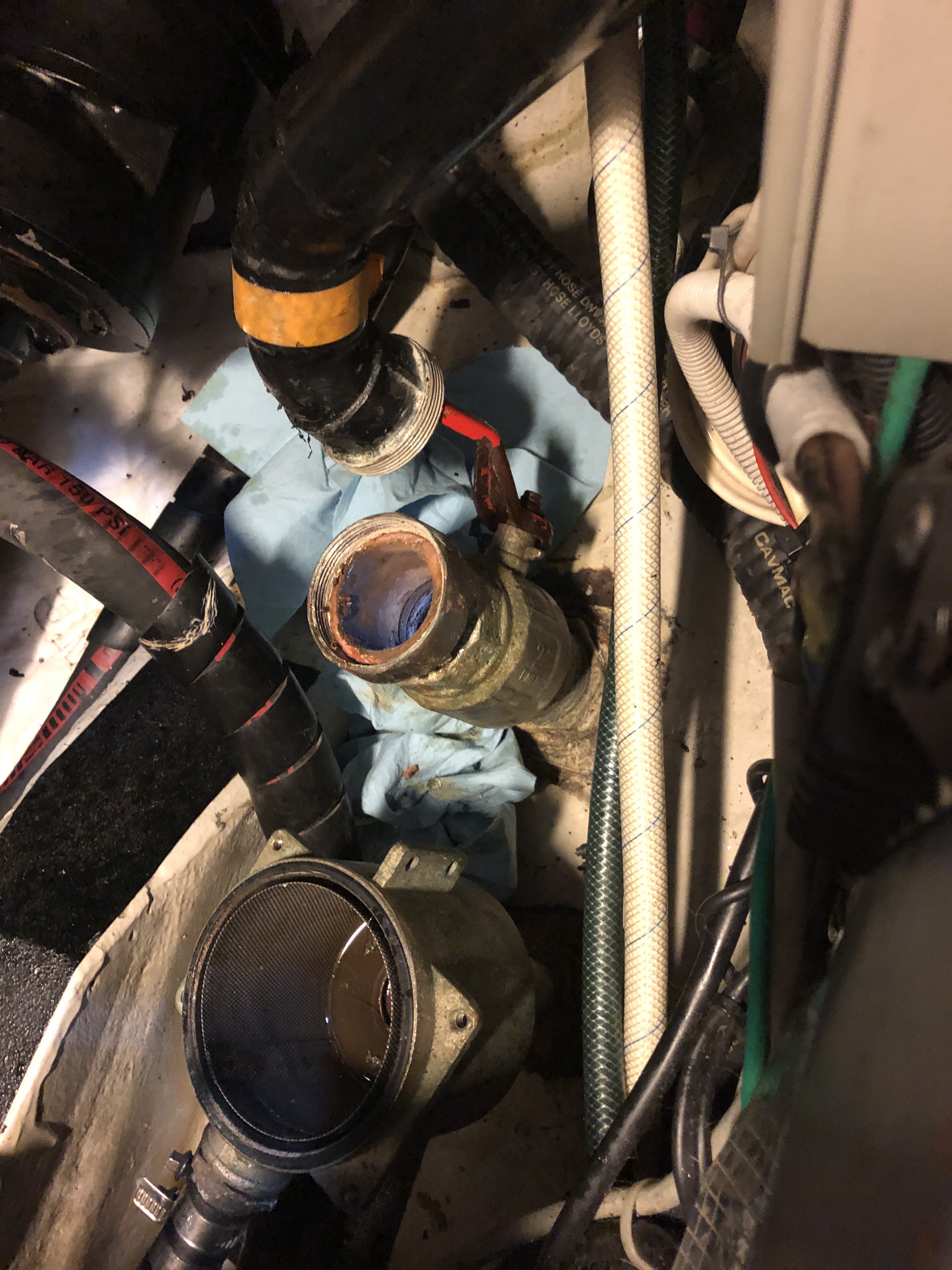 When the boat got hauled out on Tuesday, Ray was right there with big wrenches in-hand to take apart the thru hull. And yes, Ken and Ray were both right, we have some definite work to do on our thru hulls.