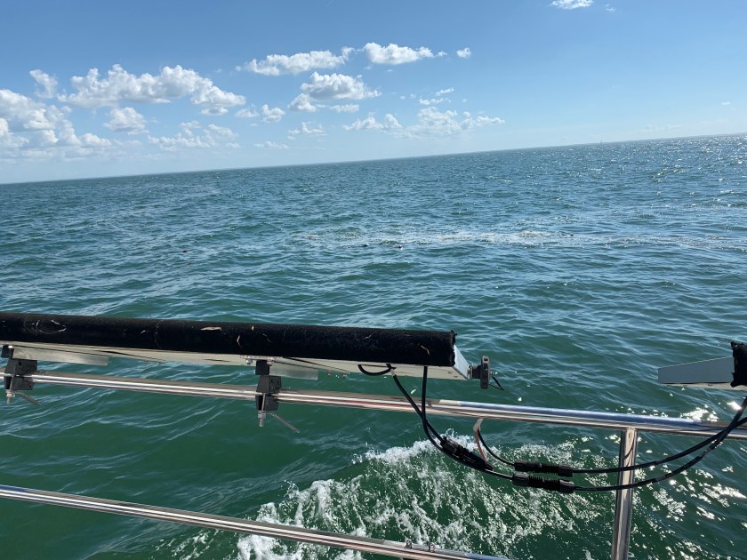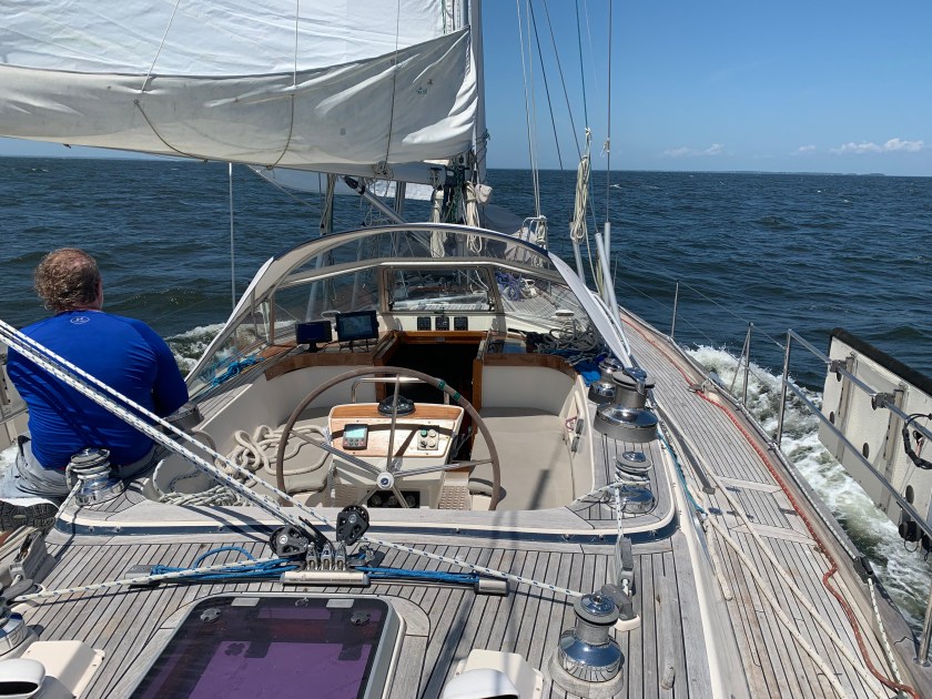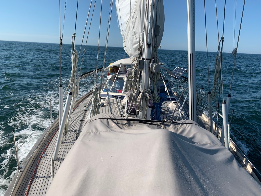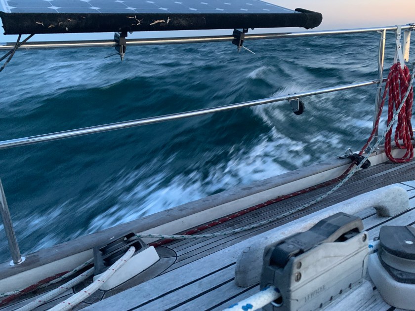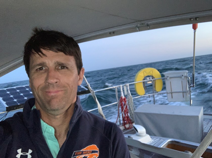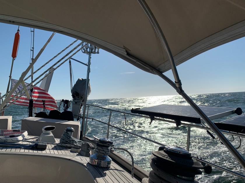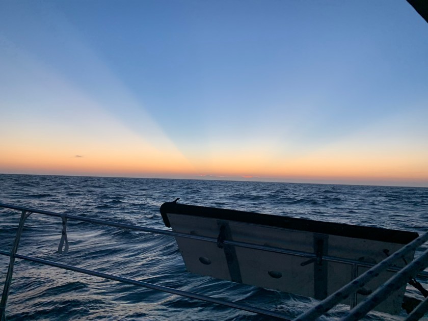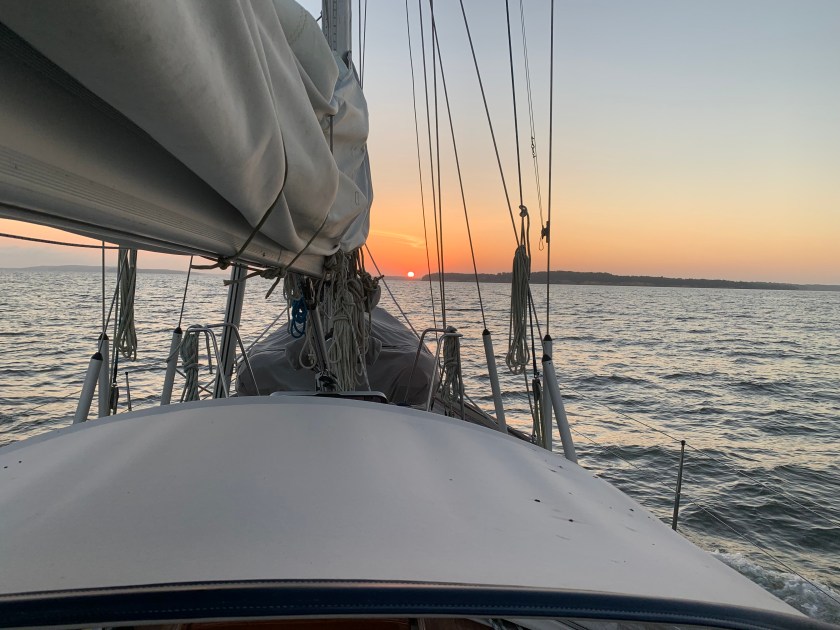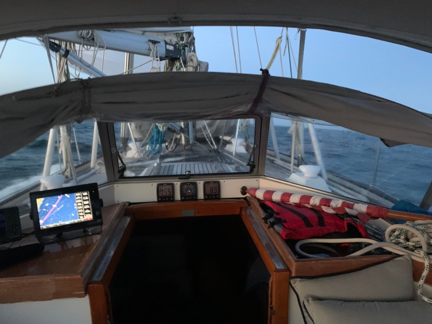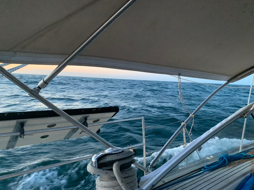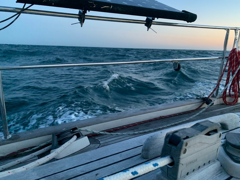 We that was the daytime. Soon we were rounding Cape May and began the next chapter of the journey up the NJ coast. That began with an elegant sunset and some light winds from the South. We maintained a sail angle 120 degrees and headed about 20 nm offshore. The seas were between 4-6 feet with swells and chop with the occasional breaker above 6 feet.