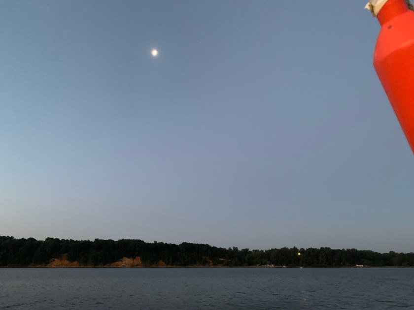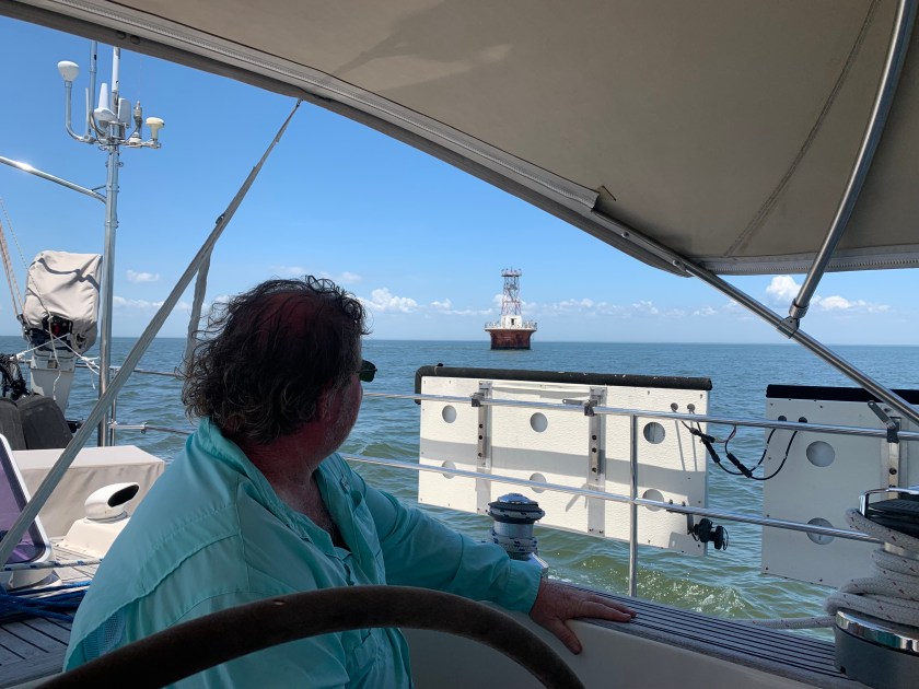 We woke up the next morning to a gorgeous sunrise, and we headed directly to the start of the C&D Canal. We did not stop in Chesapeake City, but as we past it we were trying to decide where and how we would have stayed there overnight given how small the anchorage looks. Nonetheless, we motored and motored until we got to the Delaware, and then we motored more. The wind started to kick up, so we pulled out the sails and watched the sparse landmarks pass us by slowly. In one case, we saw dozens of horshoe crabs floating vertically.