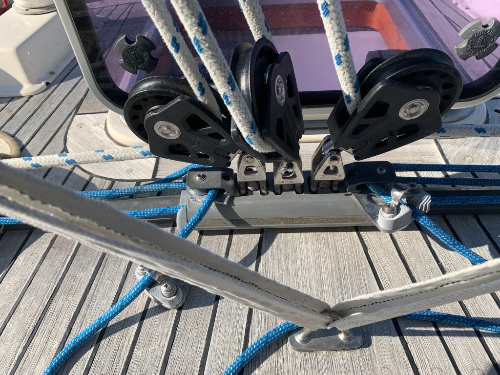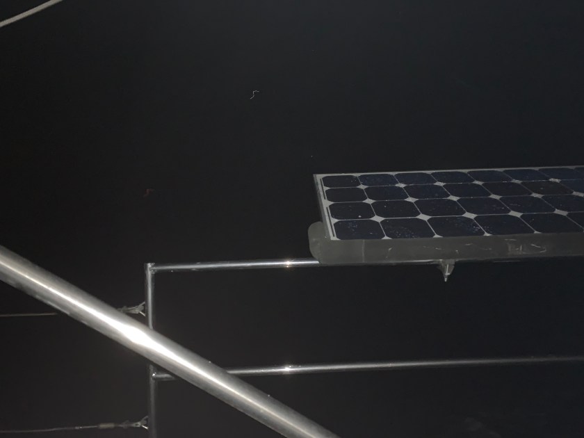 We discovered that our 24v batteries were not charging which means that almost all of the boat’s electrical systems were drawing off more electricity than the engine regulator was producing. We had to conserve battery levels with a 10% drop every 8 hours or so. This meant that the autopilot had to be shut off, and we hand steered the boat fot the next 20+ hours straight. When the sun went down, there was no moonlight right away, and the instruments were almost dark. They needed to be adjusted but everyone was napping, and I was driving the boat alone. I could not see the vital information that I use when steering such as wind angle, and this partly contributed to a substantial and accidental jibe of the main. This caused some damage which we did not see until much later in the trip.