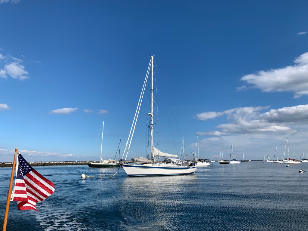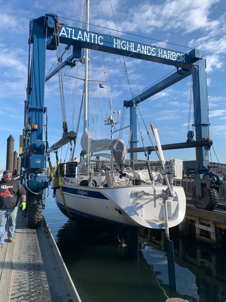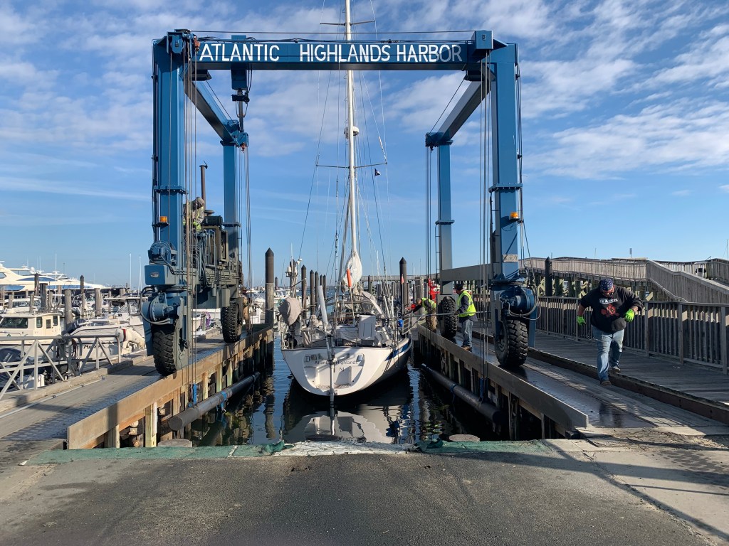 We got tied up and the leader of the crew kept hammering us with these statements which we had no clue what he was talking about. He explained that the Atlantic Highlands lift doesn’t have the ability to lift our boat out of the water without removing the backstay and taking down our antenna pole — and — coming in backwards. We were trying to get over the shock of a plan just falling completely apart, when they offered to try to lift us out without removal of the antenna pole or backstay. BUT, we had to back the boat into the bay.