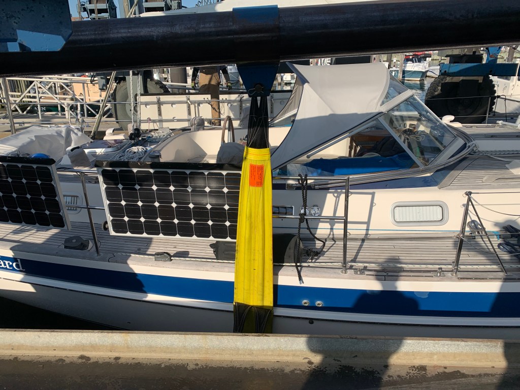 Once we got into the bay safely, the crew set to work placing the lift in the right spot. You can see that they could not get the boat fully out of the water without the backstay hitting the rear of the Travelift.