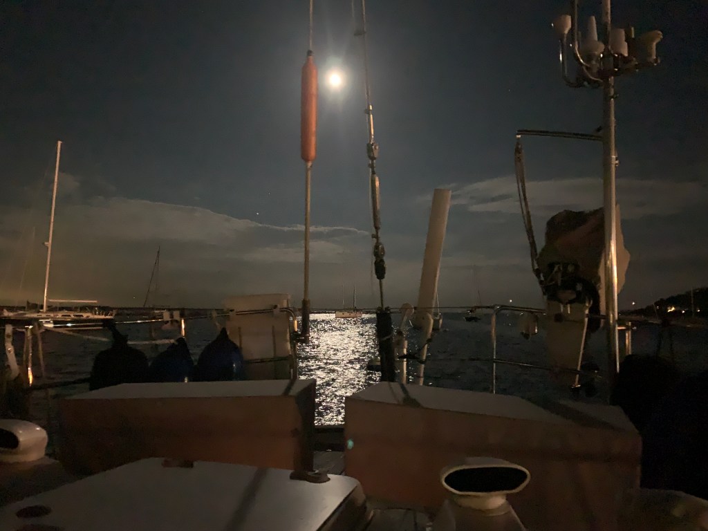 We wanted to spend a relatively quiet night on the mooring so that we could get a jump start early on Saturday to go as far up the Hudson as possible. That was the plan, so we loaded up food and kids (and Grandma) and headed down to Atlantic Highlands. Atlantic Highlands is a great spot to be on a mooring for most of the time so long as there isn’t a strong N, NE, or E wind. We played quite a few games of golf sitting in the cockpit while we watched the moon rise.