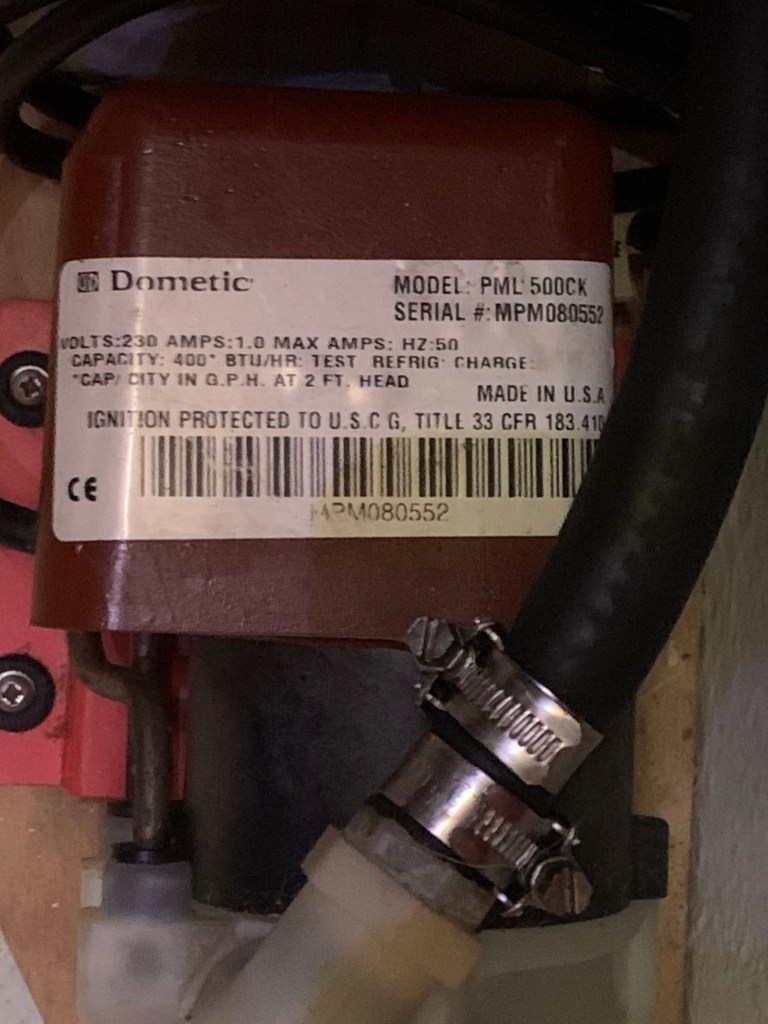 - Tried to remove the pump discharge tubing at the point where it connects to the condenser inlet. Had to tank off the rectangular air conditioner grill below the settee to access this. The tubing seems to be fused onto the condenser inlet and no amount of force could be applied to remove the line without damaging or destroying the tubing. That was not successful.