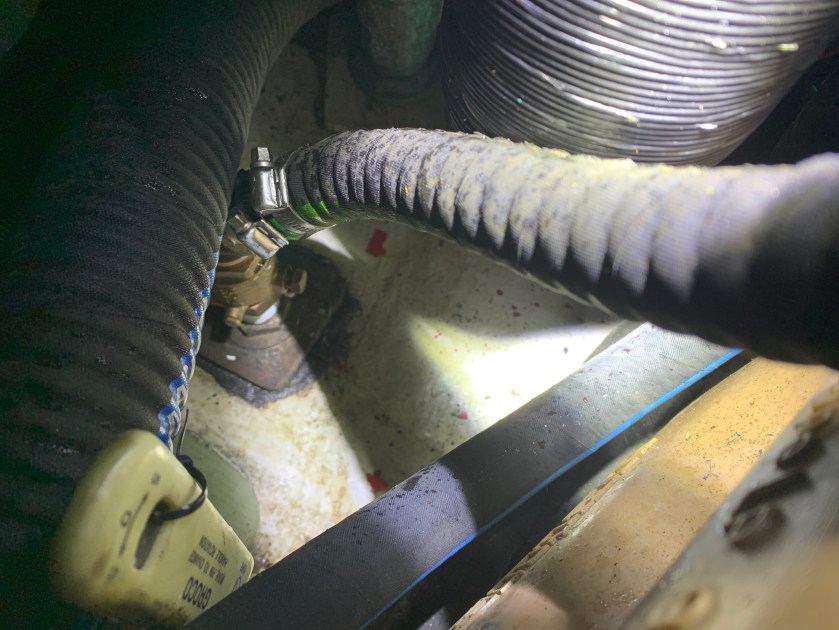But if I am honest, the engine compartment of our HR46 is my least favorite place on the boat. That’s why I’m spending so much time talking about it. I’m a neat freak which comes with the territory of being a Lean Six Sigma Black Belt. Here’s why: 1) It seems that previous owners for almost the entire 24 year history of the boat did none ofd their own mechanical work. For the most part, these owners never their hands dirty and dealt with the poor maintainability of bad installations. They elected to pay contractors to install or fix the majority of the equipment. This resulted in disorganization of lines and routings and poorly thought through installations. 2) There is simply a lot jammed into that small space — heaters, generator, inverters, 4 pumps, multiple filters, 8 thru-hulls, etc and 3) It is very dark with poor lighting.