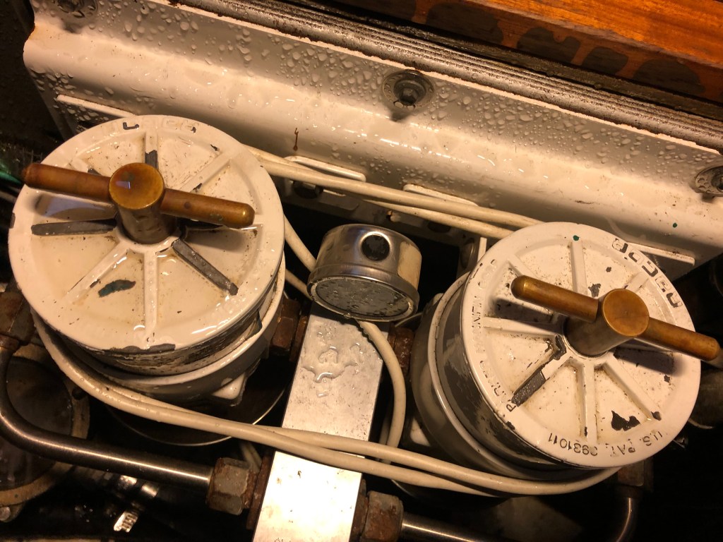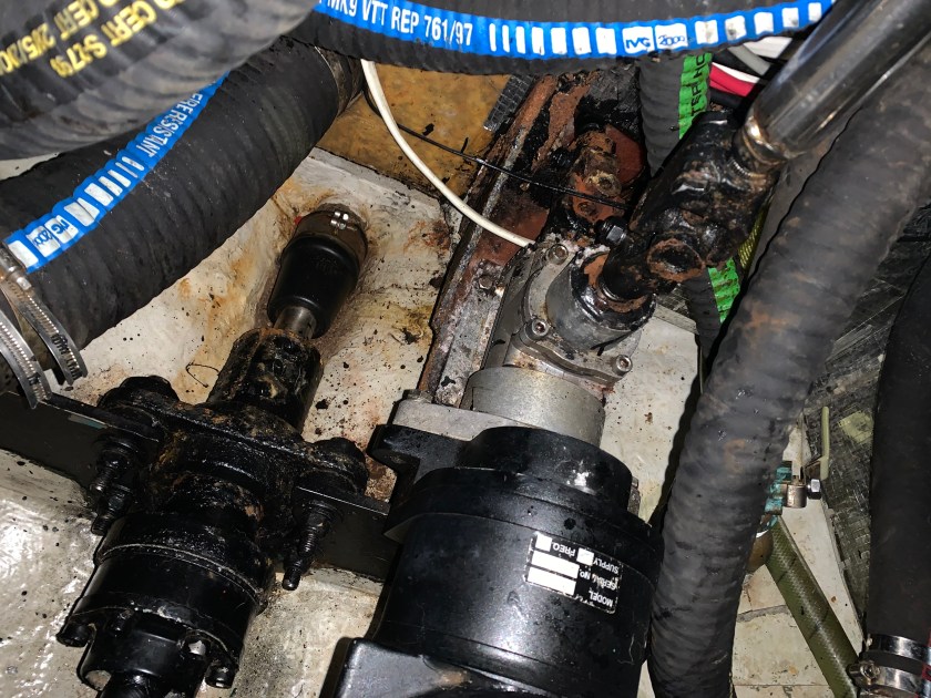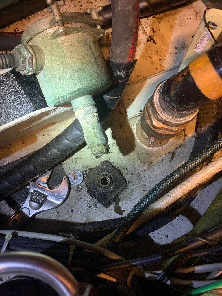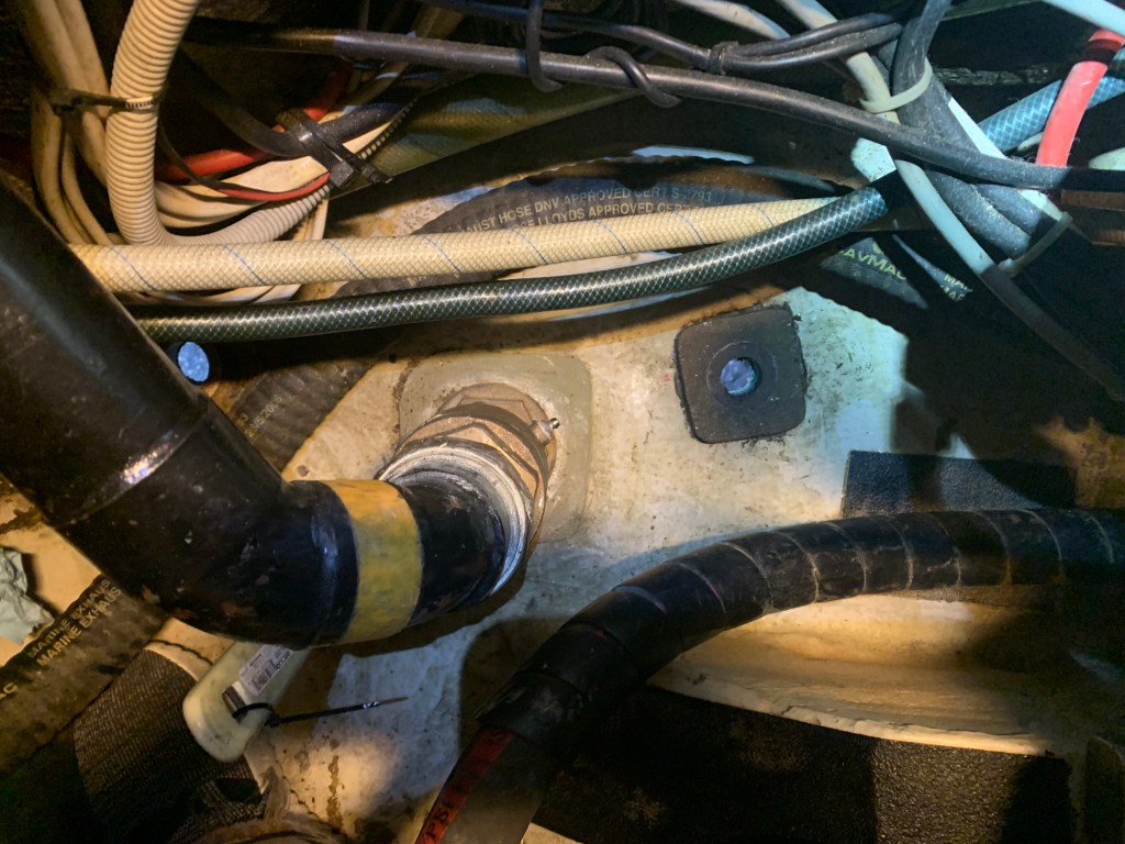 The goal is ambitious to freshen up the engine compartment before we launch. That includes replacing all thru-hulls and strainer thru-hulls, replacing and tidying up hoses, replacing the pressure tank, touching up the engine paint and then re-coating the bottom floor. What started all of this dreaming was not only the disorganization of all hoses and components in the engine room, but also significant corrosion found on certain mechanical bits during the survey and through the past 5 months of sailing.