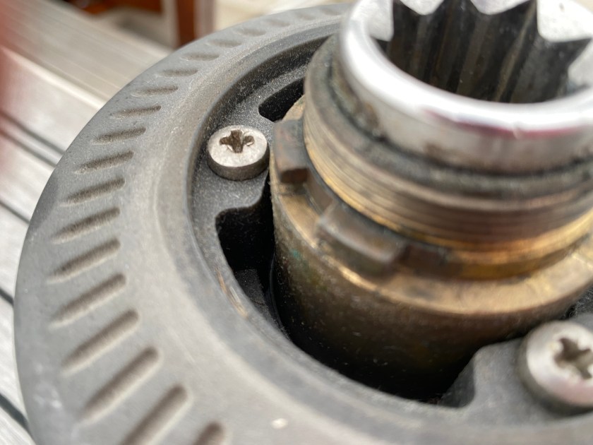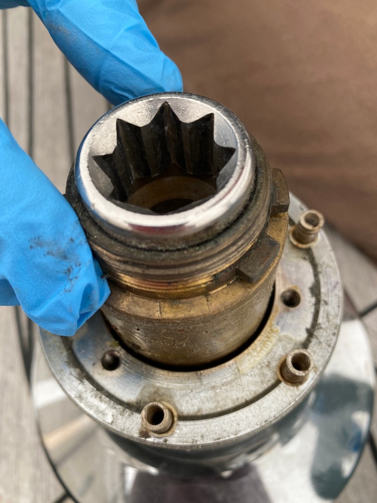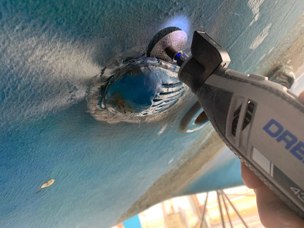 If you are familiar with these strainer thru-hull assemblies, they are just that — fully one-piece bronze assemblies. Under each hull strainer was nasty growth that is otherwise unable to be cleared. I started to cut sealant around the hull-side perimeter of these with my rotary Dremel. I began going through cutting discs quickly.