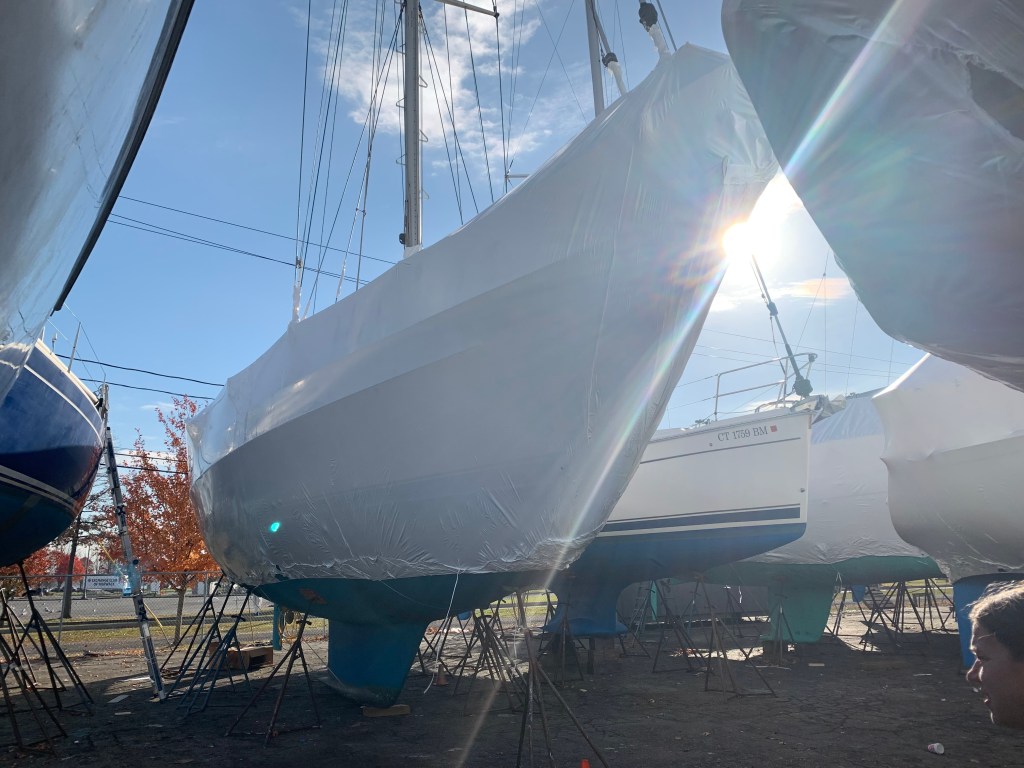 Skyward is still sitting on the hard in Norwalk, CT covered with shrinkwrap. You would think it would be cozy tucked under a thin layer of plastic. But I can assure you that is not the case. The engine compartment is the coldest part of the boat as all of the cool Winter air sinks to that point in the boat. Our Webasto diesel heaters seem to be coked up, and so we regretably will not run them at this time. To get some heat going, we picked up a 1500W electric heater which if aimed properly, will bring the temperature up in this darkened part of the boat.