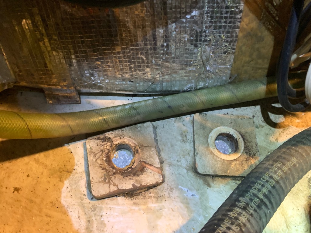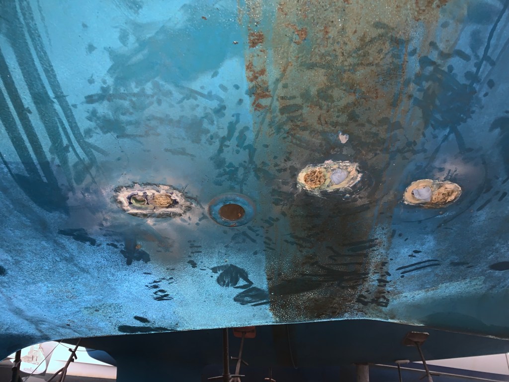 All three portside strainer thru-hull assemblies on have been removed. One thing to observe is that I need ensure marinas lift Skyward about 12-18″ forward of the position that was used this time around, because the straps go right over top of these strainer fittings which causes cracking/damage.