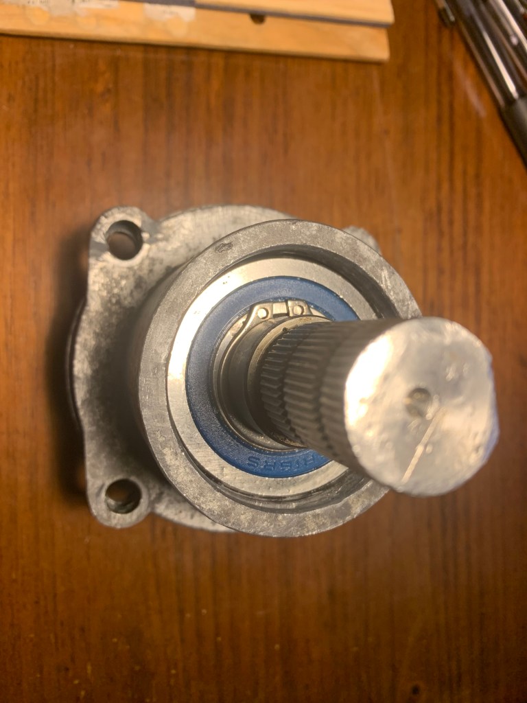 Not knowing the design, I decided that the shaft must be forced out of the housing from the top to the bottom. I attempted to use a seal puller to use force at the end of the shaft, but that didn’t work. Then for whatever reason I supported the bottom of the housing on top of a vise with the jaws opened wide and start pounding on the top of the shaft. I thought I could easily force the shaft down out of the housing. That was a major error on my part, because the upper snapring was holding the shaft in vertically (unbeknownced to me), and the shaft had corroded and seized onto the the upper and lower bearings. I ended up damaging the housing and also the splines at the very end of the input shaft.