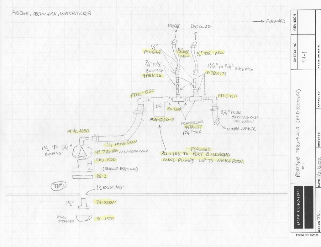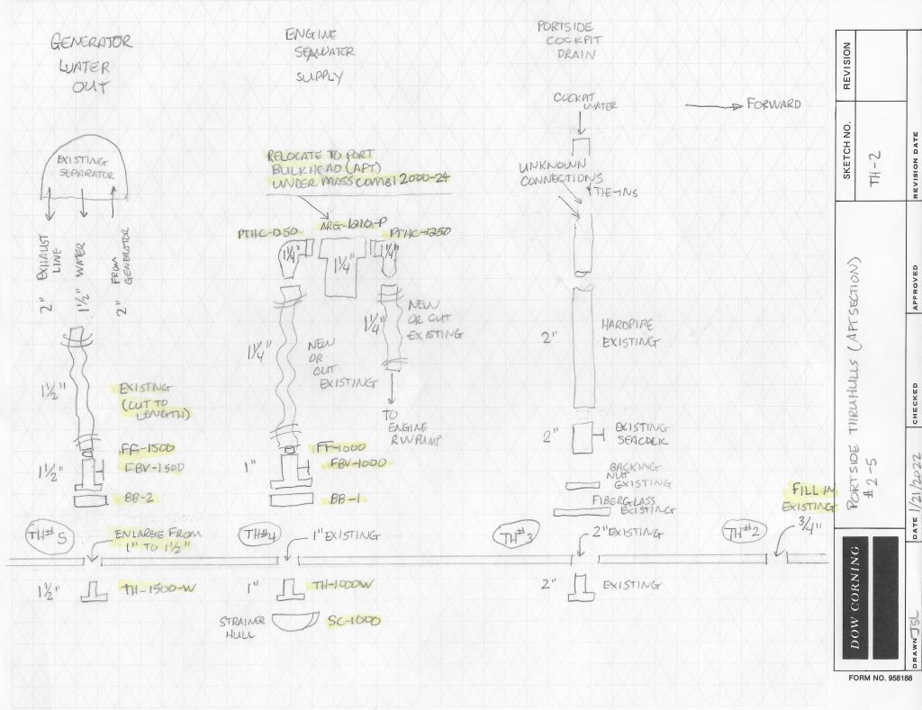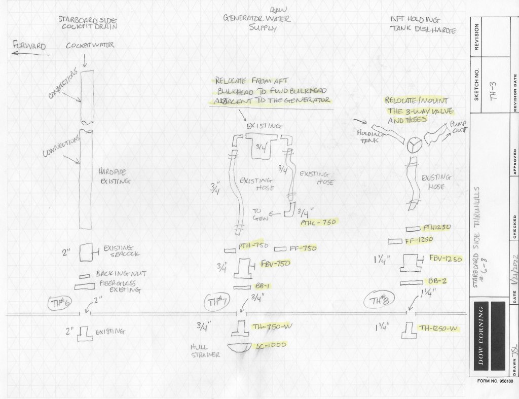 The only way I could get my head around what needed to be purchased was to draw up diagrams of each thru-hull. These sketches show exactly the parts that need to be procured and connected together. Doing things this way helps to make sure we don’t forget some particular detail which can derail and slow down any installation effort. Taking this approach helps to ensure we know how the parts are designed and clear up any assumptions. An example is hose sizes: Should you buy full flow fittings? You have to get down to this level of detail before you go spend a lot of money on parts and fittings.