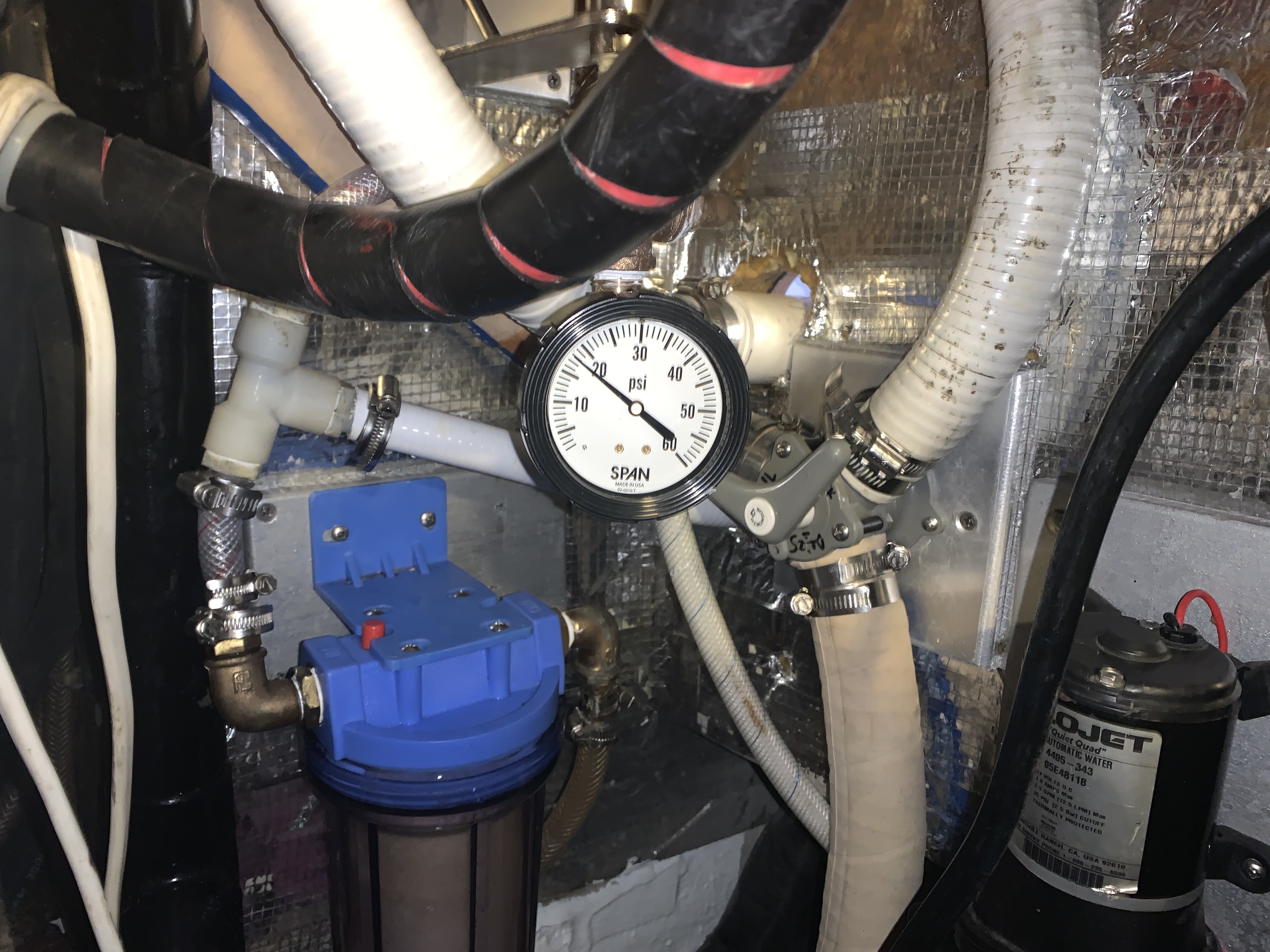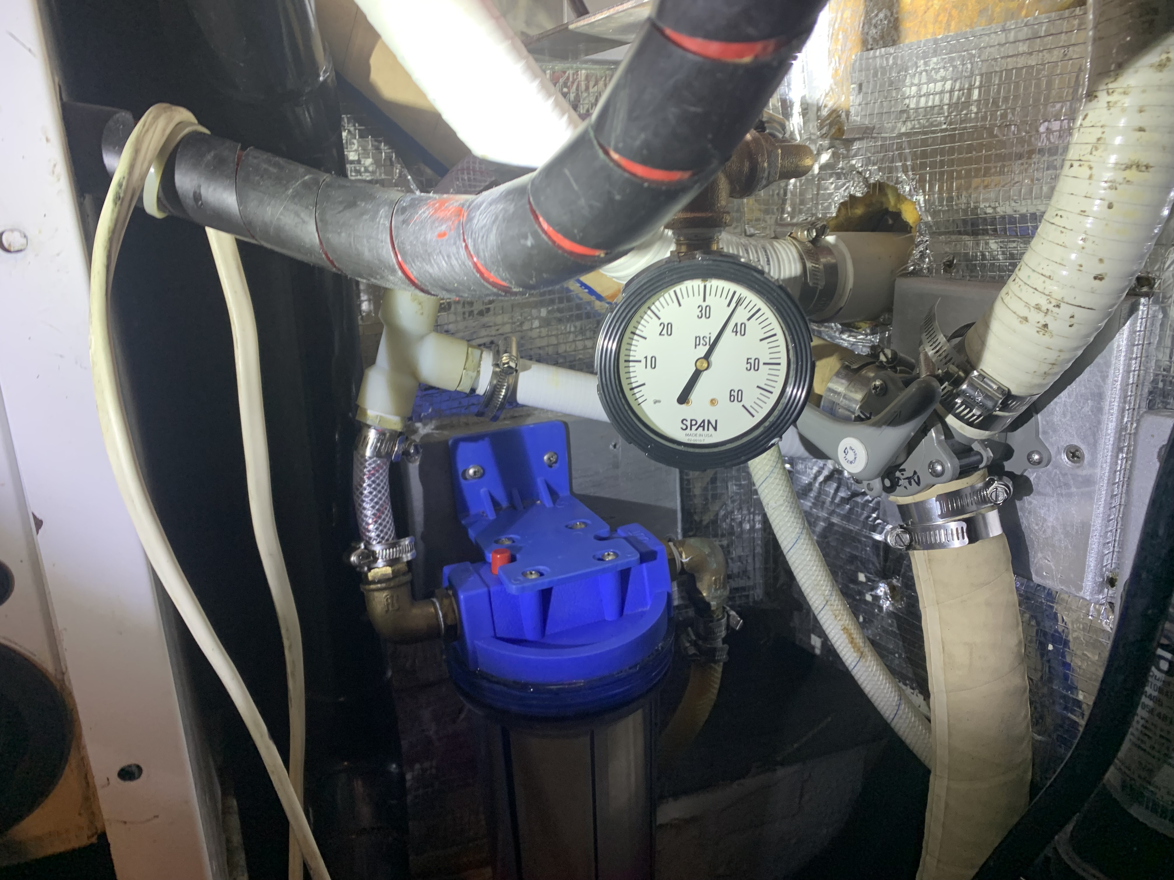 - Rebuilt the entire freshwater system between the supply pump and the filter. A new pressure tank, new hoses and a new bronze manifold with a 0-60 PSIG back-mounted pressure gauge. It is so nice to have this piece of data on this system.