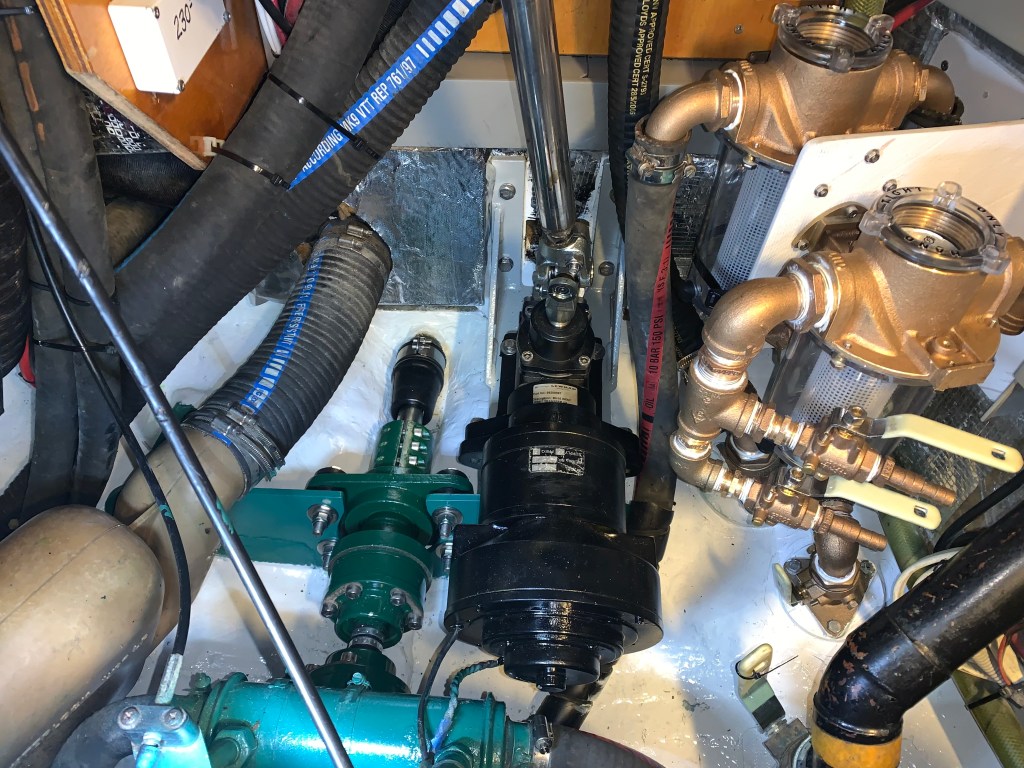 - Rebuilt the entire steering system from the helm penetration down to the aft bulkhead. Three new U-joints, a completely new bevelhead, cleaned up shafts, and media-blasted/powder coated the bevelhead base frame. I also cleaned up and re-painted the Mamba autopilot.