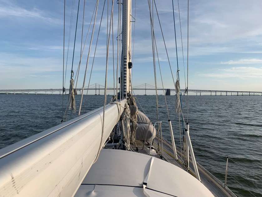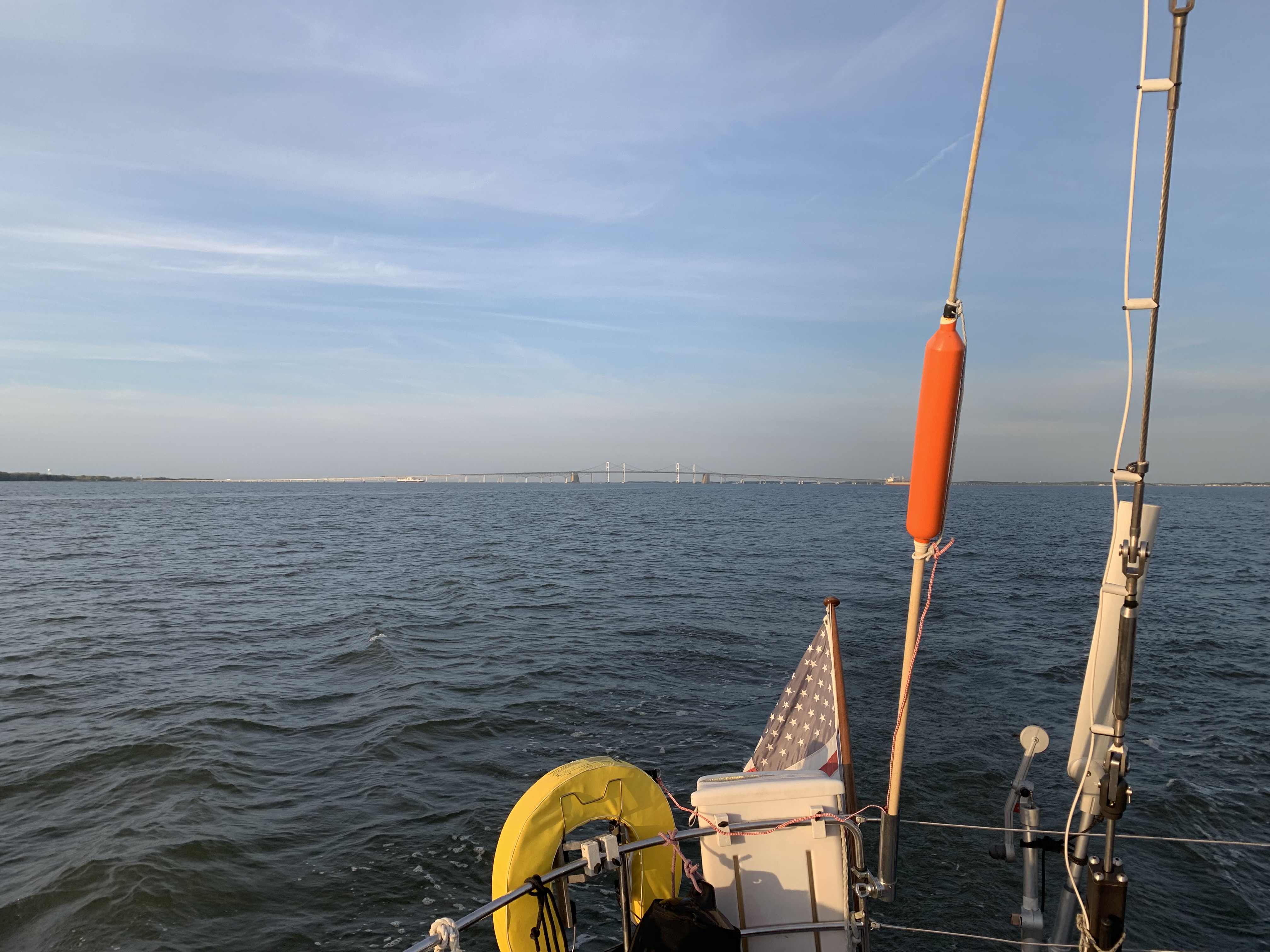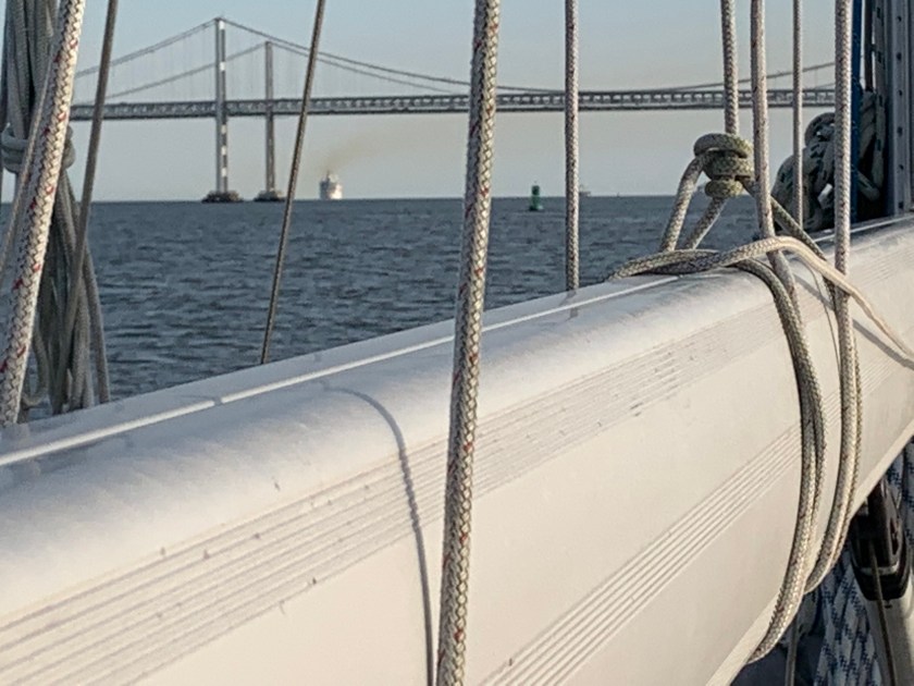 As we made our initial approach the the Bay Bridge at around 4:00 pm, we were in a race against a cruise ship going about 14 knots. The current was finally starting to push against us (we had current with us the entire trip) and we were barely keeping 6 knots. The ship was Enchantment of the Seas – a Bahamian registered ship – and it was headed to Kings Wharf, Bermuda. He beat us to the bridge, and then we encountered a lot of anchored and empty container ships in the Bay. Once we got behind the cruise ship at nearly 7:00 pm we had this horrible smell come across the boat, and it was clear this was the exhaust from that ship – you can see it fill the air in front of us and behind us.