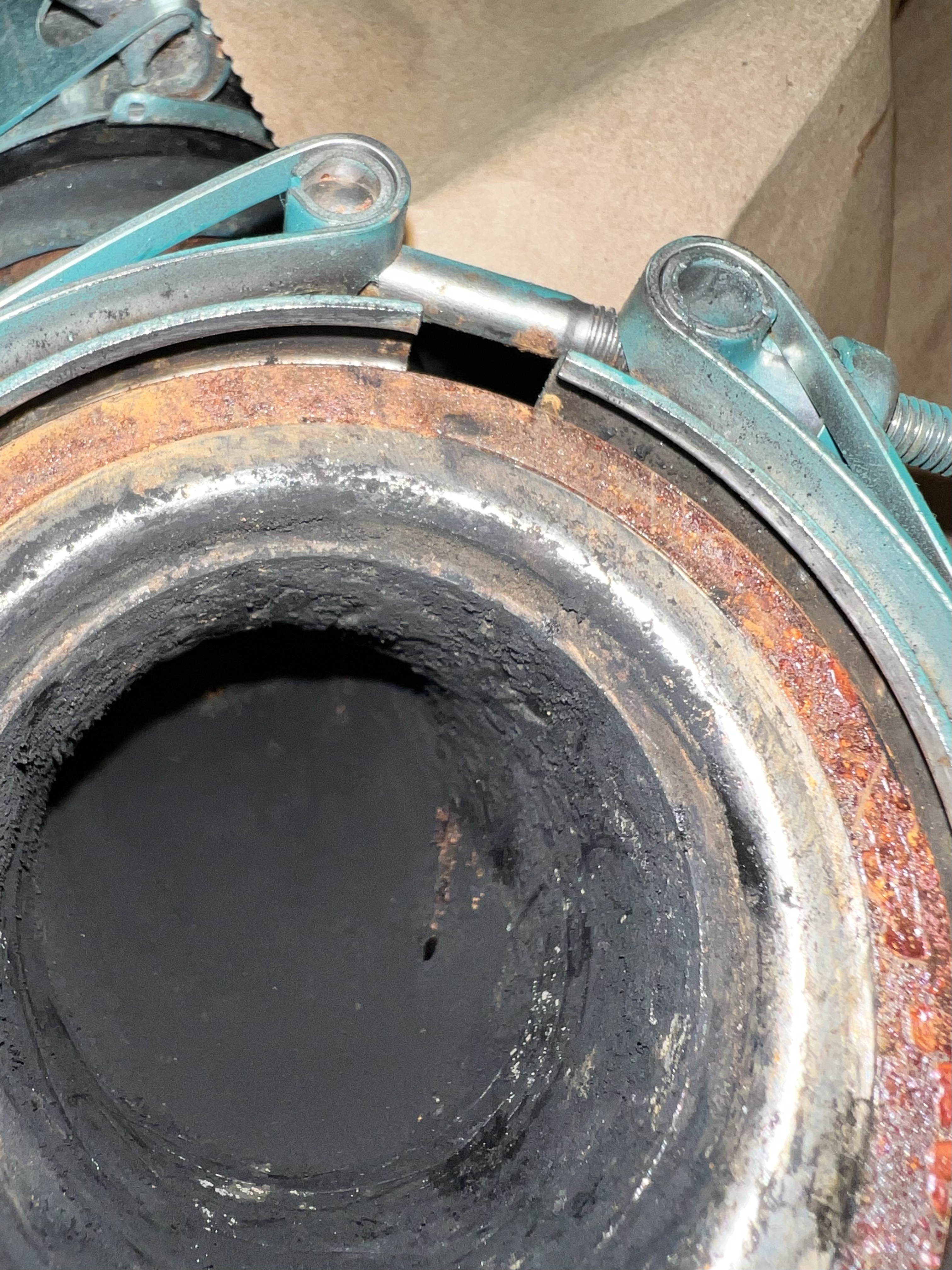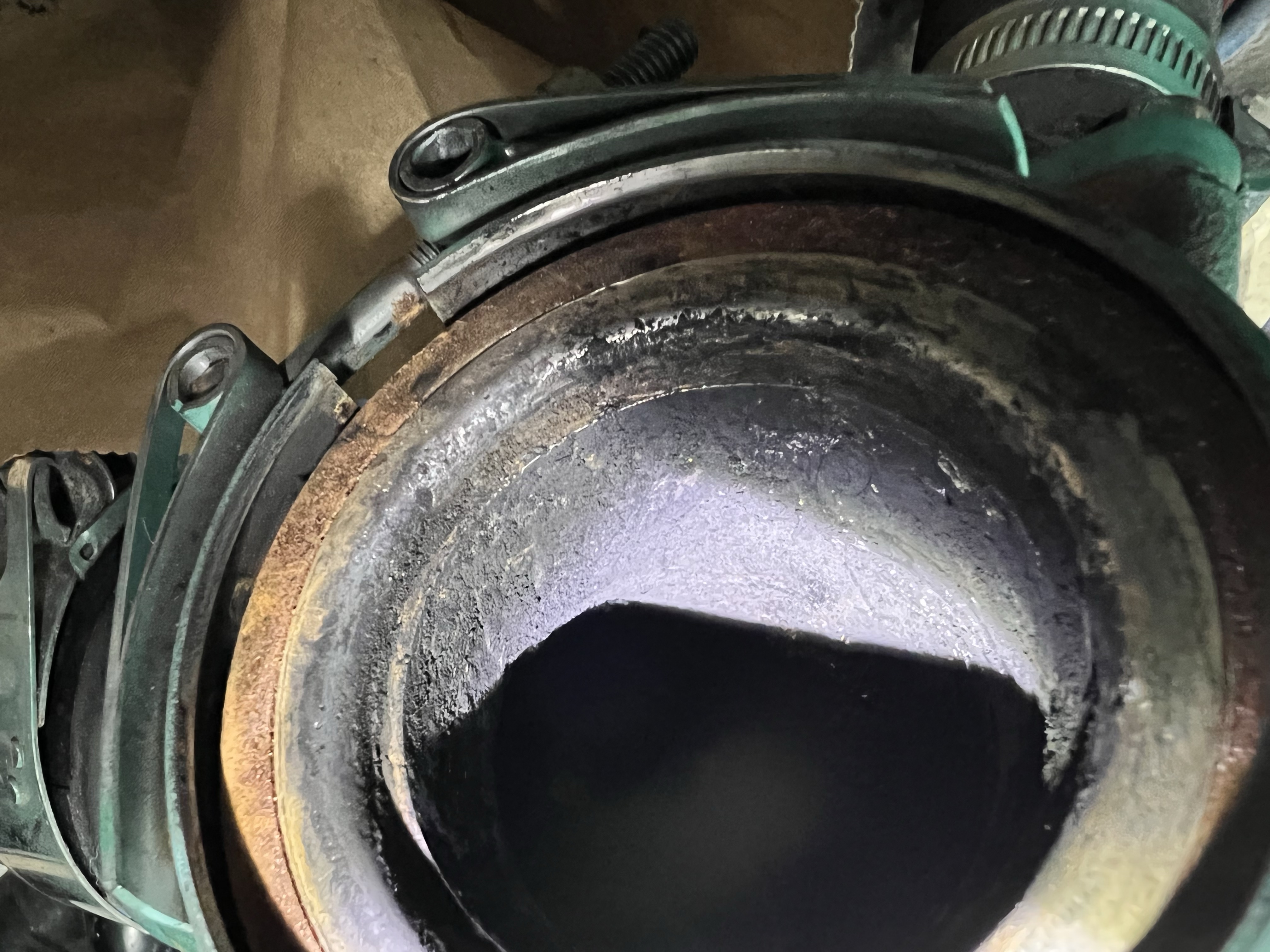 Following his strong recommendation, I took off the turbo exhaust elbow to check for build-up and corrosion. Good thing that the elbow is installed with a single banjo-style clamp and has a metal-on-metal seal.