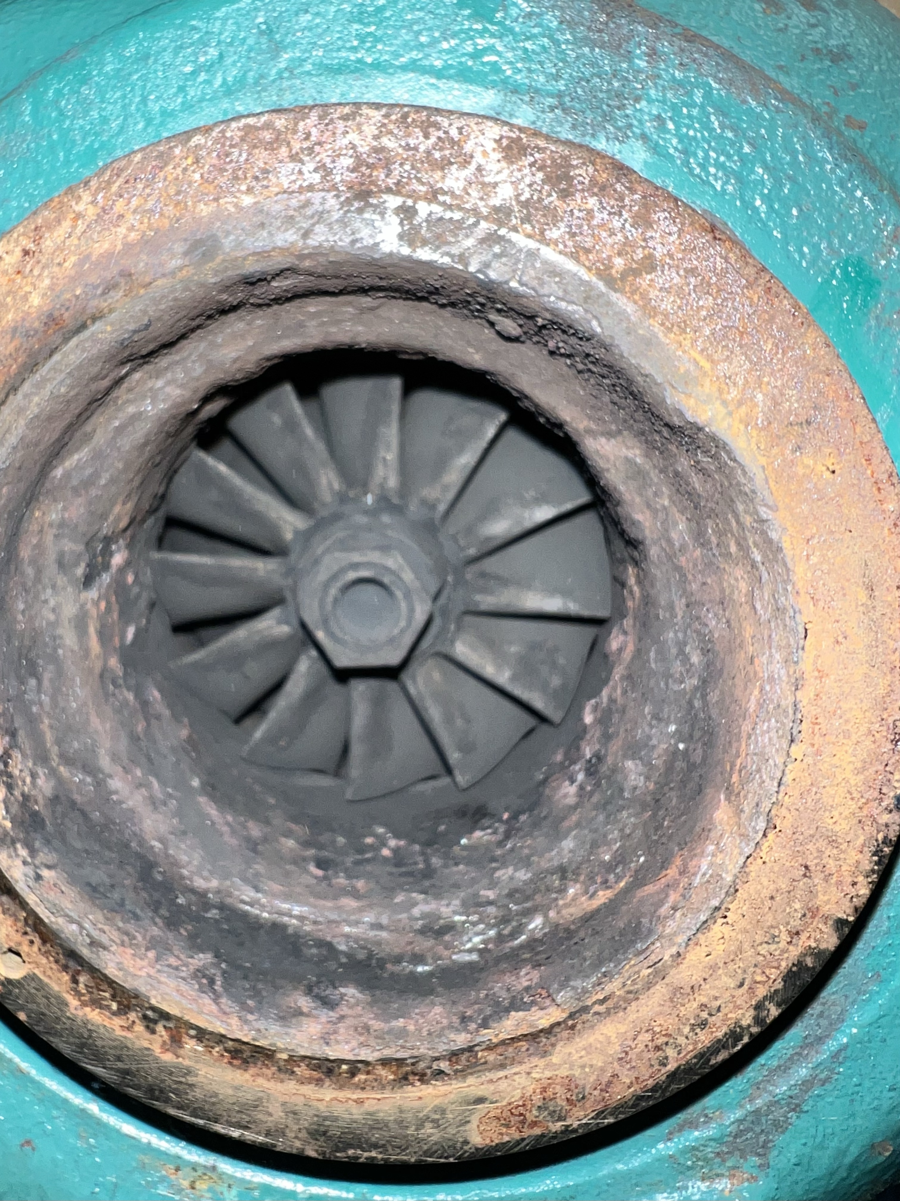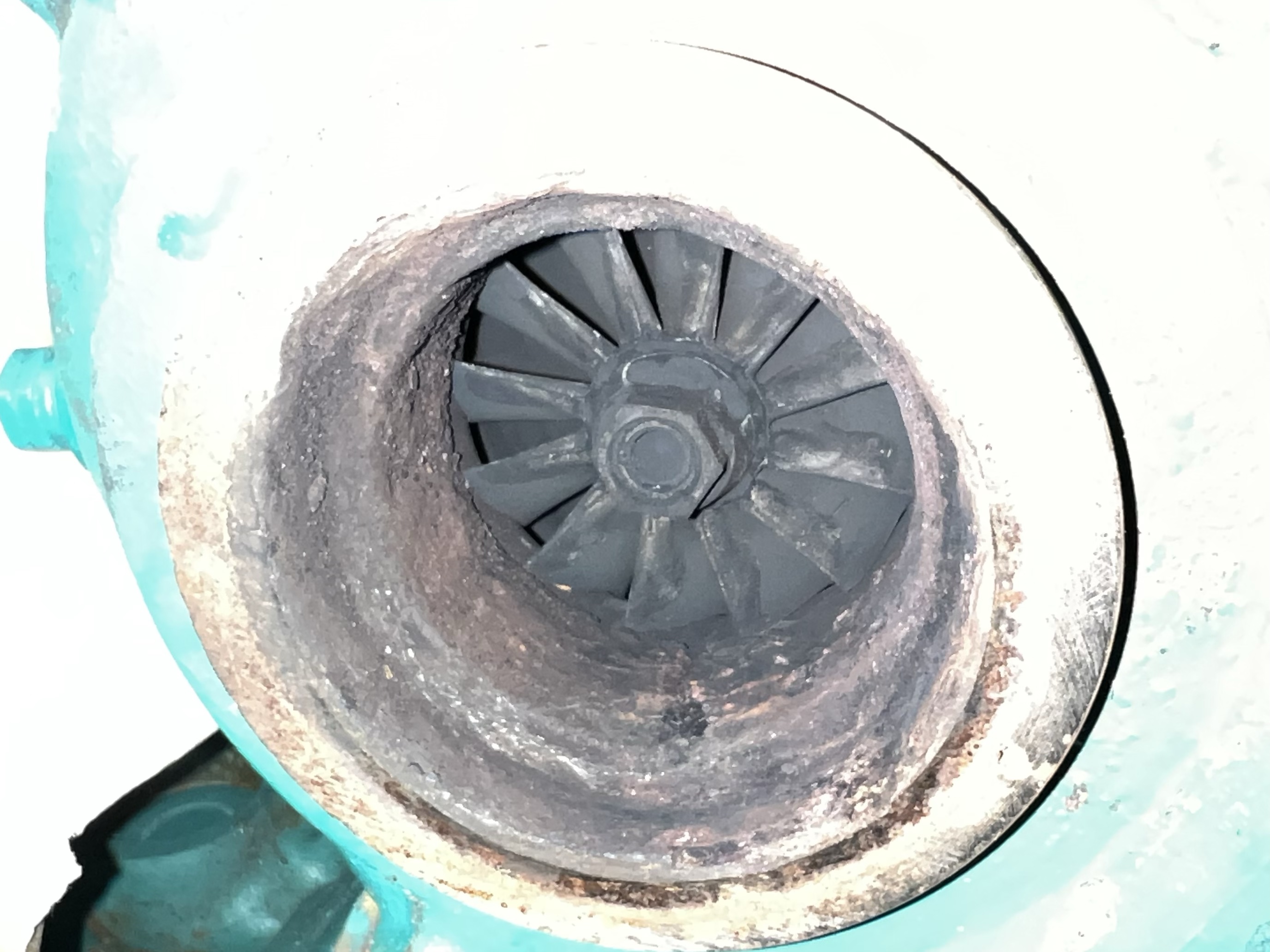 I used a flathead screwdriver to scrape away the carbon buildup. I don’t see corrosion, but I am concerned about some pitting on the exhaust side of the turbo. As I gently but firmly scrape in a in flat pattern, carbon buildup perfectly falls down into the paper shopping bag that I positioned below the open turbo and elbow parts. Dick is going to give me a quote to pull the engine and perform a major service on it since it has about 4,000+ hours on it.