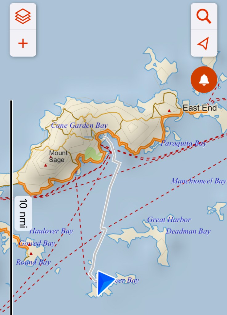 We left Anegada with another monohull apparently with the same destination or route in mind. They went directly for the rumb line. After looking at the wind direction, we elected to point North for a bit coming out of Anegada to get a better wind angle. We pinched all the way to Great Harbour as far as we could get. This would be our last big sail, and our decision turned out to be the right decision as we won the race.