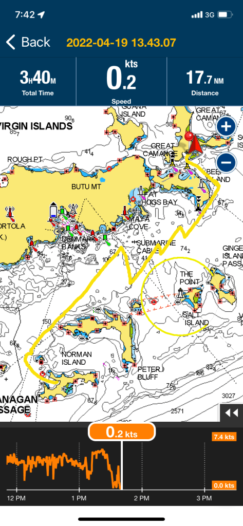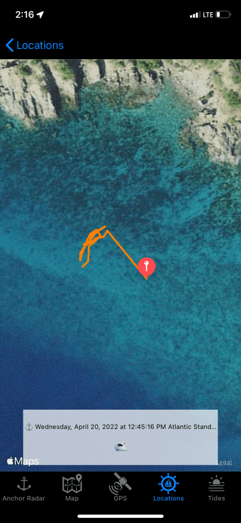 To give you an idea about our anchorage at Great Dog, look at this anchor drag map. Now you know why I was nervous with a lee shore behind us.