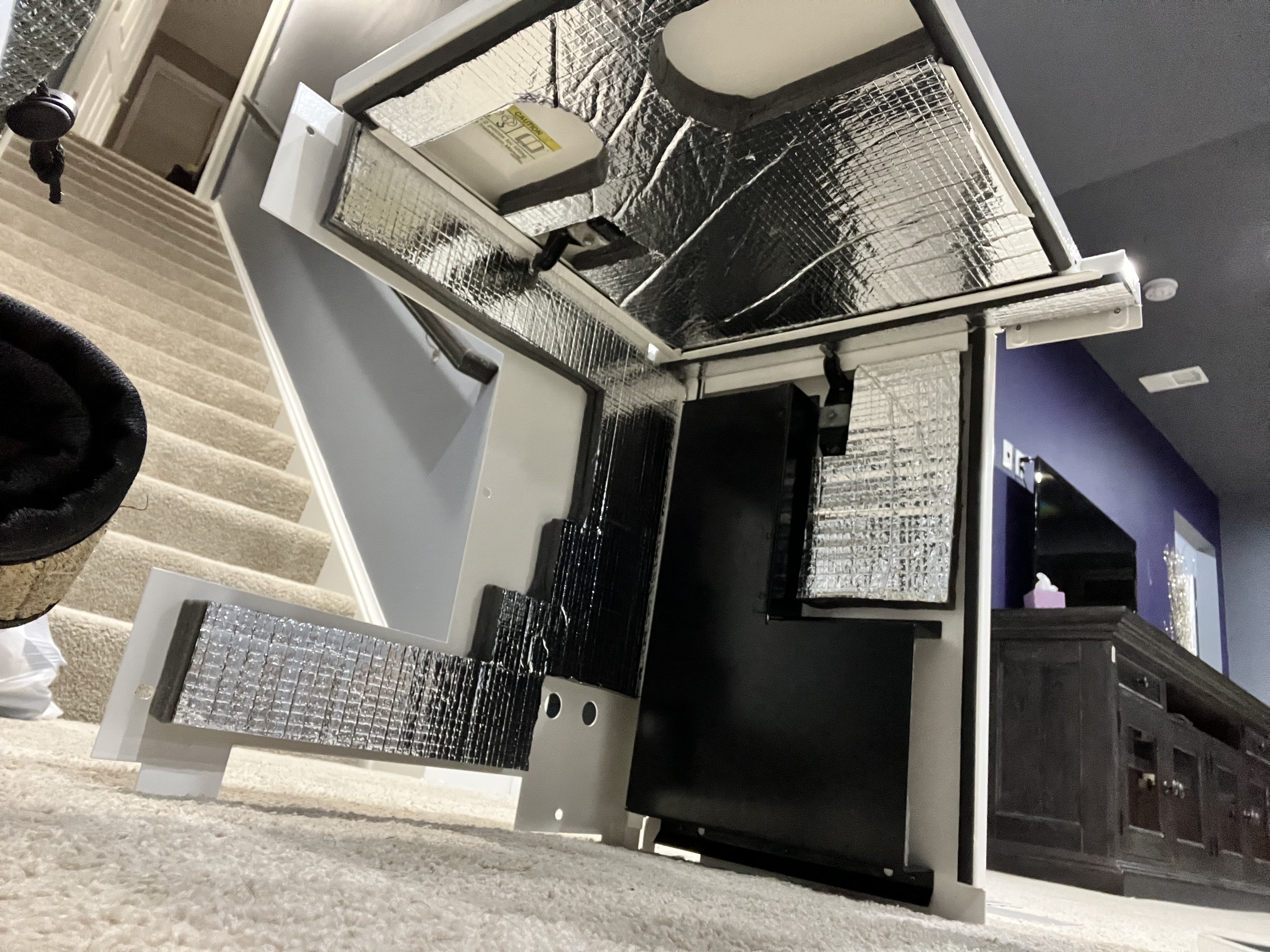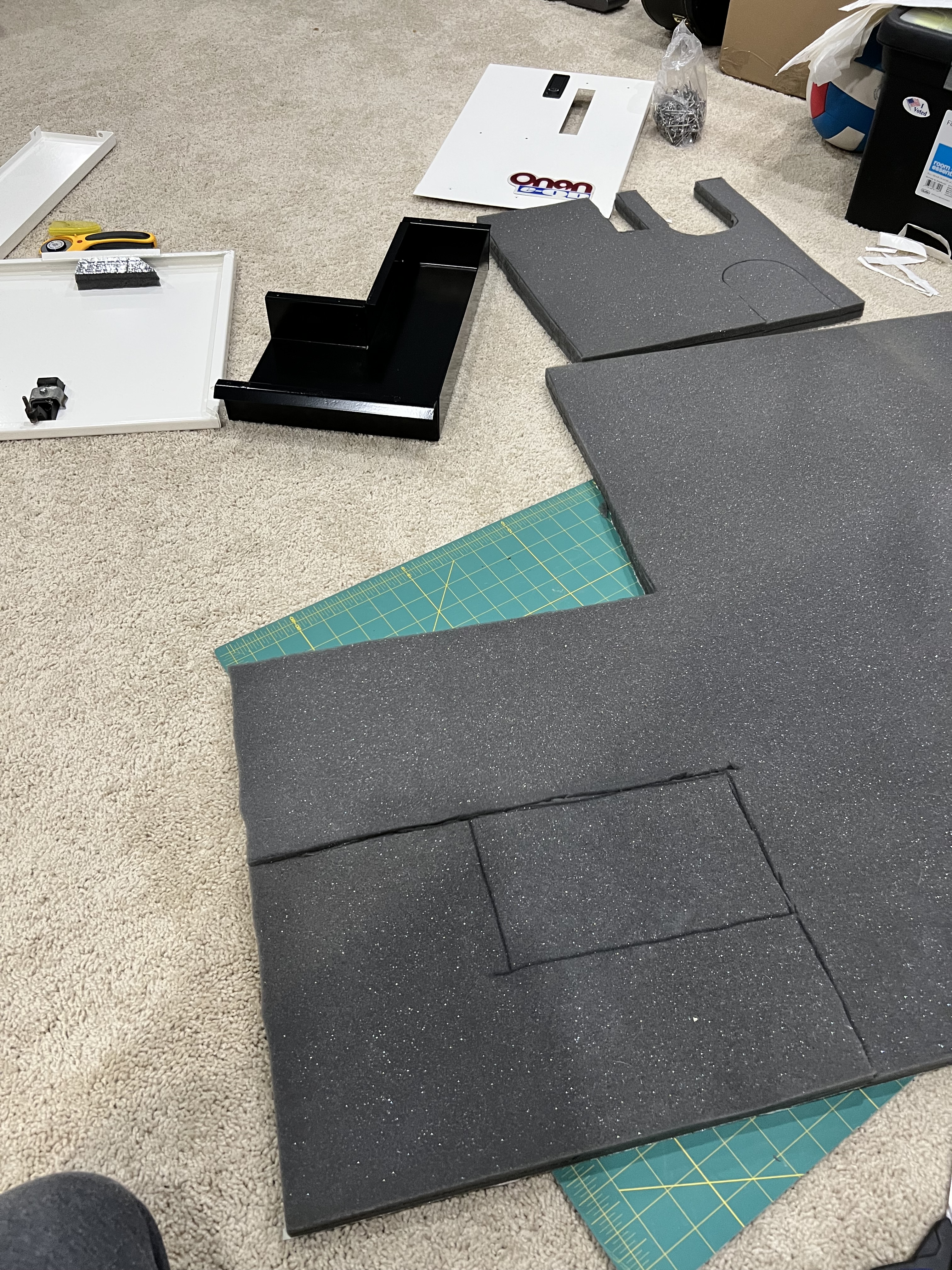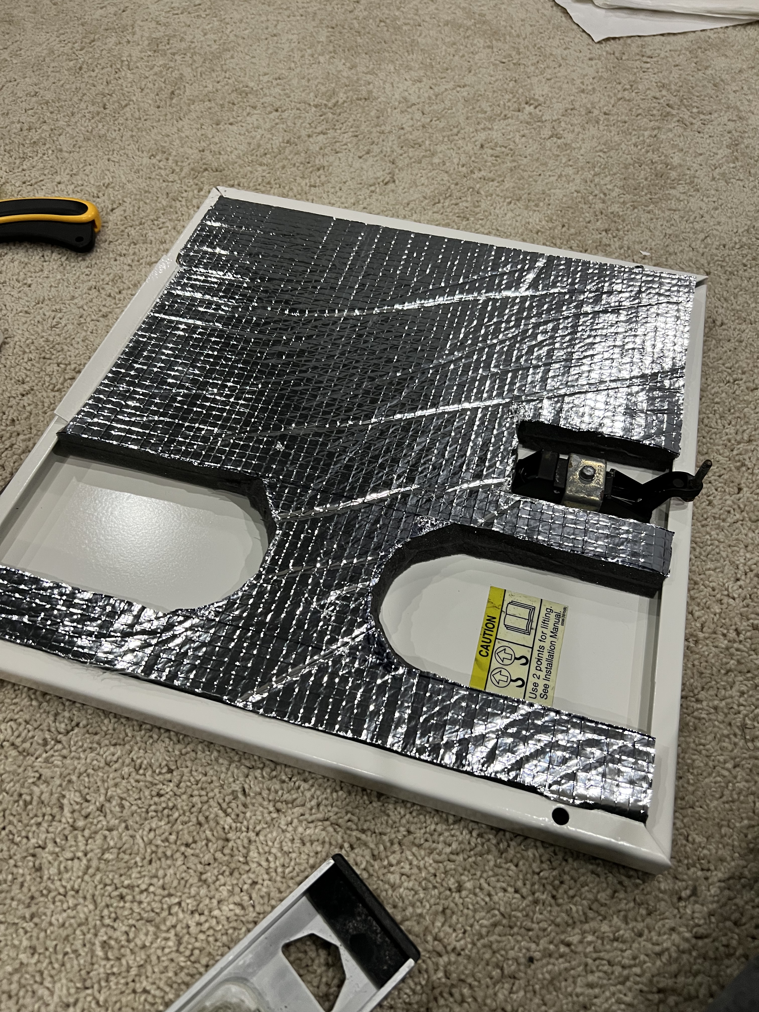The last thing is to glue in new sound insulation purchased from Defender, to re-install the hardware and rivet parts together. The insulation was a little bit thicker than the previous Onan insulation, and the new insulation was multi-layer with a thick plastic (?) layer sandwiched in the middle making it painful to cut.