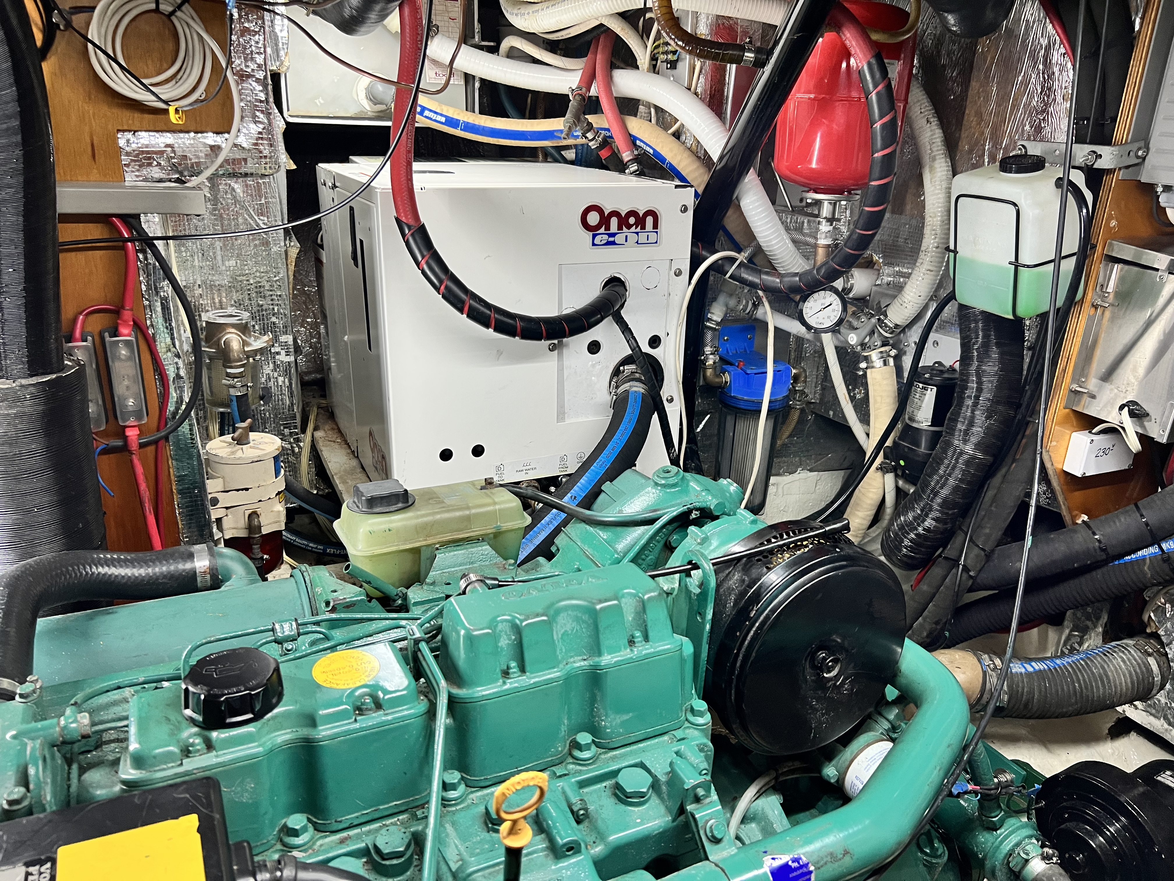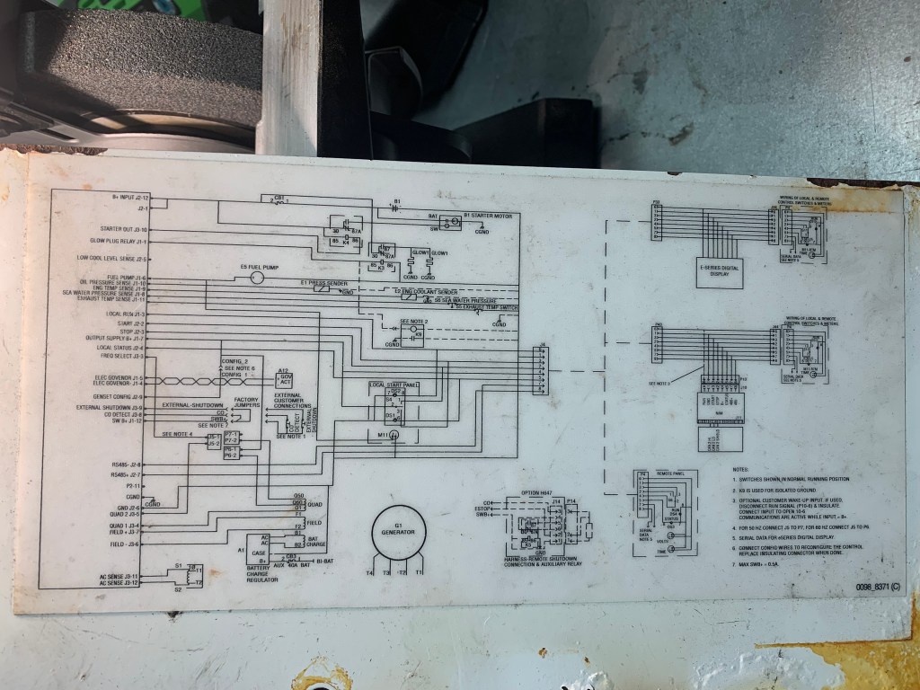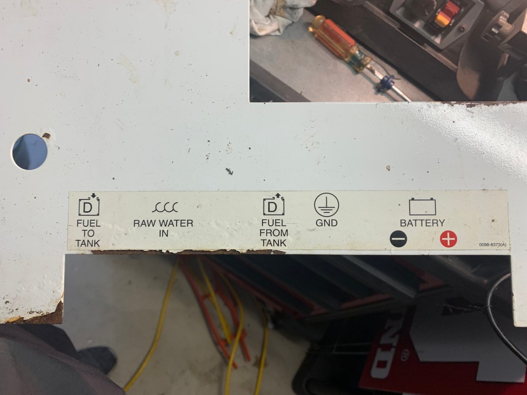 We completely renovated all of the removable generator panels, finally. This was a project within a project. In total there were 7 removable panel pieces that had extensive rust and paint removed from an unattended leak from previous owners. The generator sits on the outer starboard side of the engine room. Above that location in the cockpit lazarette sits our hot water heater. The water distribution manifold is also in the lazarette, and we suspect leaks from that manifold were dripping down through the lazarette door (which has several cracks in it) and onto the generator. We have other theories as well about how water was leaking onto the generator, but nevertheless, we had a lot of rust to contend with.