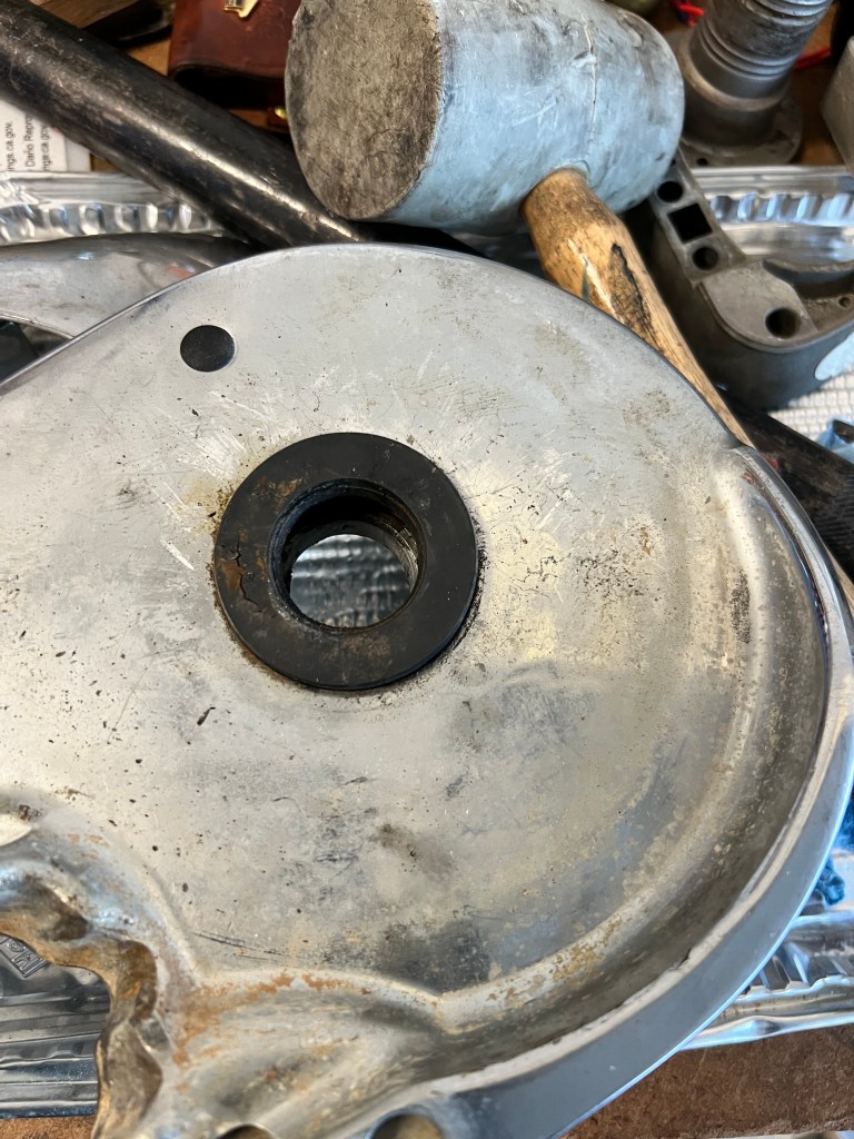 Then I pulled out the shaft/bearing assembly and started to pound it into the base. It went in but required more influence than I thought would be needed. I toiled with that for maybe 15 minutes. Once it was seated, I breathed a sigh of relief and installed the larger circlip to secure the assembly to the base on the topside.