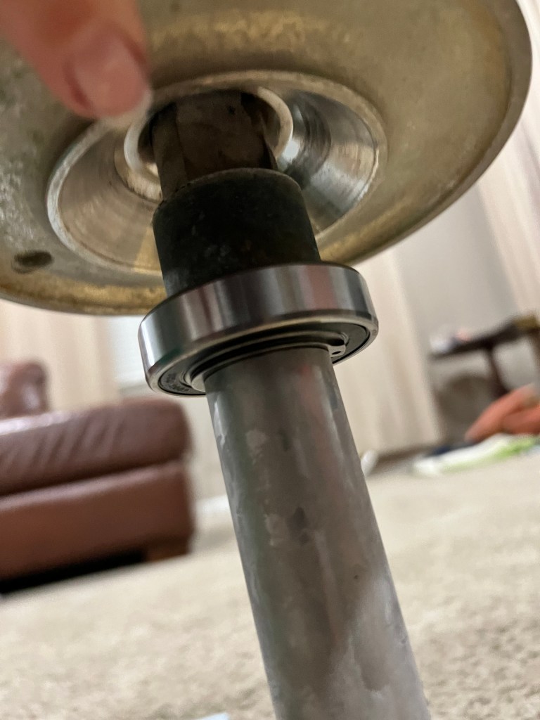 I used a combination of sockets to pound out the bearing from the underside of the base. Again, this was not complicated or tough to do. Once I had the bearing out, then all parts went into the mineral spirits bath for a soak and then cleaning with a metal brush.