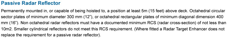 Furthermore, The Maritime and Coastguard Agency (MCA) updated its guidance on the use of a radar reflector on boats less than 15m/49.2ft and under 150 gross tonnage in 2022. They stated that a radar reflector or radar target enhancer should be permanently installed on a recreational boat with an RCS of at least 7.5m² at X-Band and 0.5m² at S-band when mounted at a minimum height of four metres above sea level.