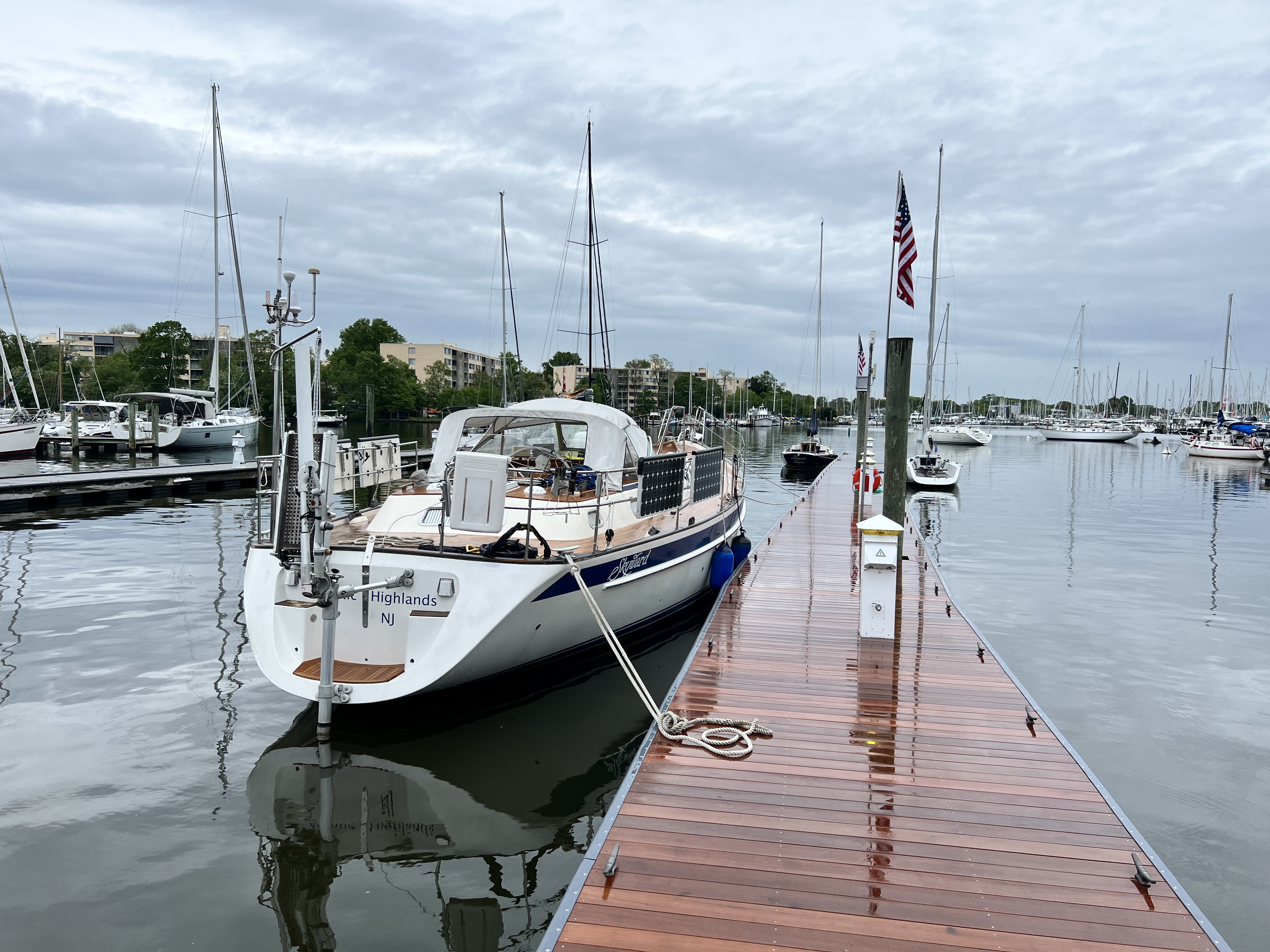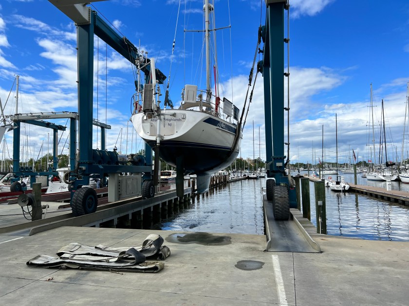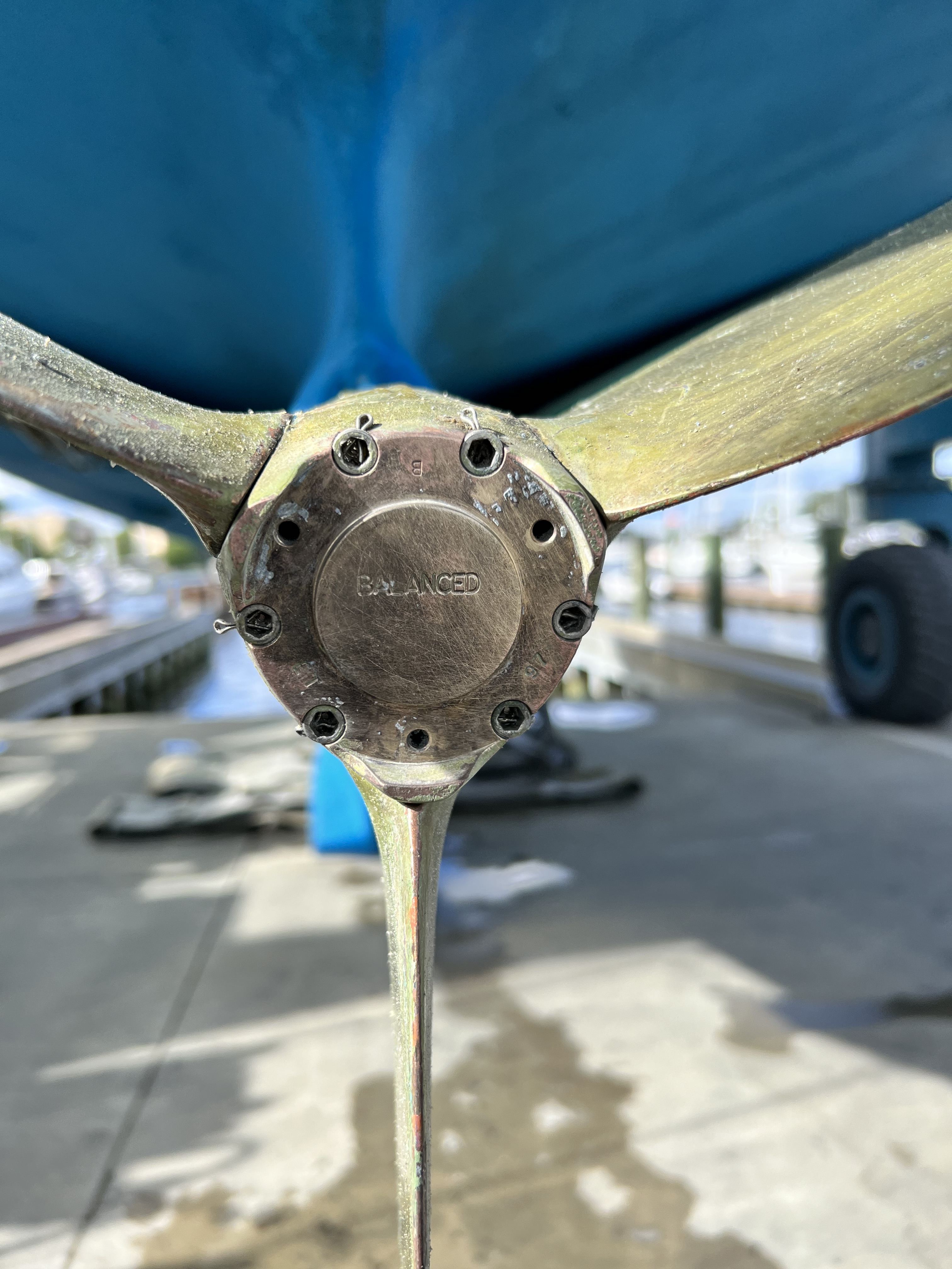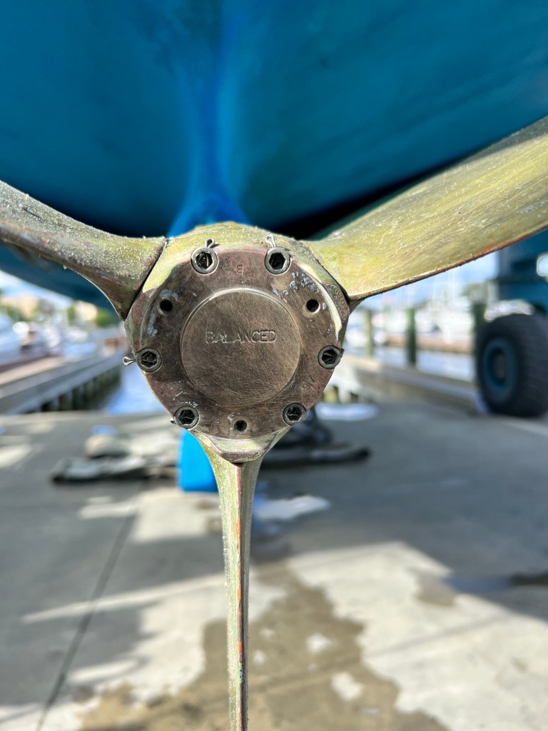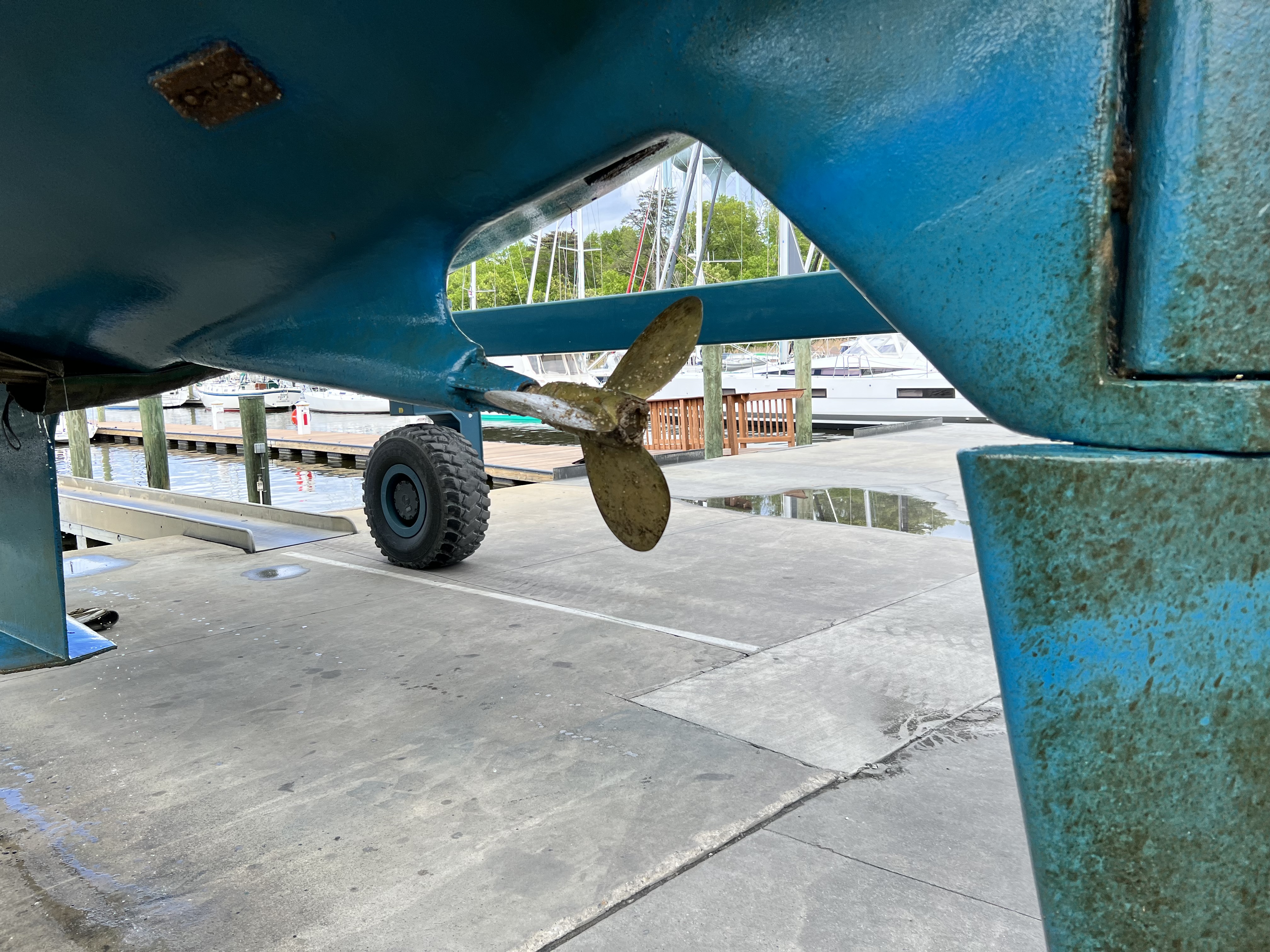 I scheduled an overnight hang because I needed to reset the prop from a bumbled installation attempt that I made back in April 2022 just before launching at Norwalk Cove Marina in Connecticut. Recall that I completely disassembled the prop at that time, cleaned it up and installed a very nice coat of Propspeed. I then installed the prop by myself for the first time ever and was not careful with the setting (right-hand/left-hand) or the angle. The correct setting for Skyward is left-hand rotation with 18 degrees pitch for our 19″ DIA MaxProp VP. I had accidentally set it up with right-hand rotation at 24 degrees pitch. We were definitely over-propped and we saw much higher fuel consumption from this.