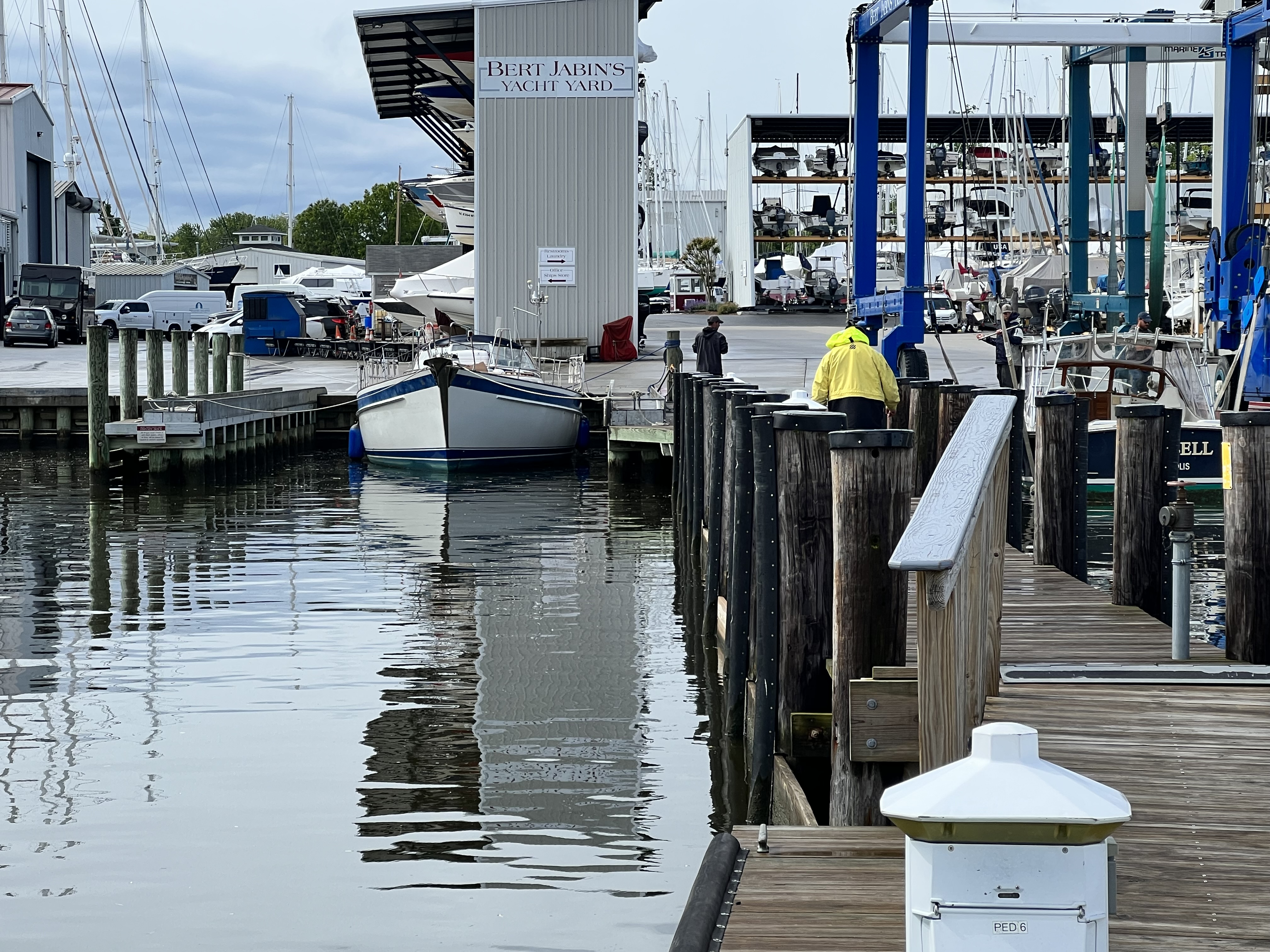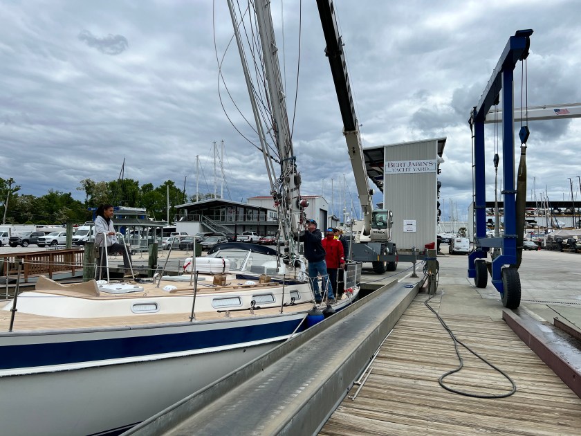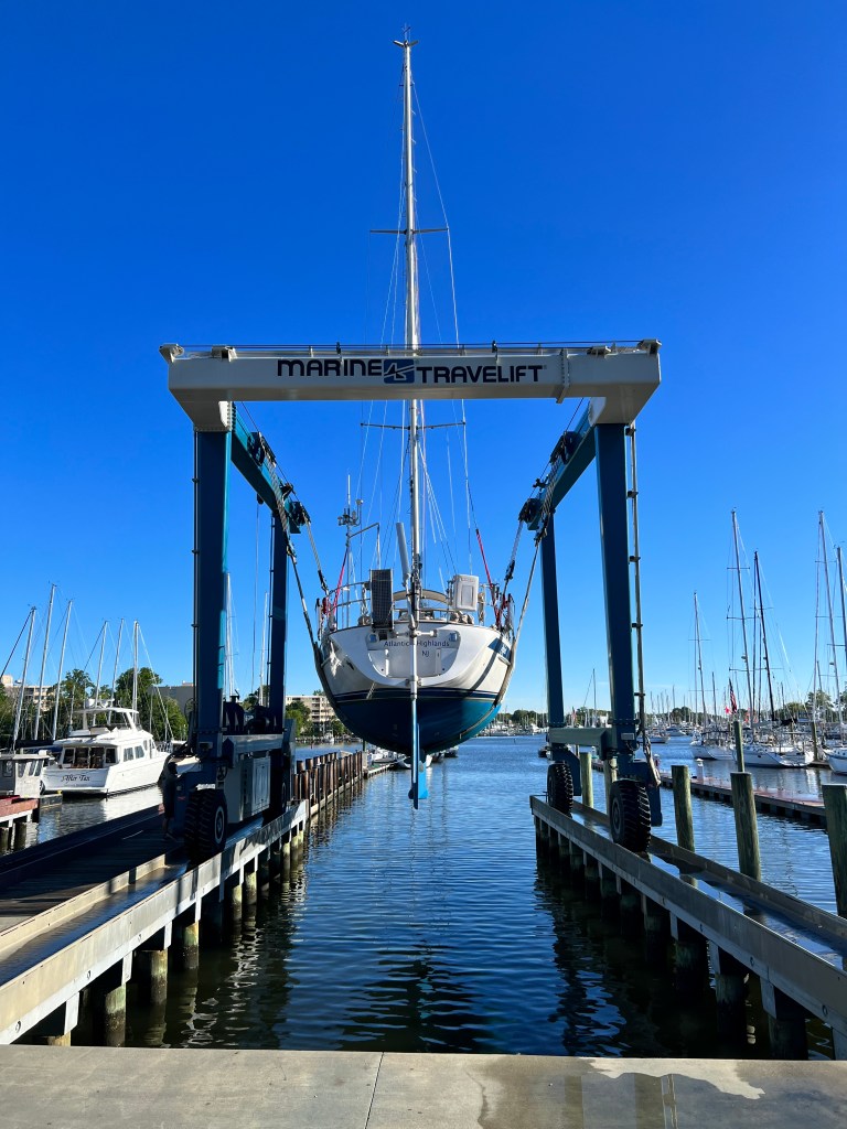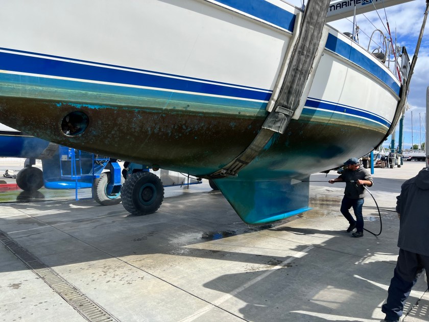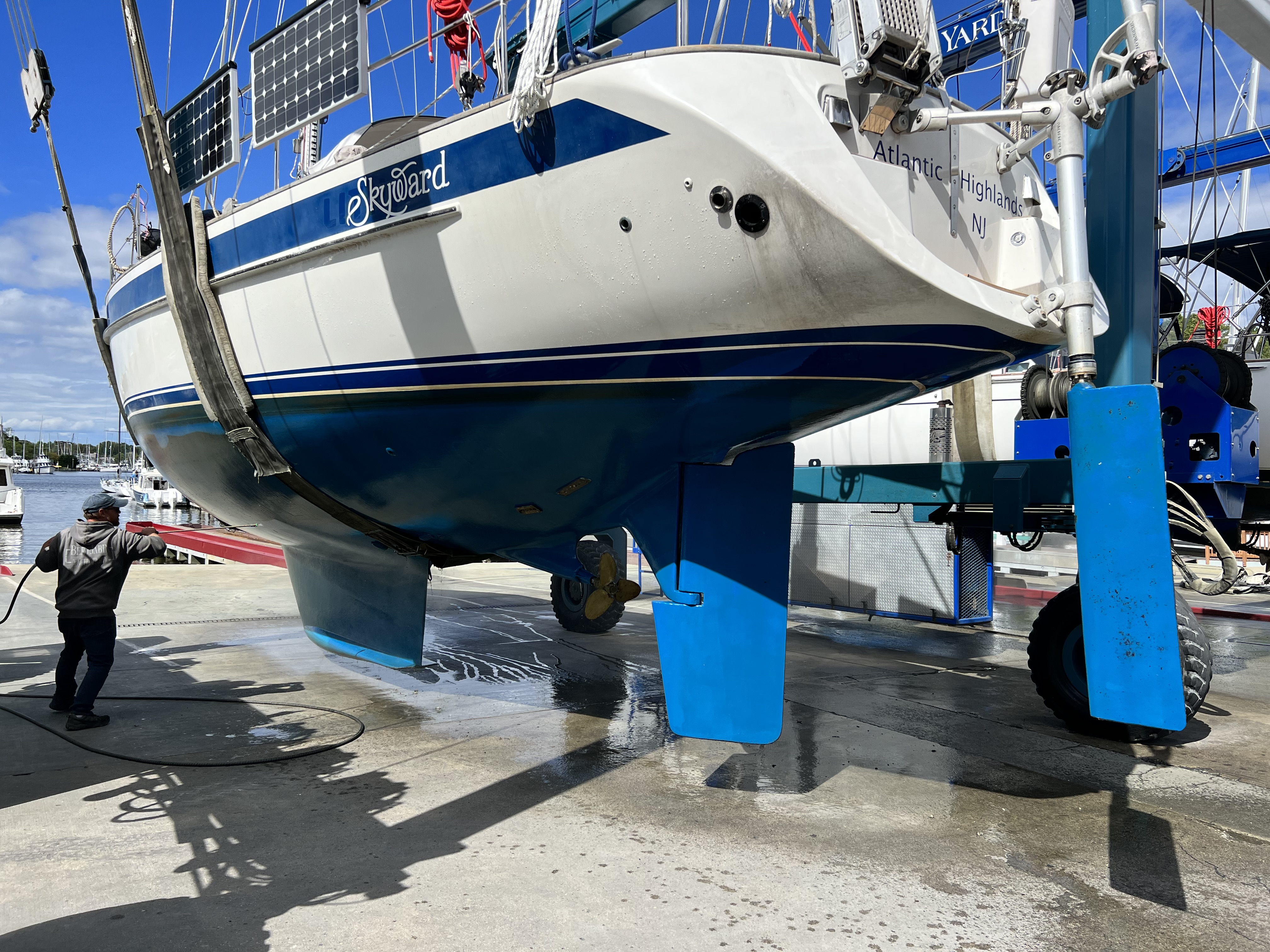 Once the rig was set in place and secured, we scooted the boat over to the next bay for an overnight haulout. BJYY lifted Skyward and completed a much-needed spray down. The boat was sitting on a T-dock at Liberty Marina from 11/1/2022 through about 4/1/2023. The bottom didn’t look so bad, and there was only a small amount of film/scum on the hull. Petit Trinidad SR (“Slide Resistant”) seems to be a good ablative paint for the Chesapeake. I heard two rumors about the Blue color; a) it was pulled off the market during COVID due to supply chain issues making it difficult to source a chemical raw material, and b) that the regulations had changed and forced this product off the market due to a chemical raw material ingredient in the formulation.