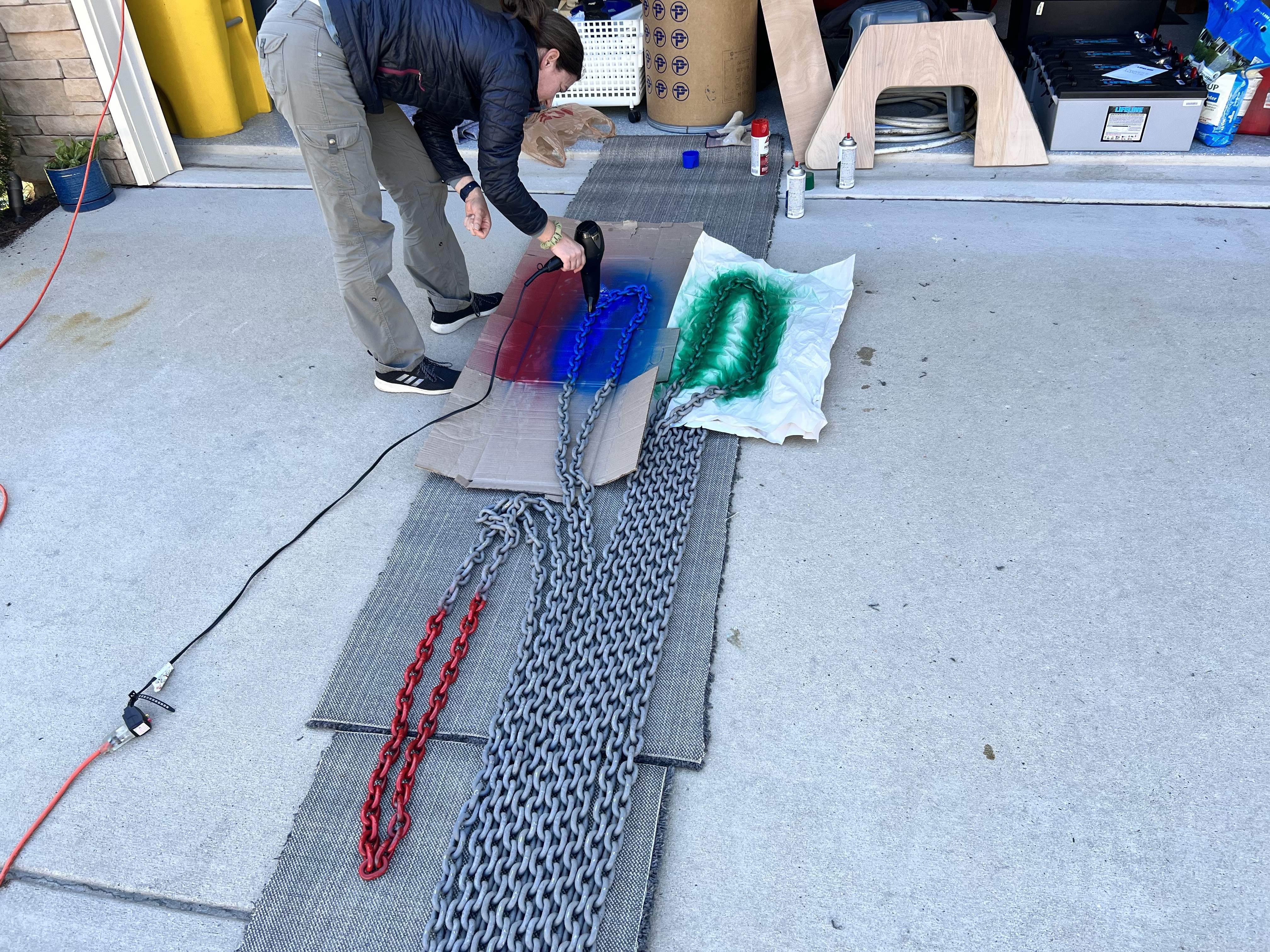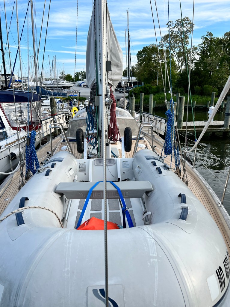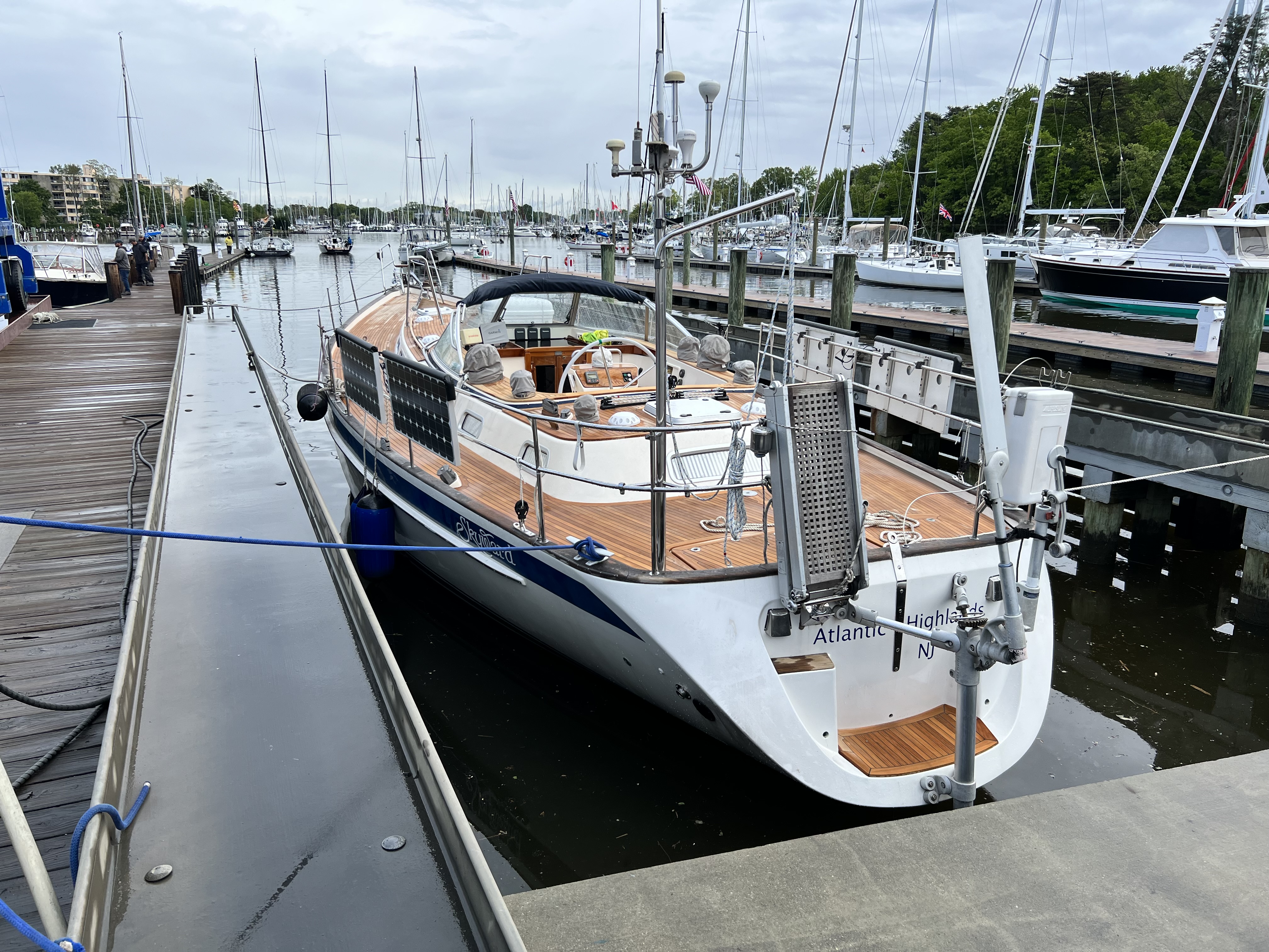 Once the rig was set in place and secured, we scooted the boat over to the next bay for an overnight haulout. BJYY lifted Skyward and completed a much-needed spray down. The boat was sitting on a T-dock at Liberty Marina from 11/1/2022 through about 4/1/2023. The bottom didn’t look so bad, and there was only a small amount of film/scum on the hull. Petit Trinidad SR (“Slide Resistant”) seems to be a good ablative paint for the Chesapeake. I heard two rumors about the Blue color; a) it was pulled off the market during COVID due to supply chain issues making it difficult to source a chemical raw material, and b) that the regulations had changed and forced this product off the market due to a chemical raw material ingredient in the formulation.