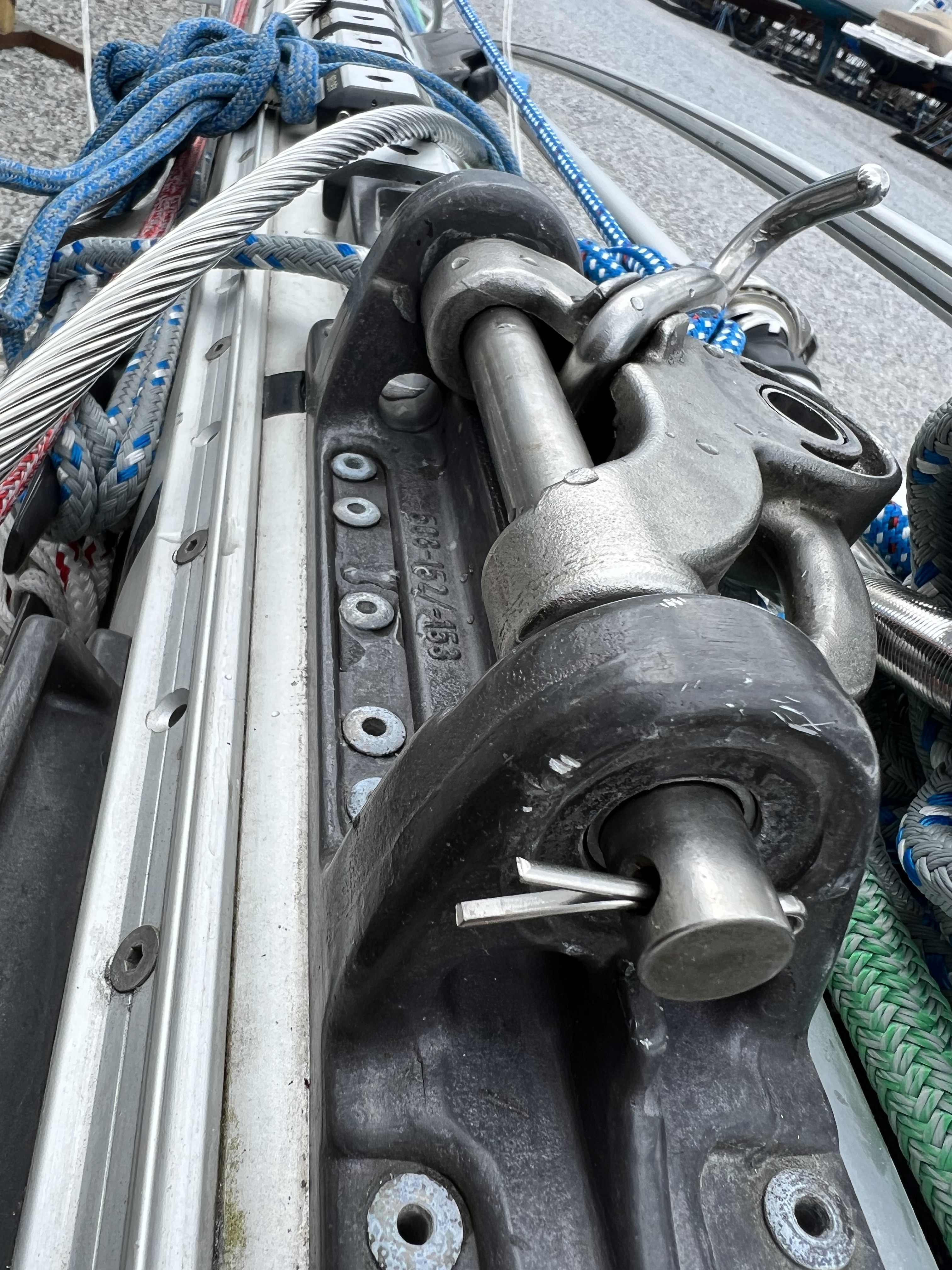 Before we could put the plan into motion, the mast had to be prep’d with the spreaders getting re-installed and the uppers/lowers and Lx/Dx’s installed. The Rigging Co also bored out and shimmed my boom gooseneck and vang plate connection. This stopped all vertical and horizontal slop motion. I can’t wait to test this on a downwind sail. The anenometer, a new VHF antenna and Windex were installed. I waxed the entire mast and fulfilling a last minute request from me, The Rigging Co installed some spreader lights -AND- checked all ball bearings on the mainsail cars and replaced about 80 of them . Very cool!