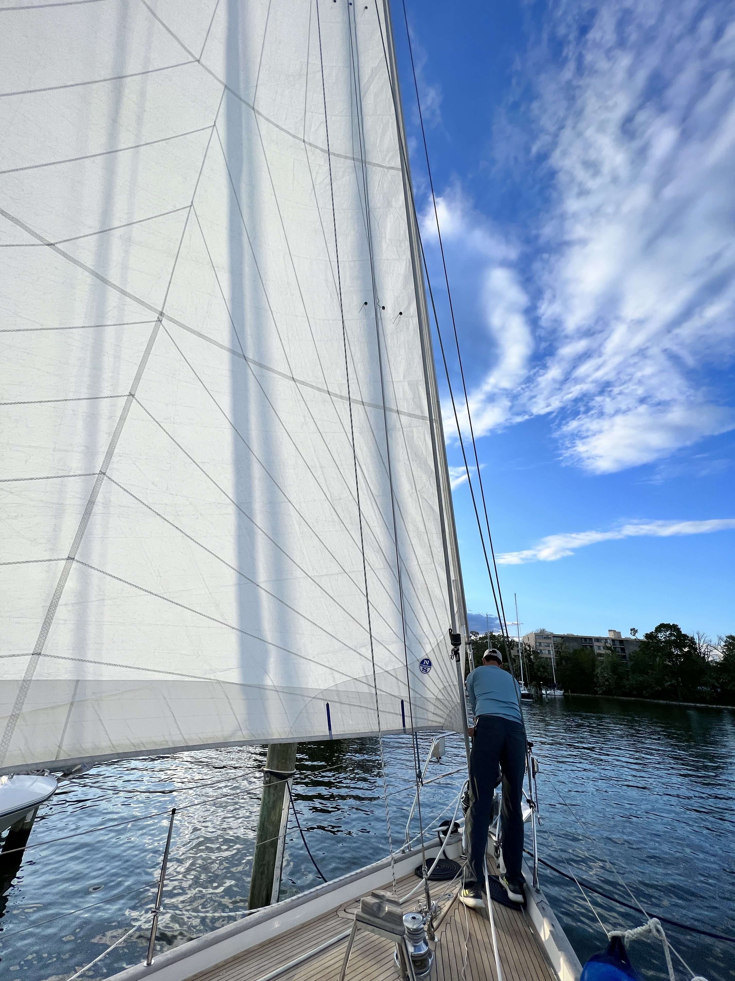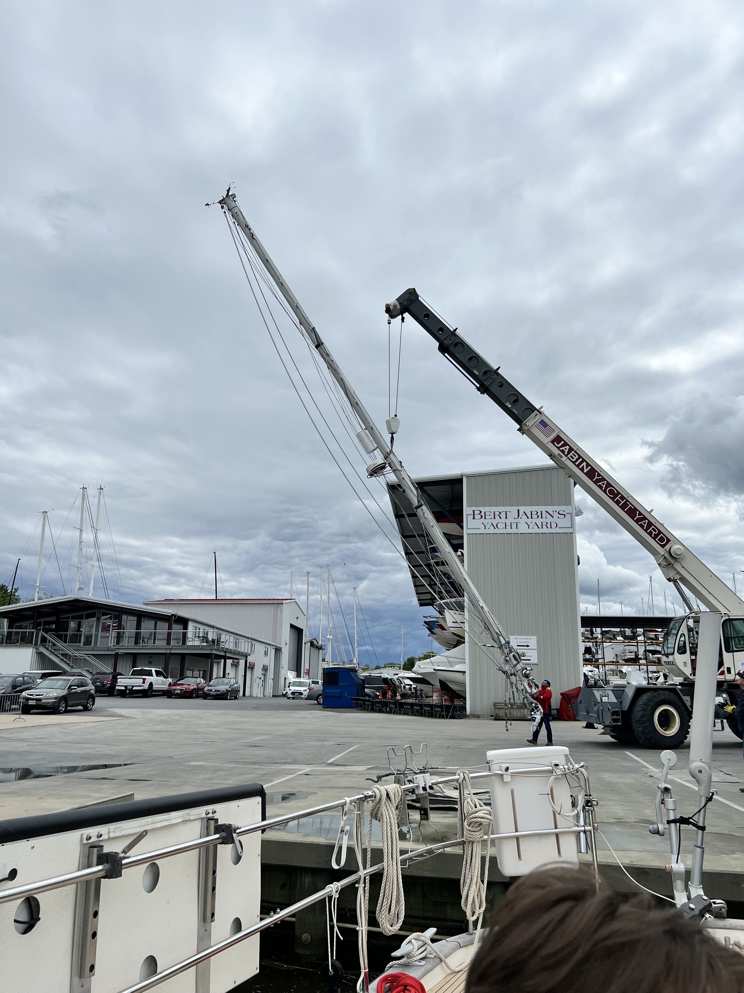 We parked the boat and let the professionals at BJYY do their magic. The Rigging Company guided the process. As expected, this operation is very well managed. The crew spent a little more time than expected troubleshooting something, which caused us to run out of time in the marina bay where we were parked. That meant that we had to move the boat with the rig partially complete so that we could get the short haul before the crew went home for the evening. I had to live with the notion that the rigging setup and tune would have to be completed after we are back in the water. Since the mast and rigging was secured well, we shoved off and moved the boat a few hundred feet to the lift bay.