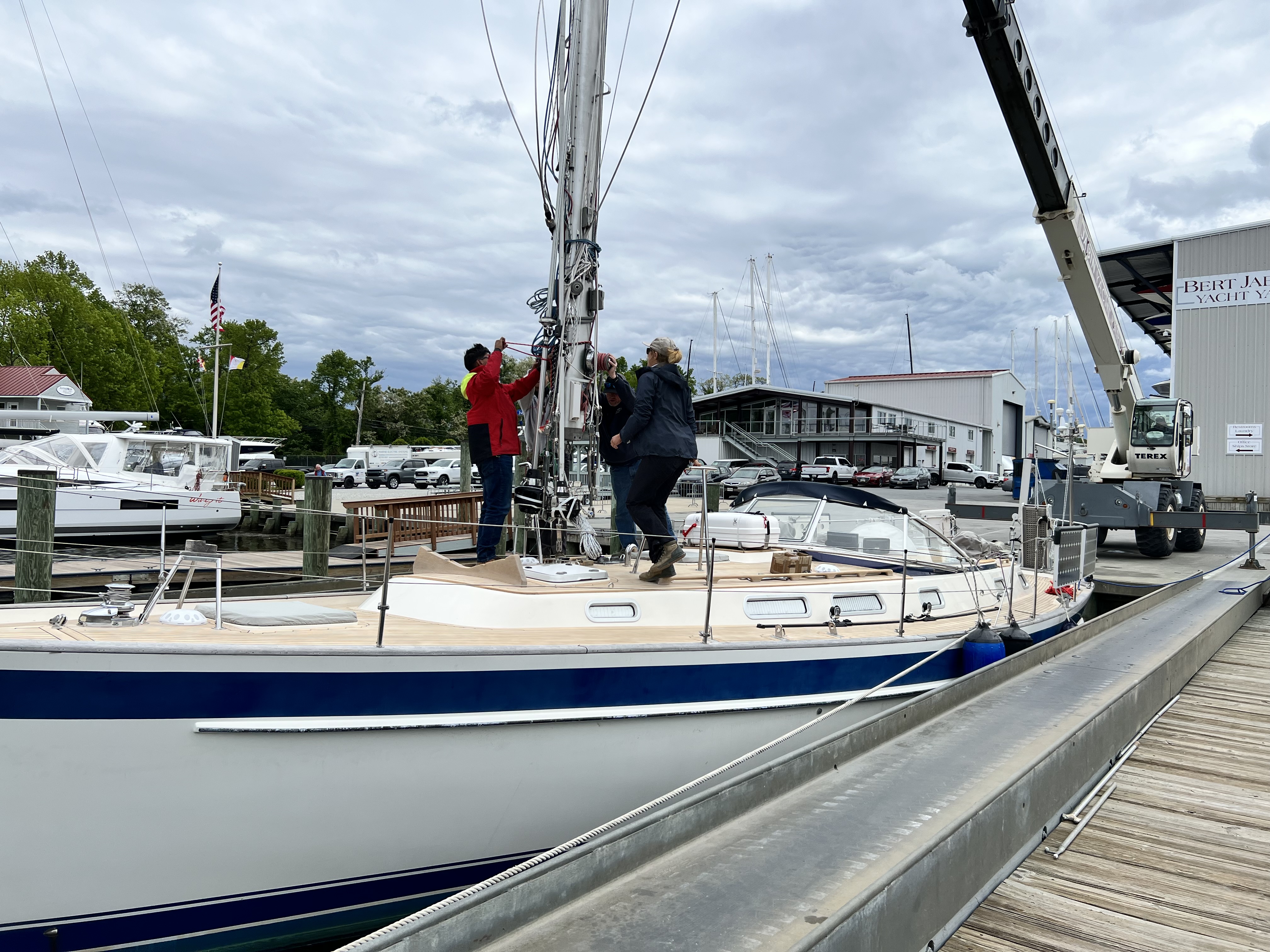 The last couple of weeks has been filled with finishing up Winter refit projects and readying the boat for stepping the mast. We patiently waited a few extra weeks for our mast and rigging to be prepared, and even found time to attend the Spring sailboat show in Annapolis. This was our first time to that show, and we found it quite low key and although there were fewer boats there, we were able to jump on and off of them quickly. That was a great show if you don’t like crowds and long lines.