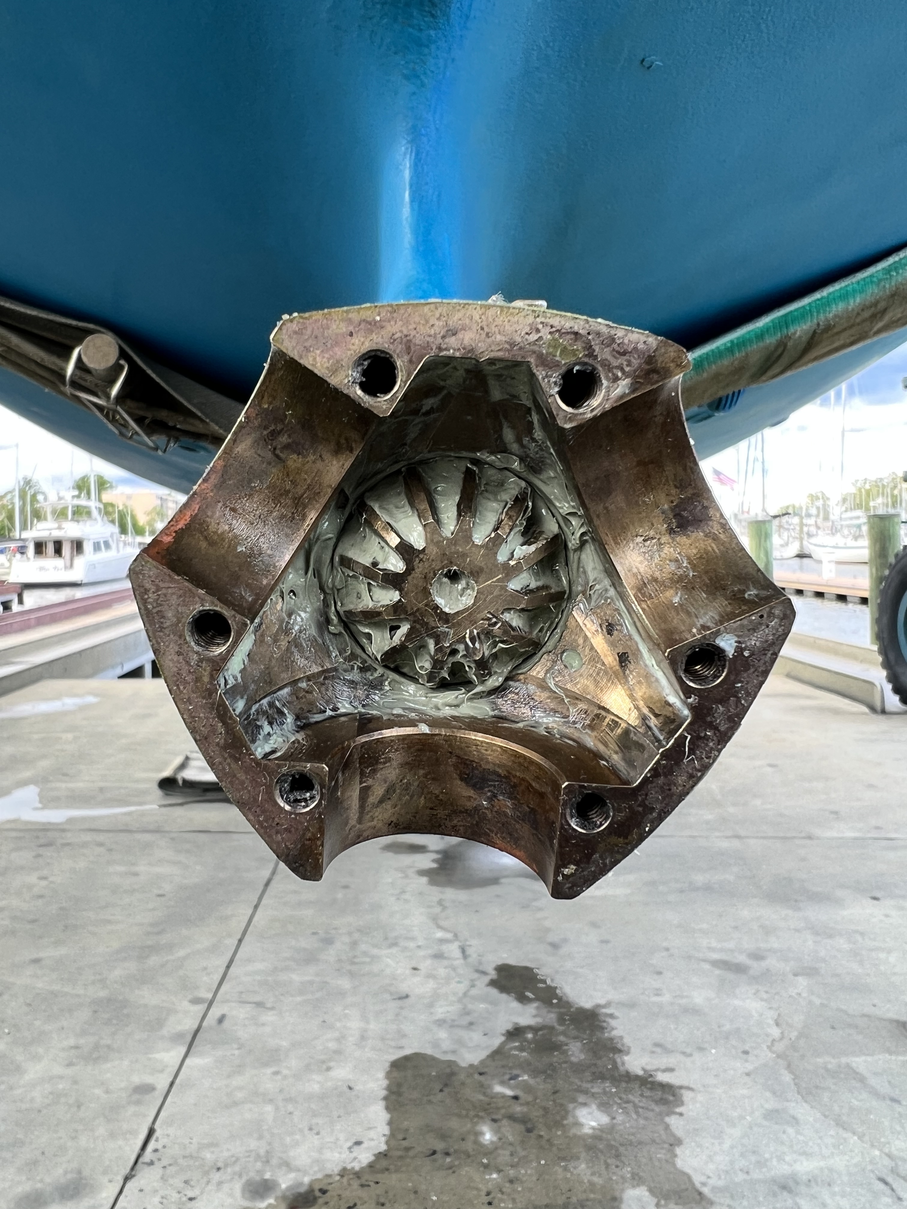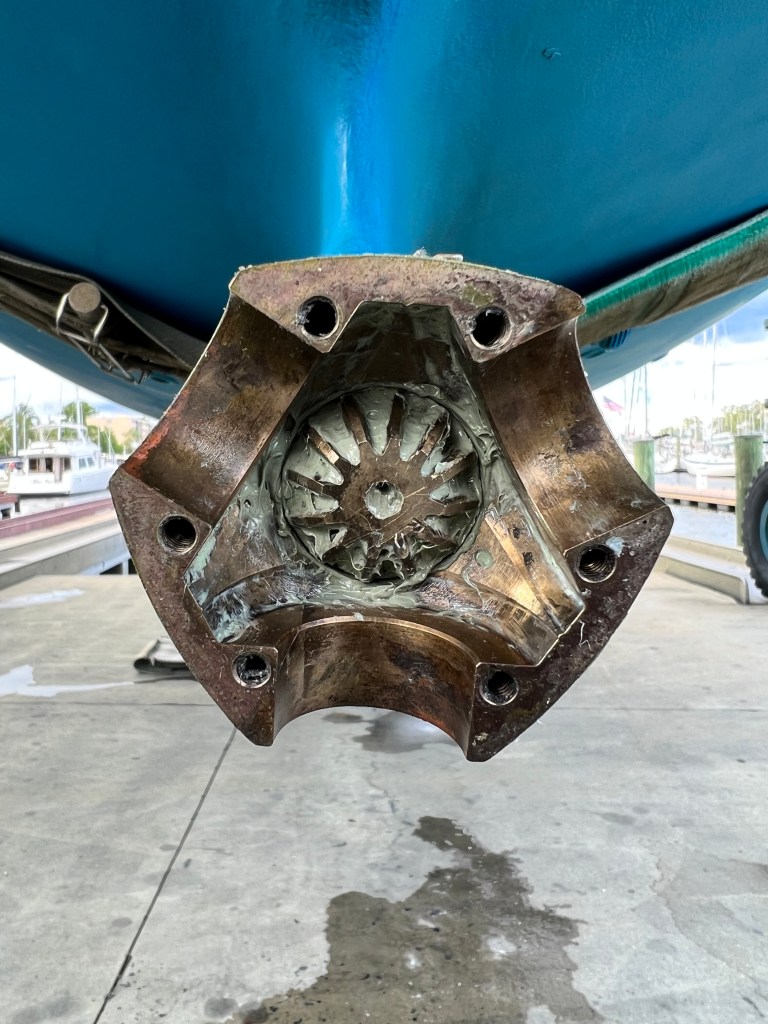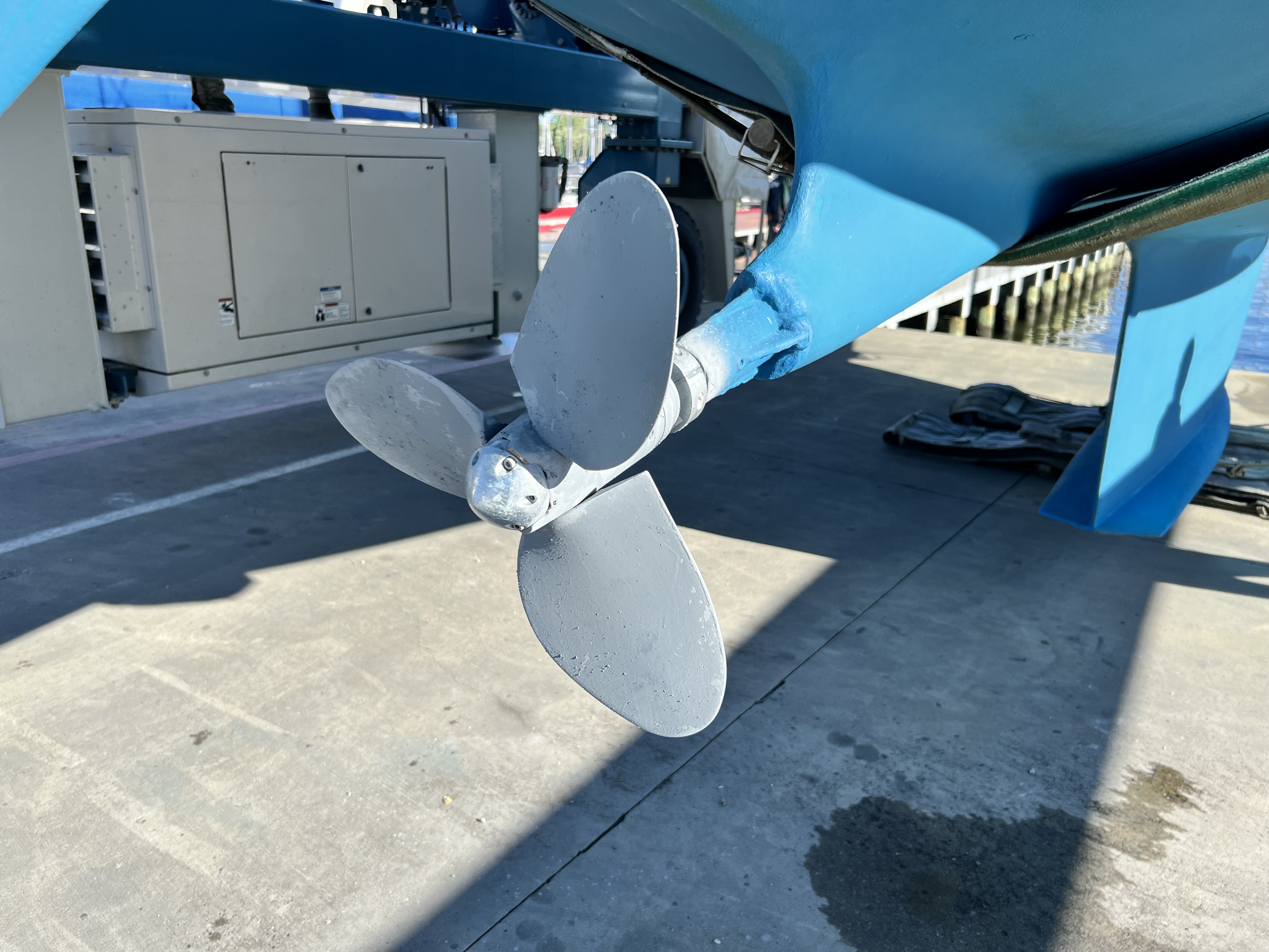 Finally, I make the hasty decision to spray down the propeller with Interlux Interzinc corrosion protection. I would have preferred to remove the prop, grind off all PropSpeed and redo the entire process again, but time was not on my side. BJYY had us back in the water early the next morning, and Skyward’s drive system worked as we had hoped…forward was forward and reverse was reverse.