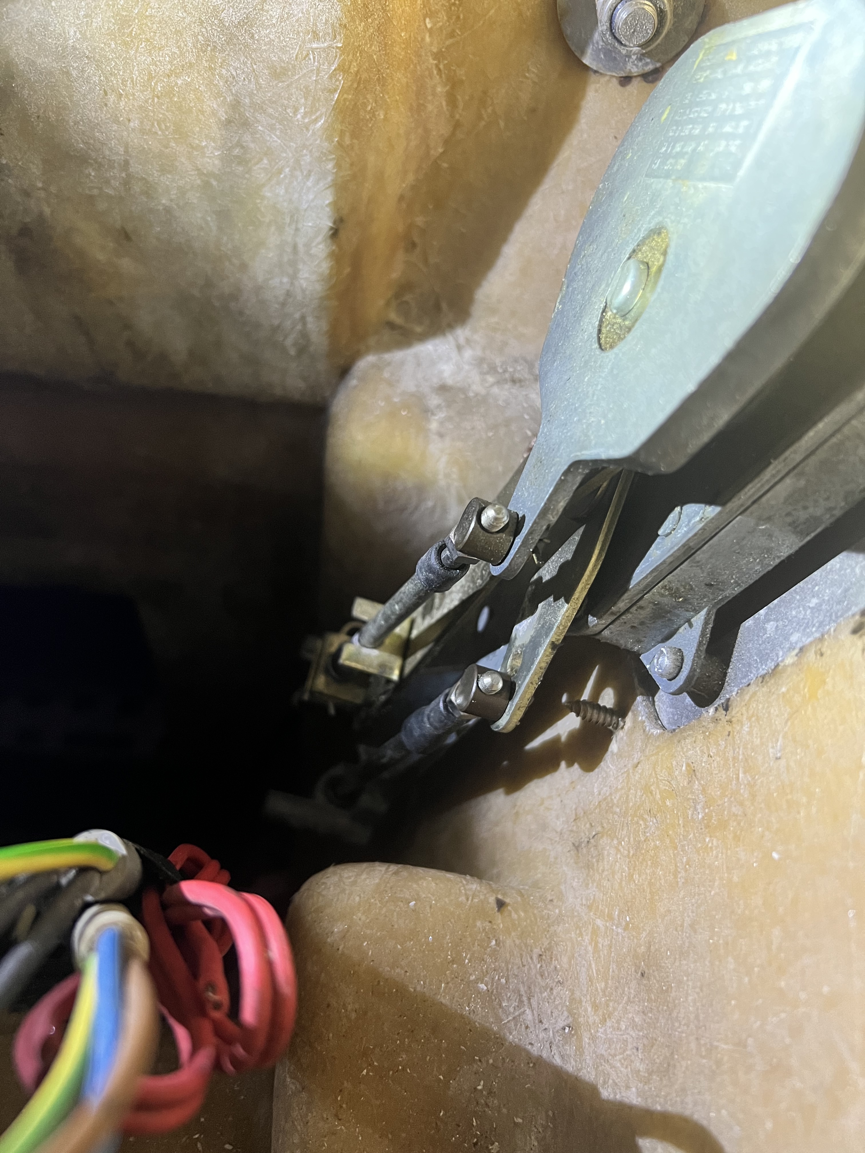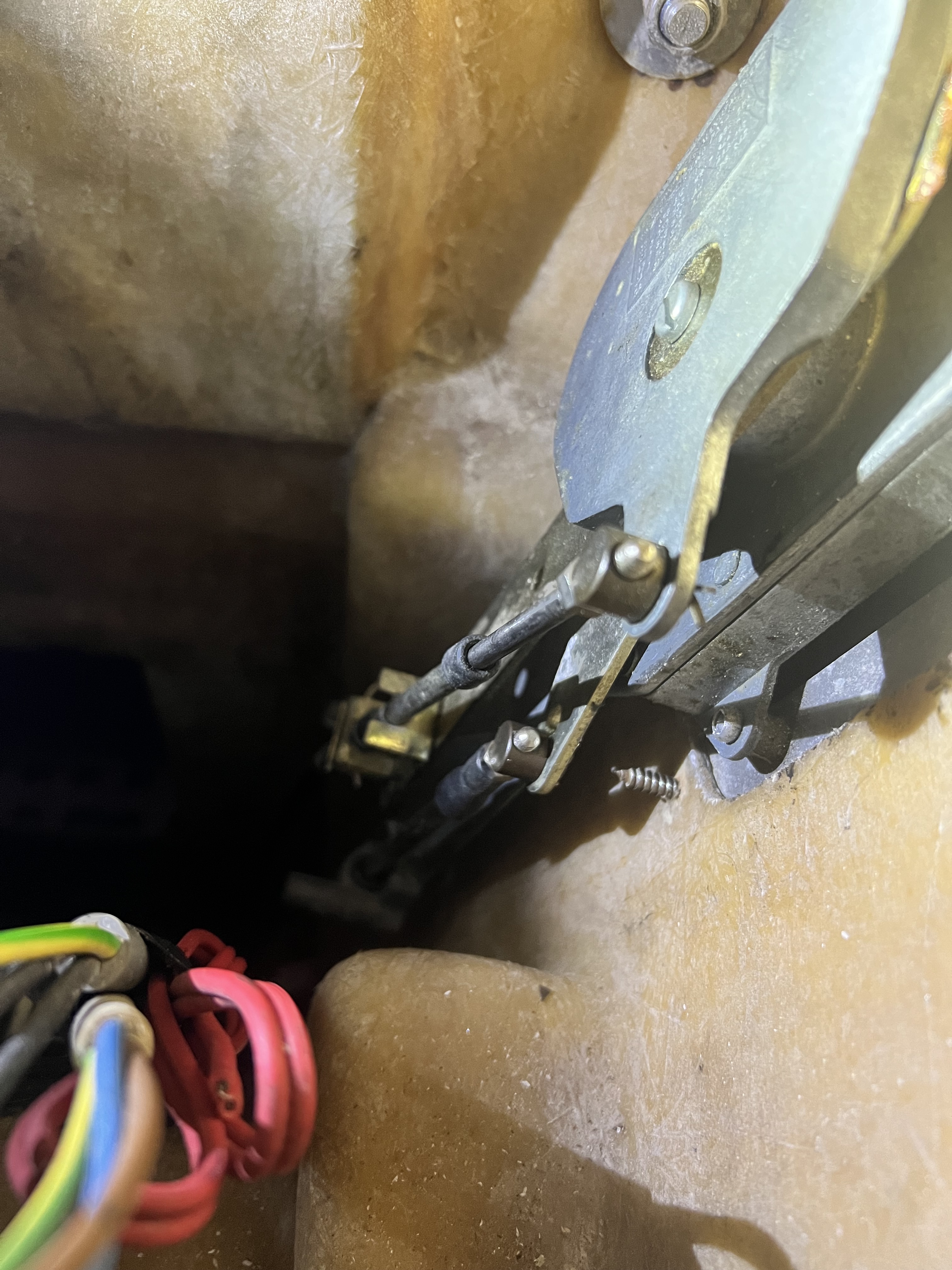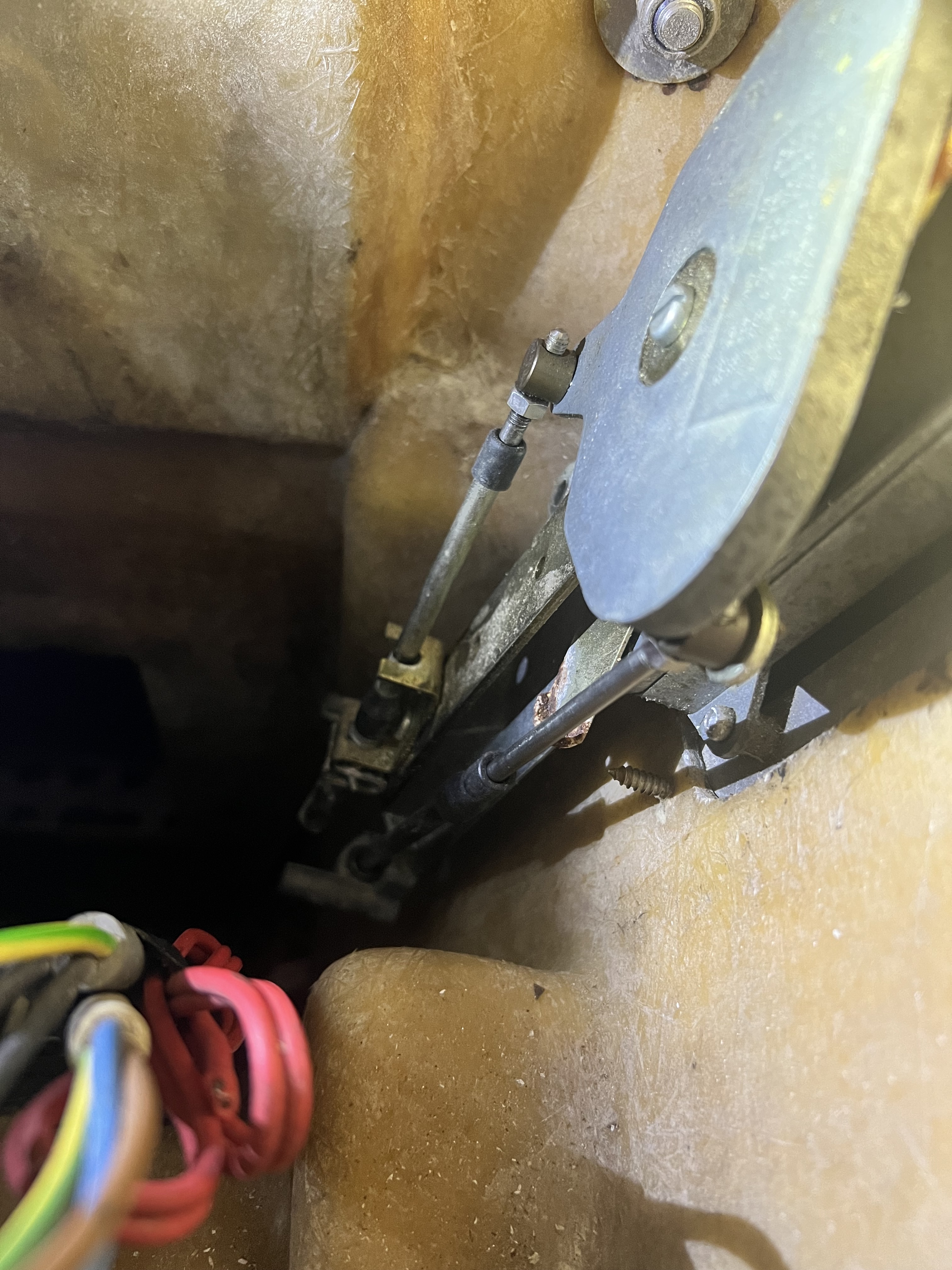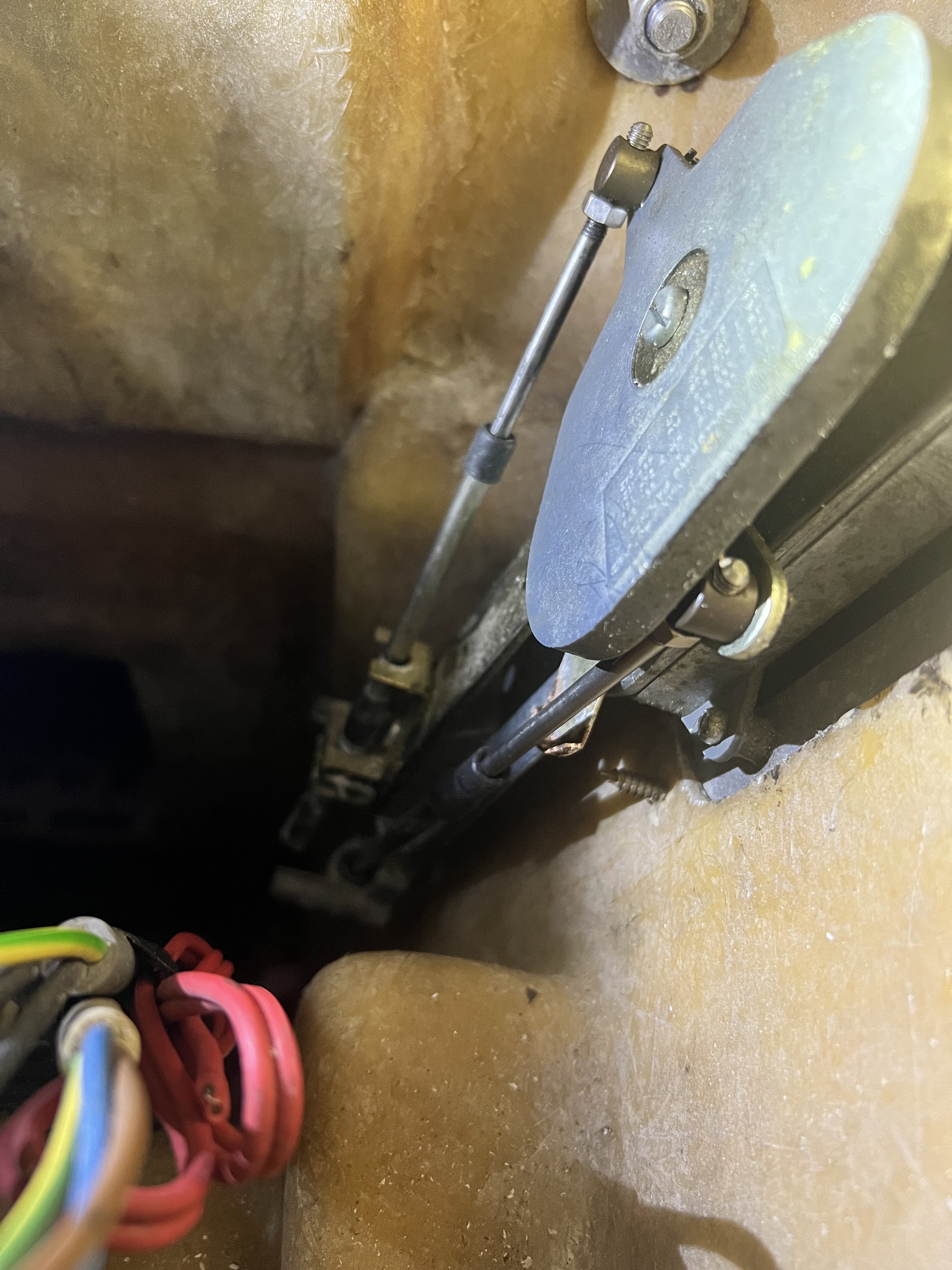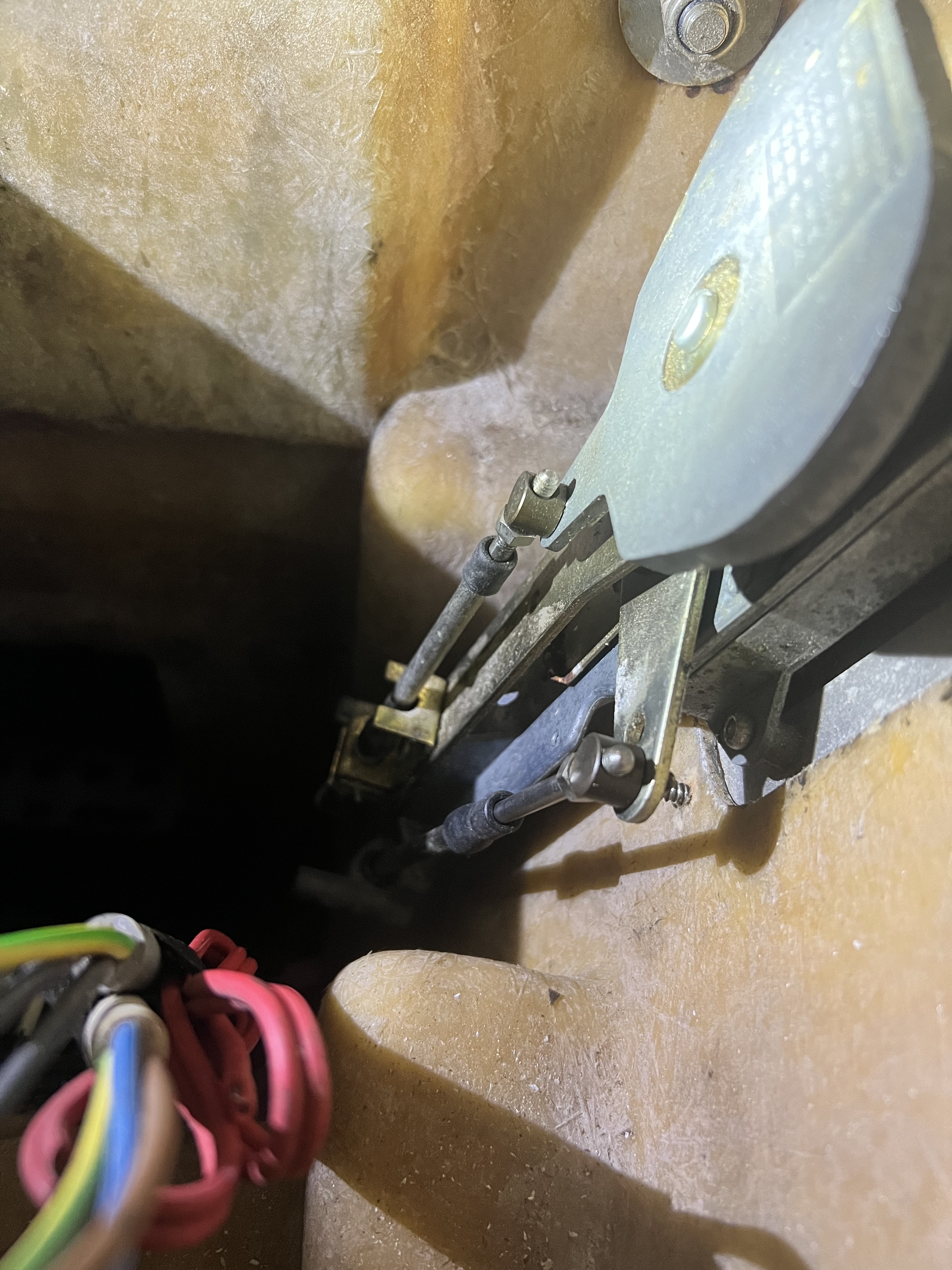 Next step was to reset the throttle cabling at the helm. Once we figured out that the prop was installed with the incorrect rotation last year, Ray reversed the gear shift cable as a temporary fix. I can do that on Skyward because my gearbox has the same ratio (1.96) in forward and reverse. After about 30 minutes, the cabling is returned to normal.
