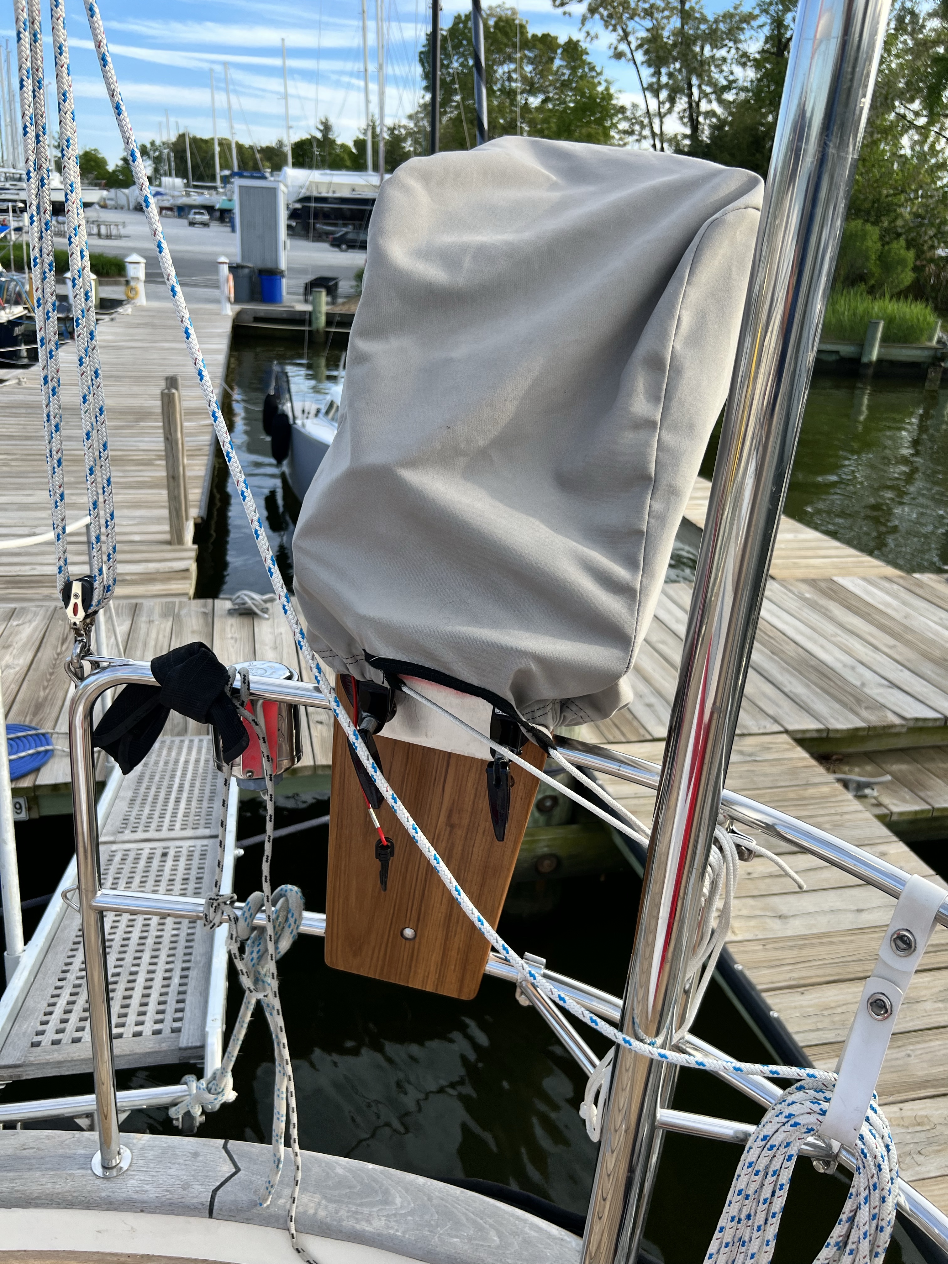 Installed a new teak dinghy motor stand topped with a sheath of stainless steel (thank you, Ray!)