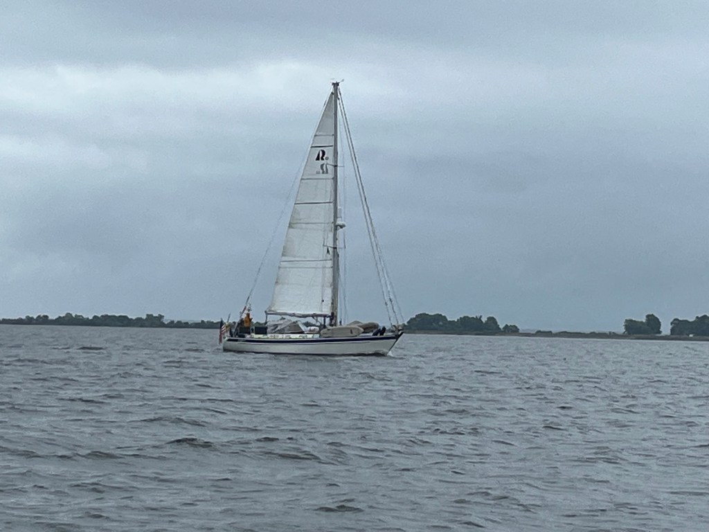 We all separated and went on our way by mid-morning. The anchor and chain was packed full of mud, which took a while to clean off. But a nice shiny Ultra cleans off easily. We motor sailed back out of Lloyd Creek, out of the Wye River and through the Eastern Bay. We caught up to Delfin and they got a great picture of us underway in a moist on/off drizzle of rain.