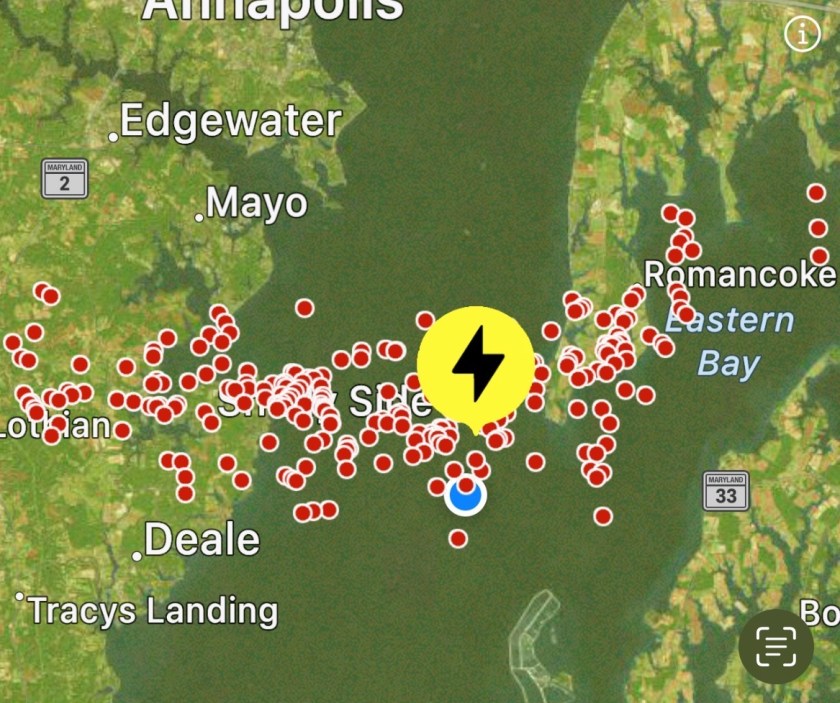 Our strategy was to circle back South until the lightning band passed by. In the midst of all of this commotion, uncertainty, and wetness, I was still grilling hamburgers! After what seemed like an eternity, we navigated West towards Thomas Shoal Lighthouse and the lightning stopped and rain slowed down. What a surprise we had when we spotted our dock neighbors coming out of the fog from the South, which was a strange coincidence as they were coming up from their trip to Cambridge, MD.
