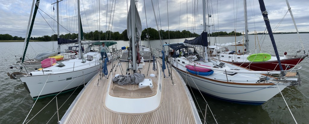 Soon, the raft up was 5 boats: A Pearson, Beneteau, Hallberg-Rassy, Tartan and a Hickley. Our drone did not safet the video, but the pictures tell it all. The anchor held strong all night and we had a great time on the dinghies, paddle boards, exploring and hanging out on each others’ boats.